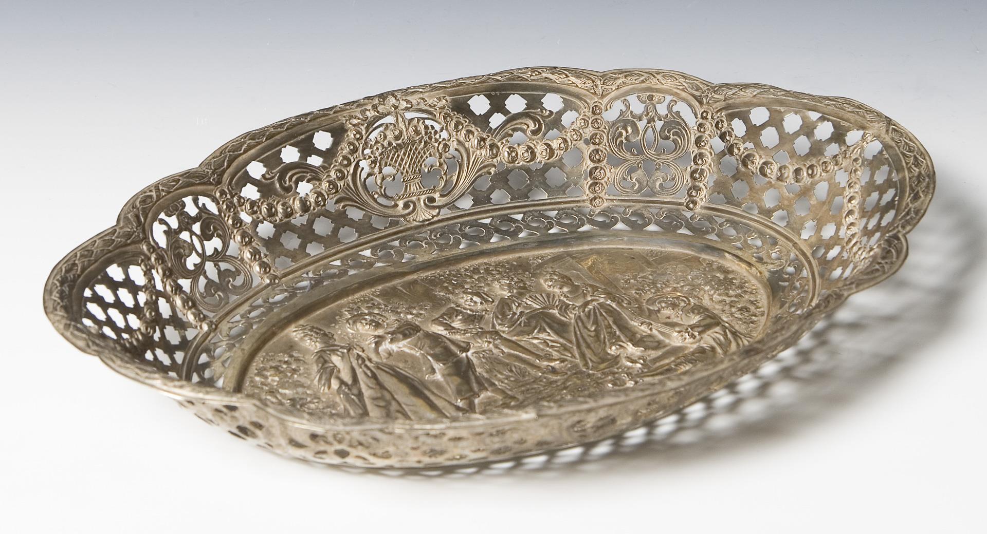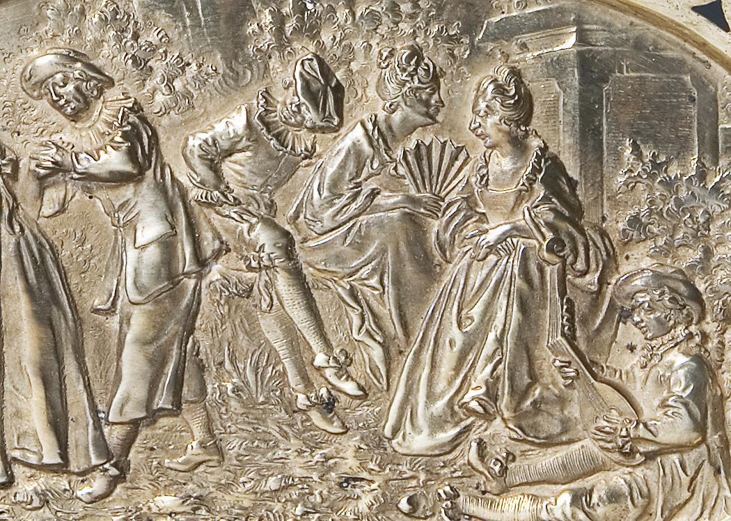 Reliefiert, durchbrochen gearbeitet, im Spiegel elegante Genreszene mit Kavalieren und Damen im Park, Wandung mit Rosen-Festons. Punzen: Halbmond und Krone, Feingehalt, Manufakturmarke. Rückseitig am Rand zwei kleine Lötstellen, zwei Risse im Rand.