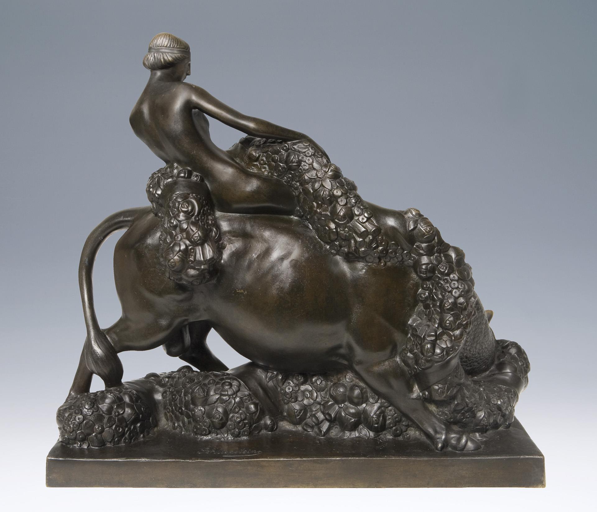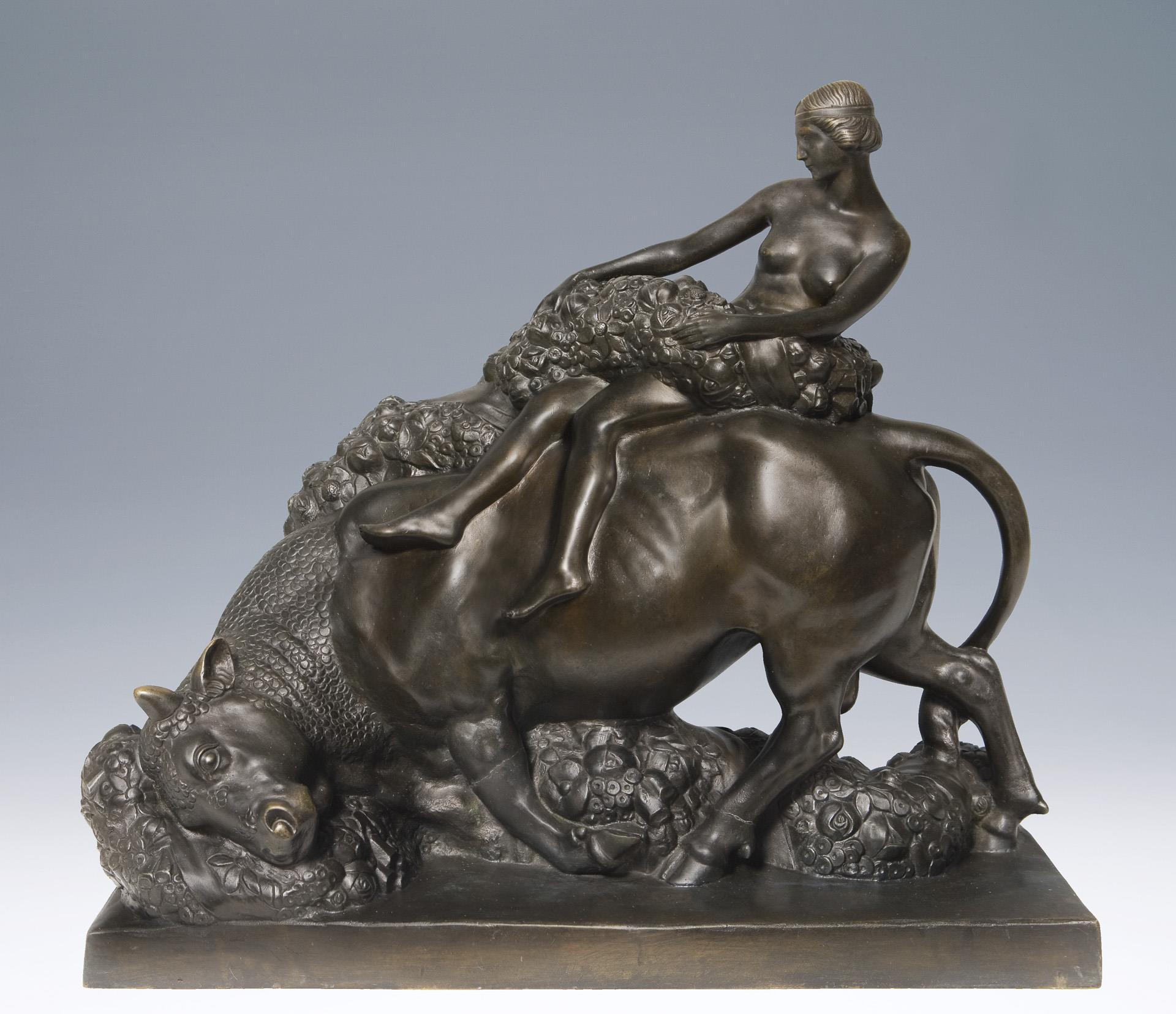 Rückseitig bezeichnet: Schliepstein. Ausdrucksstarke Darstellung der beliebten Episode aus der griechischen Mythologie. Zeus verliebte sich in die Königstochter Europa und verwandelte sich in einen Stier, um sie zu entführen. Patina minimal berieben, in zwei Stier-Beinen je ein Riss.
