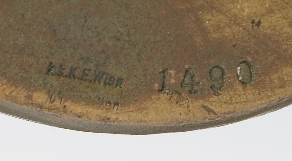 Frontal Künstler-Signet, Gießerstempel: k.k.K.E. Wien (kaiserlich-königliche Kunst-Erzgießerei), nummeriert: 1490.