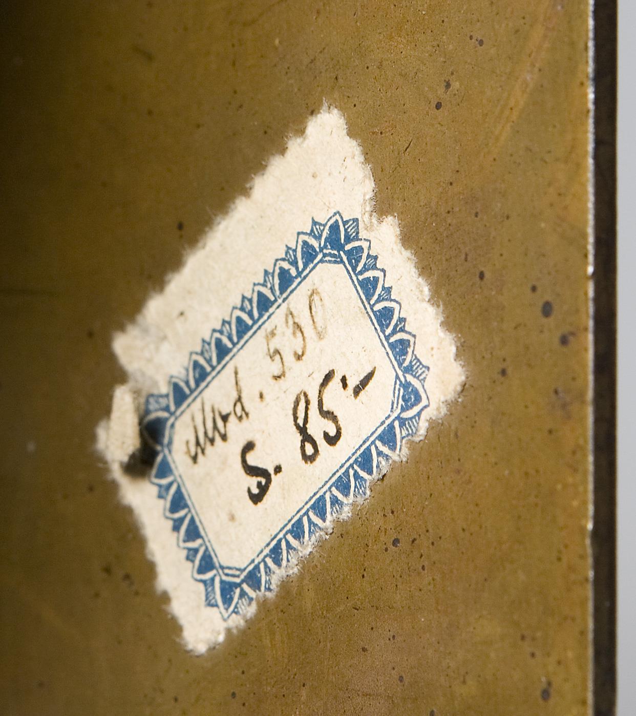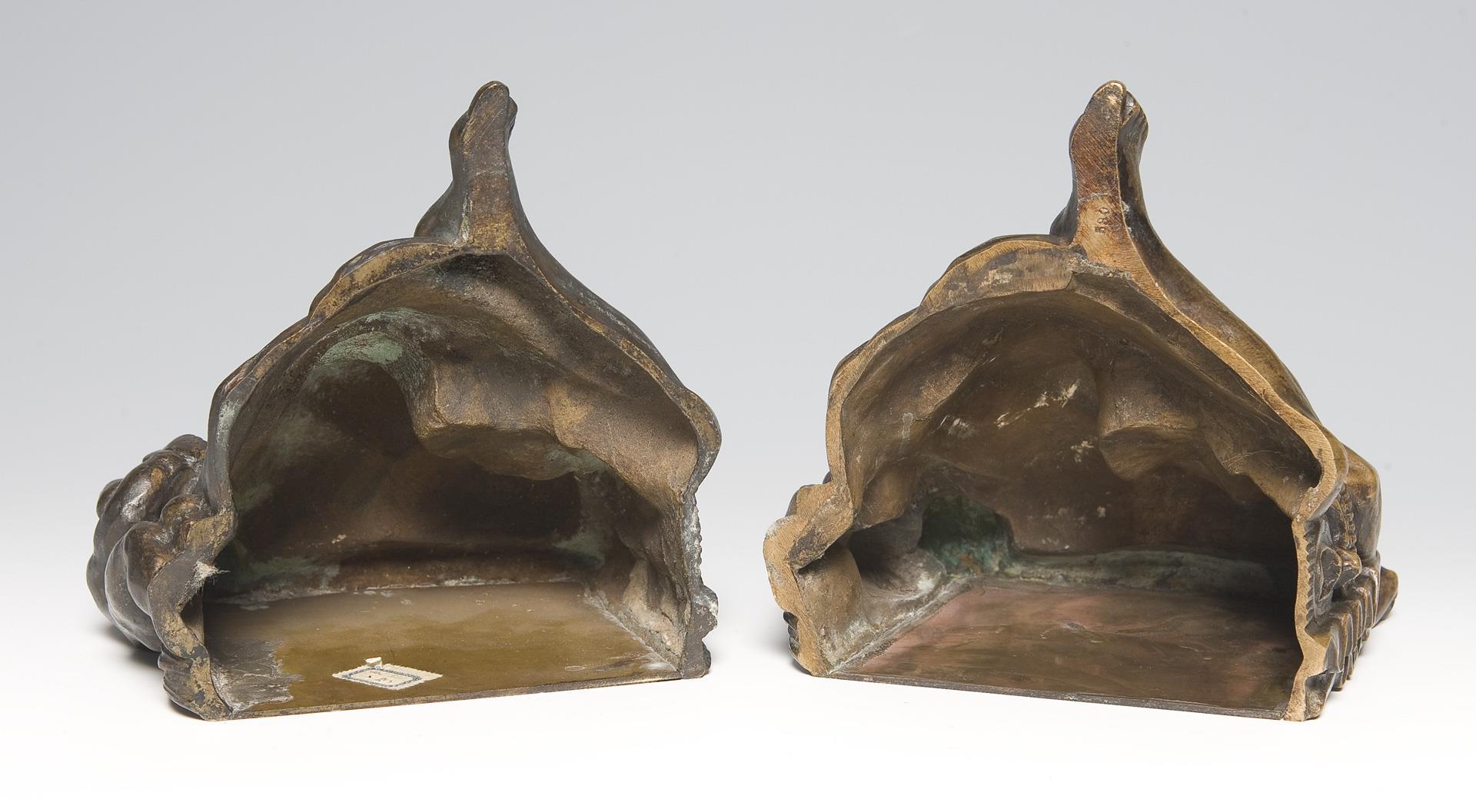 Rückwände eingelötet, eine Buchstütze mit Künstler-Signet und nummeriertem Klebezettel: Mod. 530, eine Stütze mit eingeschlagenen Nummerierungen: innen 505, außen am Boden 530.