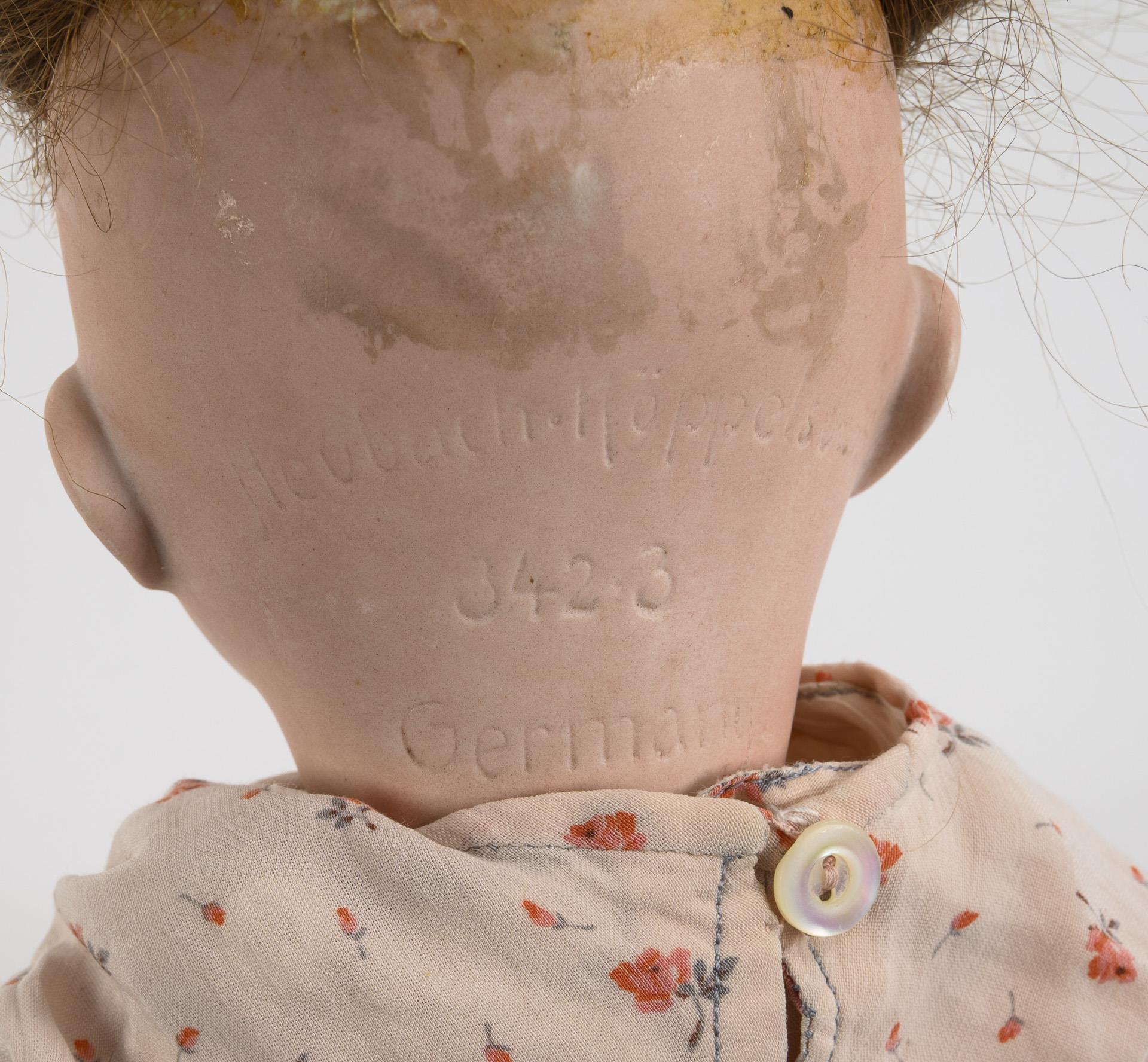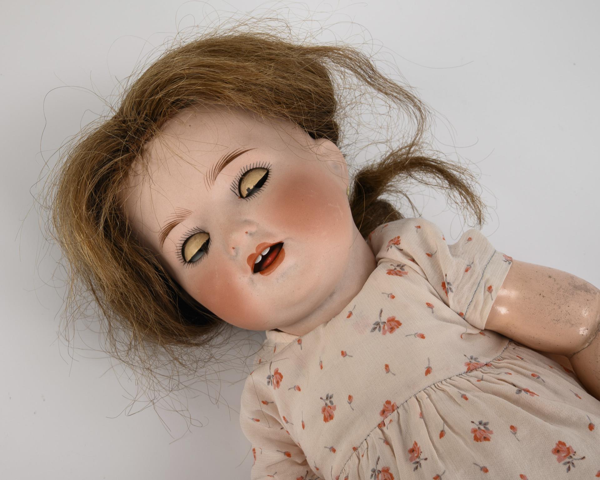 Kurbelkopf, braune Schlaf-/Schelmenaugen, bewegliche Zunge, hellbraune Mohairperücke. 5-teiliger Sitzbabykörper mit intakter Stimme, rosa Kleidchen mit Blumendruck. Kopf durchleuchtet: ohne Defekte, Körper mit Bereibungen.