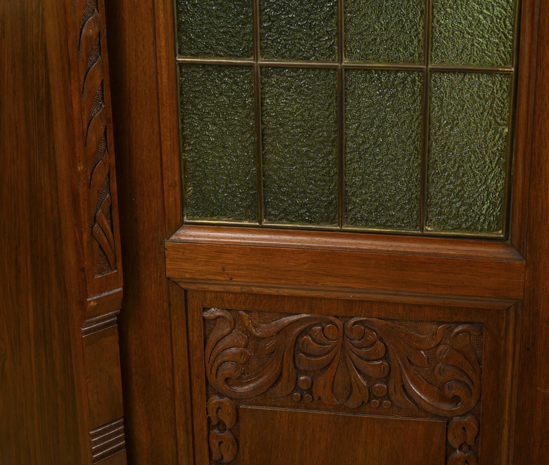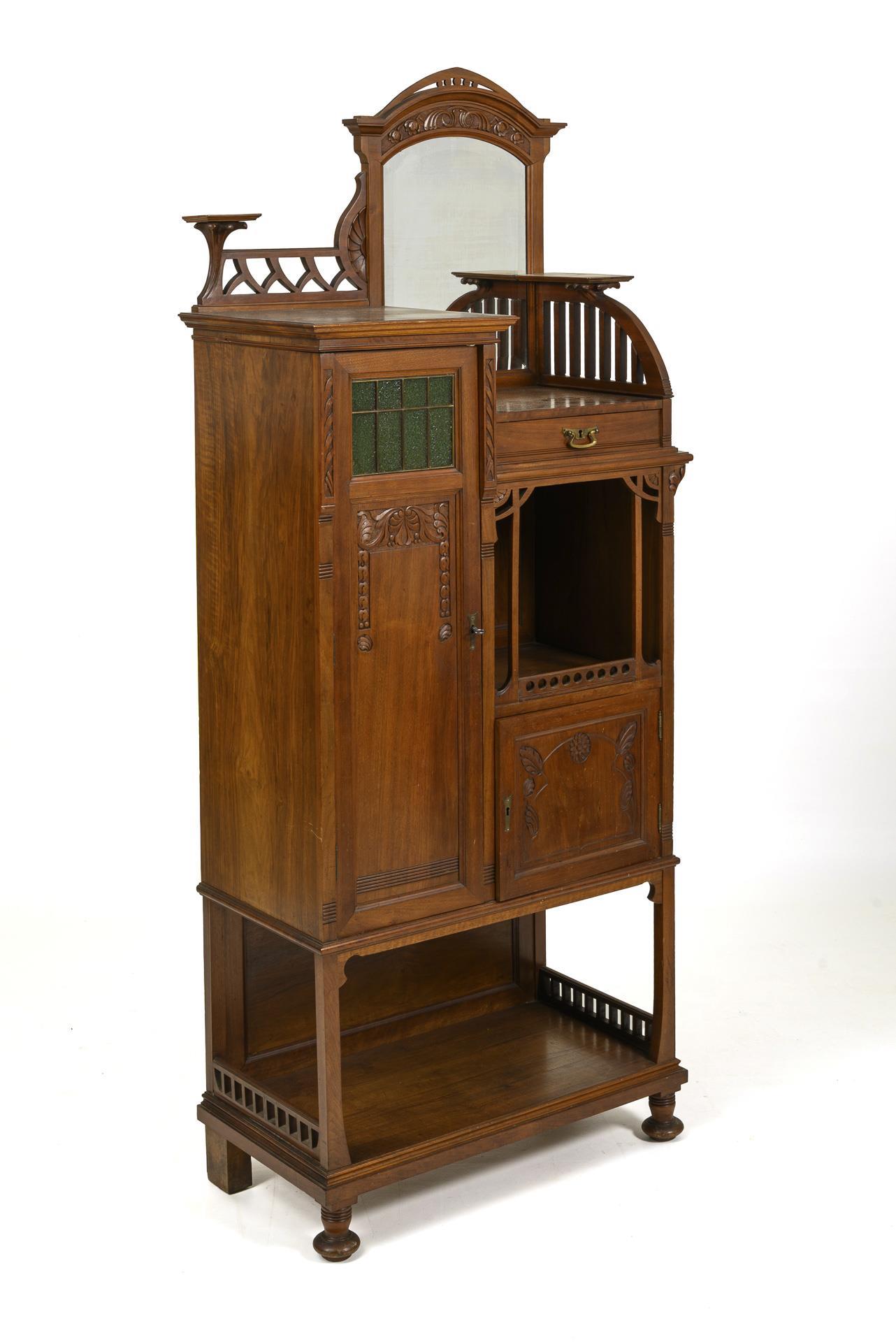 Eleganter Zierschrank wohl aus einem Damensalon der Belle Époque. Getreppt gestufter Korpus mit einem bekrönenden Spiegel und 2 kleinen, seitlichen oberen Ablageflächen, höhendifferenten Fächern mit 2 Türen, 1 Kopfschub, 1 offenem Mittelfach und 1 offenem Sockelfach, auf 2 Drechsel- und 2 Klotzfüßen. Florale Reliefschnitzereien, Kerbschnitt, Profilkanten, bogenförmige und perforierte Zierleisten und Geländer, facettiertes Spiegelglas und 1 Tür mit messingverstrebtem, grünem Glas mit strukturierter Oberfläche. Stiltypische Schlüssellochbeschläge aus Messing, 1x mit Bügelgriff. Innen 3 Einlegeböden. Leichte Alters- und Gebrauchsspuren, teils defekte Profilleisten.