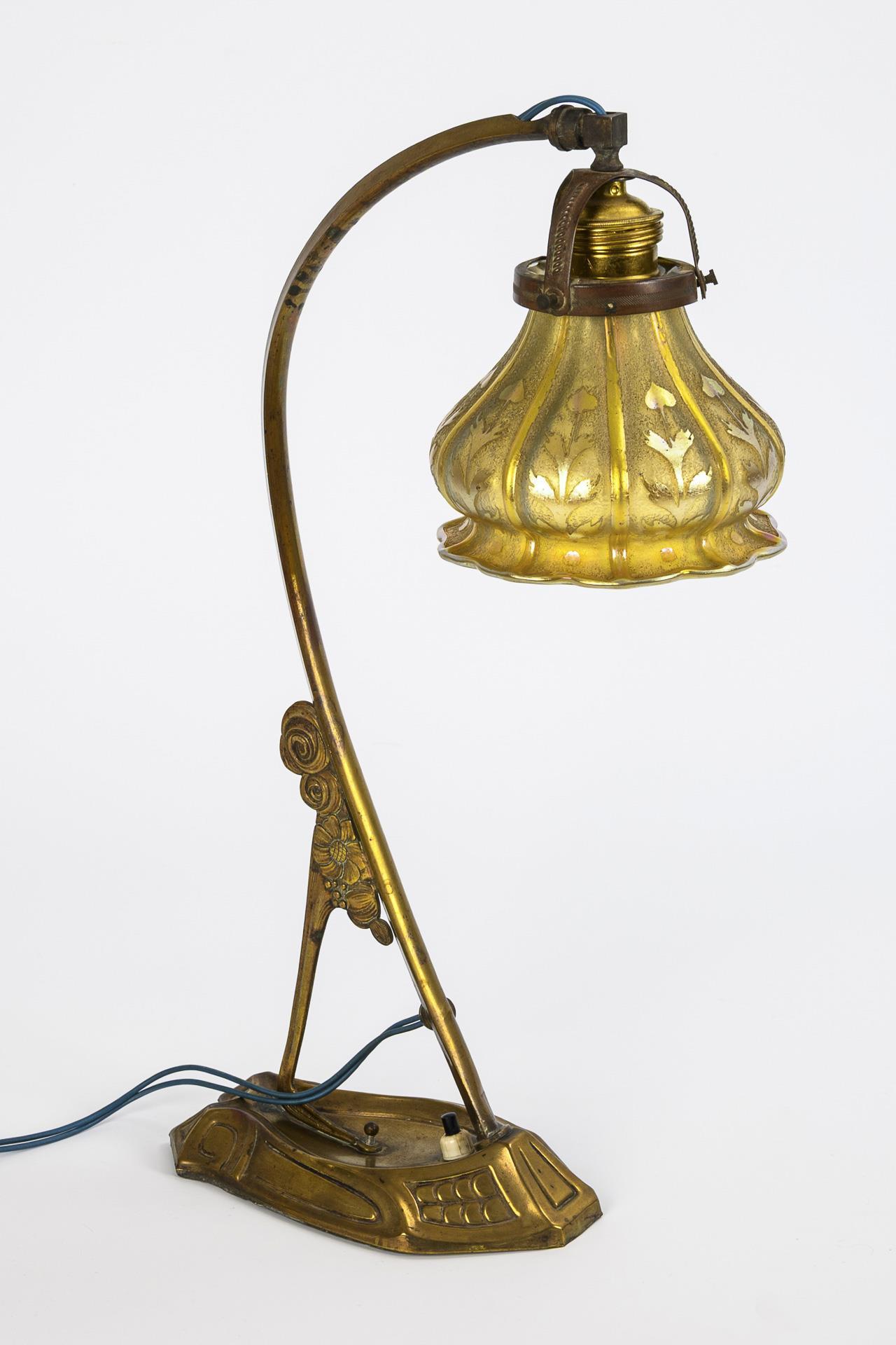 Messing, farbiges Irisglas mit mattgeätztem Dekor. Alte Elektrifizierung mit Schraubfassung und Druckschalter am Fuß. H 43 cm, Ø Schirm 13 cm. 1560 g.