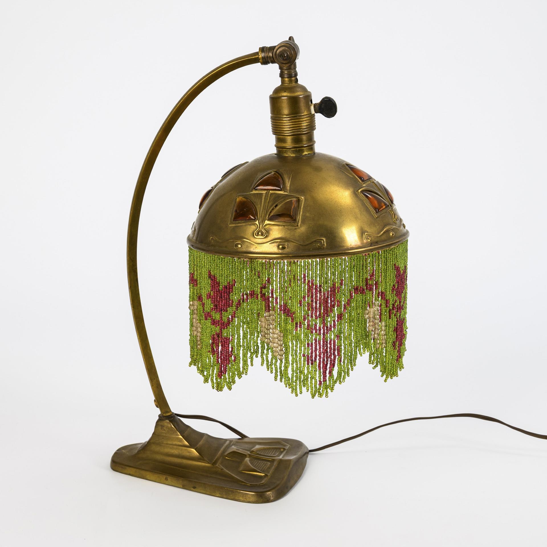 Ein polygonaler, beschwerter Fuß trägt einen Bogenarm, der zu einem halbkugelförmigen Messingschirm mit gelblich-braunen Cabochons führt, dessen Rand mit einem floral gemusterten Glasperlenkettenbehang geziert ist. Ein Cabochon ersetzt, kleinere Dellen. Funktion nicht geprüft.