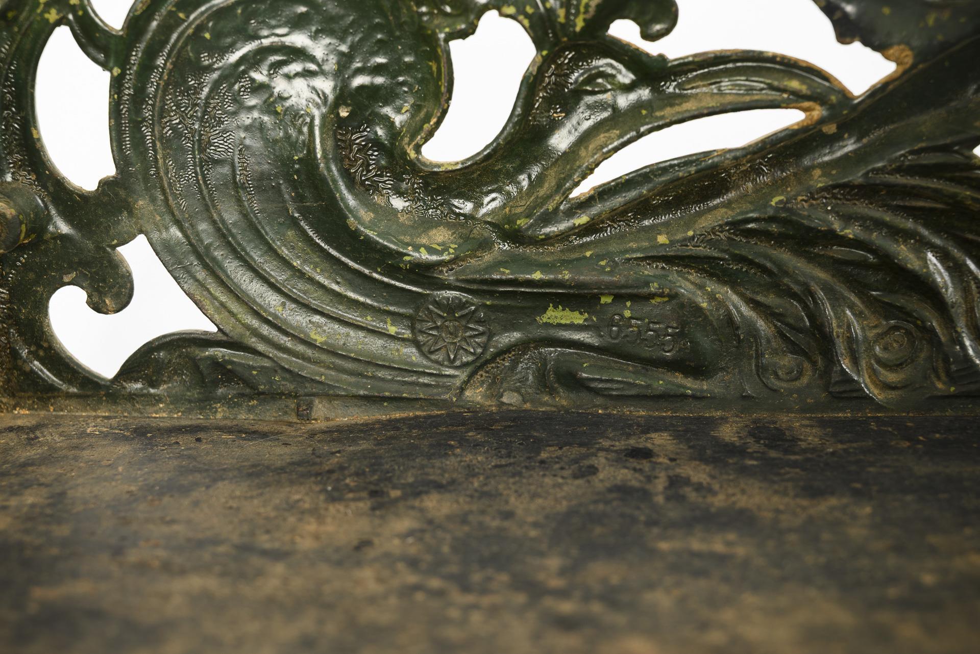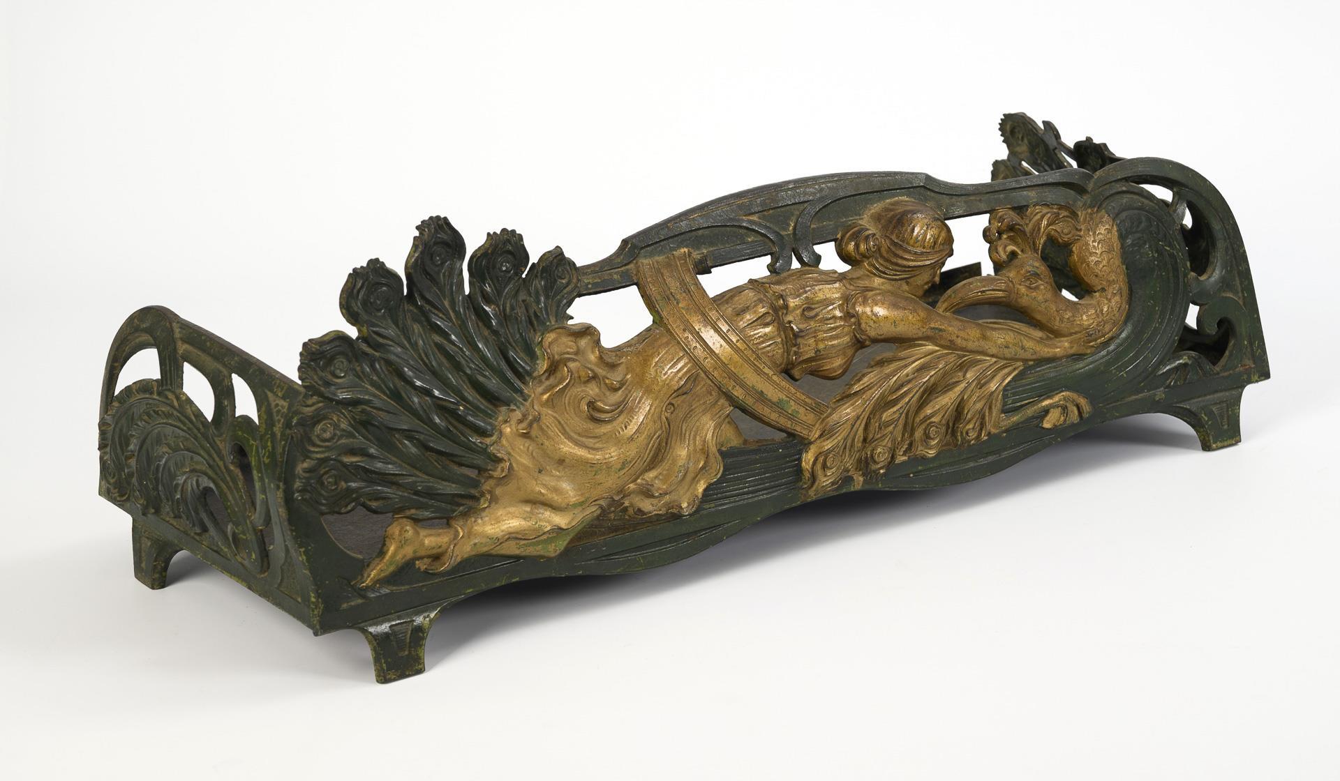 Grünfarbener, durchbrochener Kaminvorsatz zeigt eine Darstellung einer Frau mit Pfau, womöglich die Göttin Hera. Sowohl die Frau als auch der Kopf und einzelne Federn des Pfaus sind goldfarben gefasst. Farbfassung teils abgeplatzt, Bodenblech rückseitig mit kleinerem Riss.