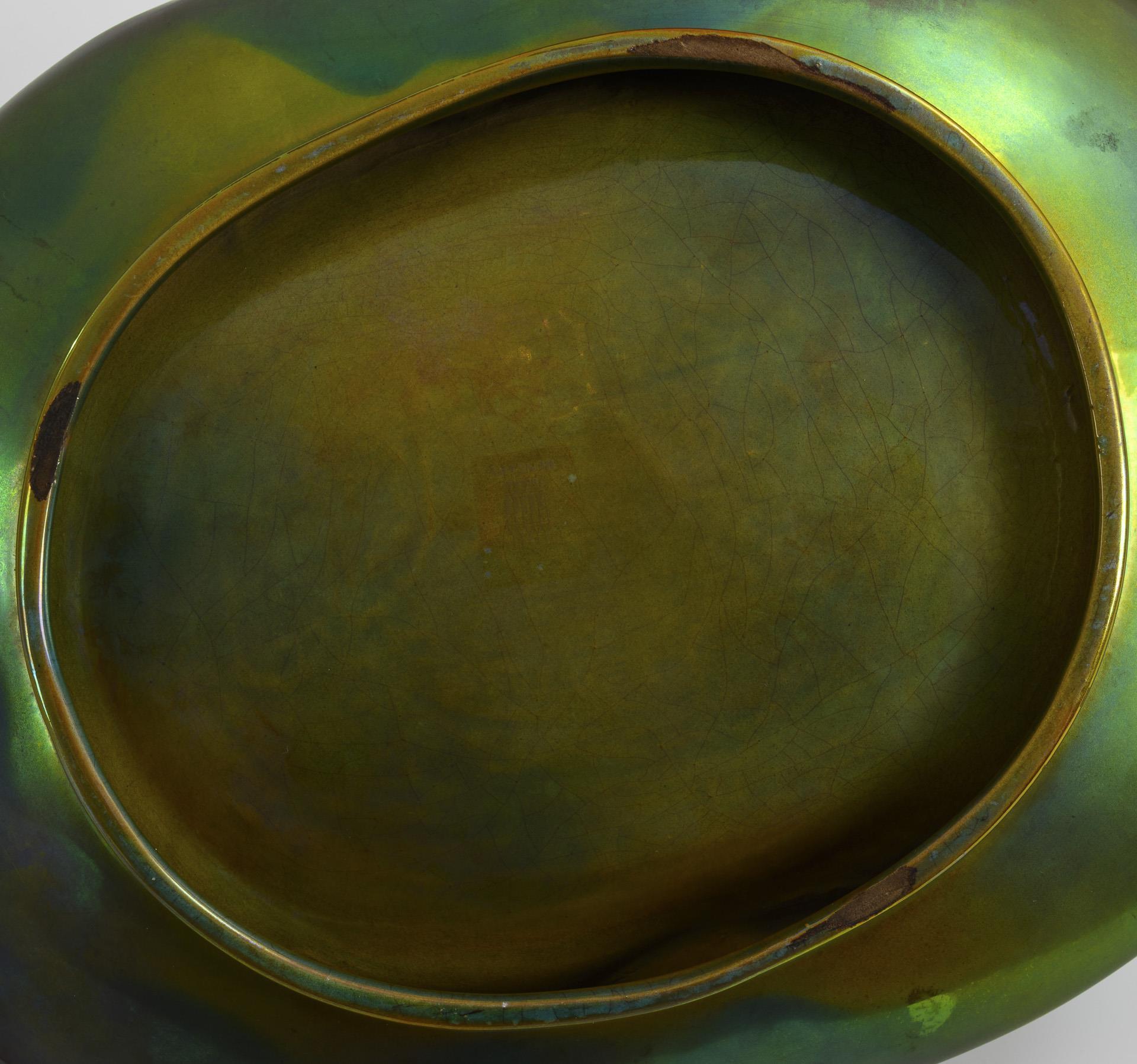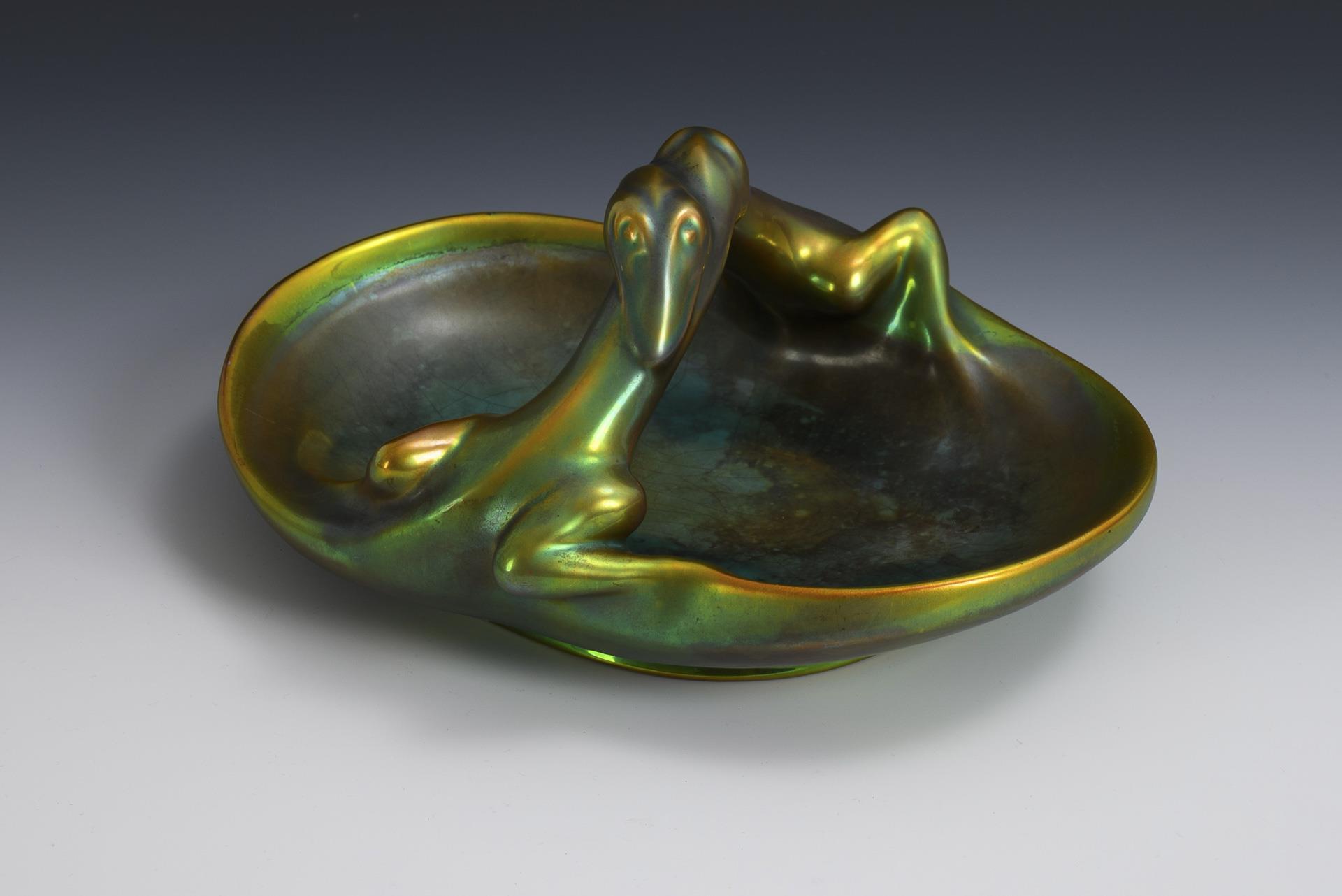 Ovale Schale mit einem Henkel aus 2 miteinander verschlungenen Amphibien. Leichte Gebrauchsspuren.