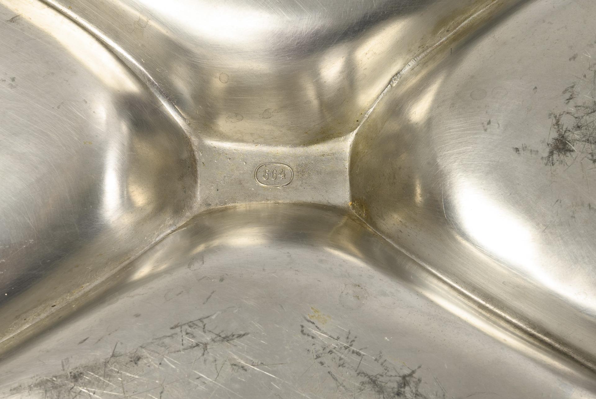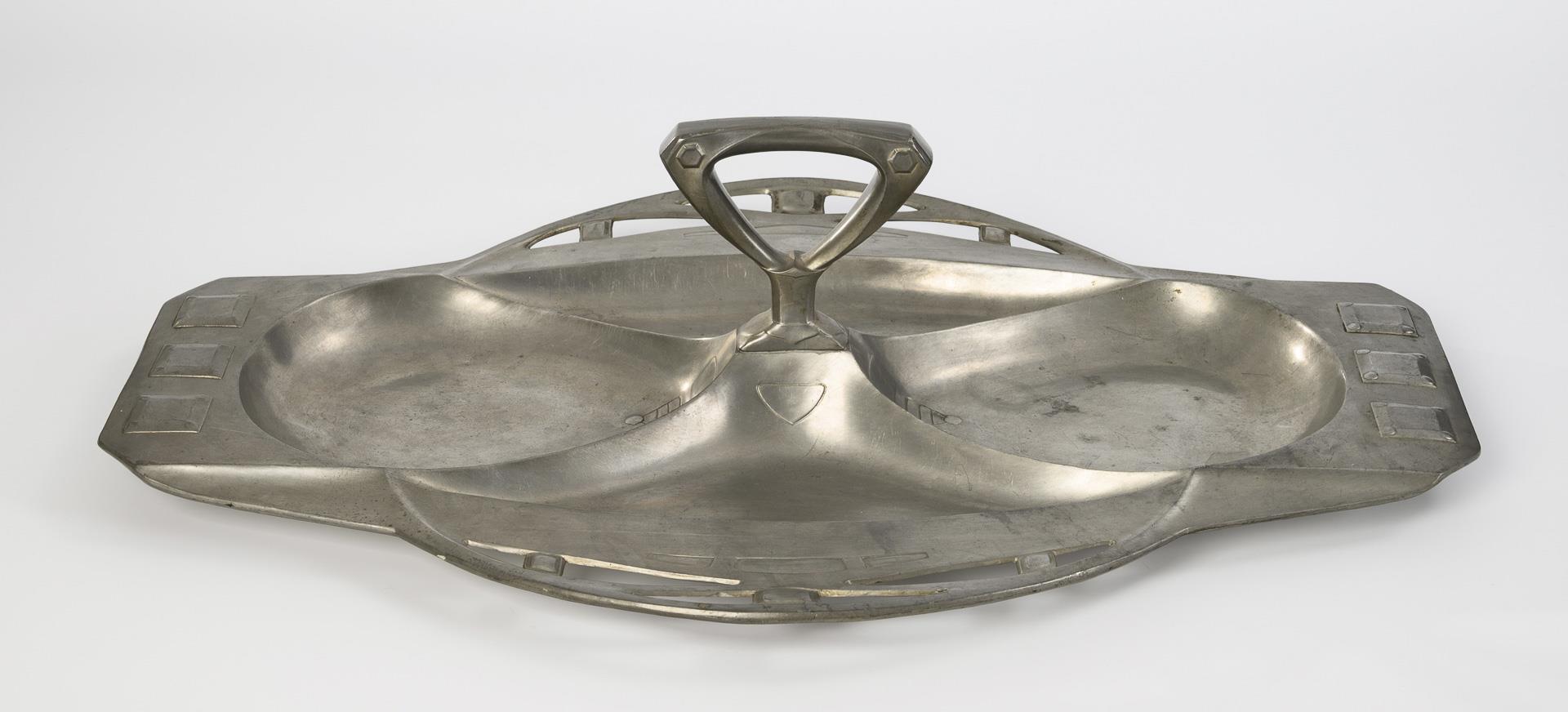 Rechteckige Servierplatte mit vier Sektionen, seitlich angebrachten, verzierten Griffelementen sowie einem zentralen Griff auf der Platte. Leichte Alters- und Gebrauchsspuren.