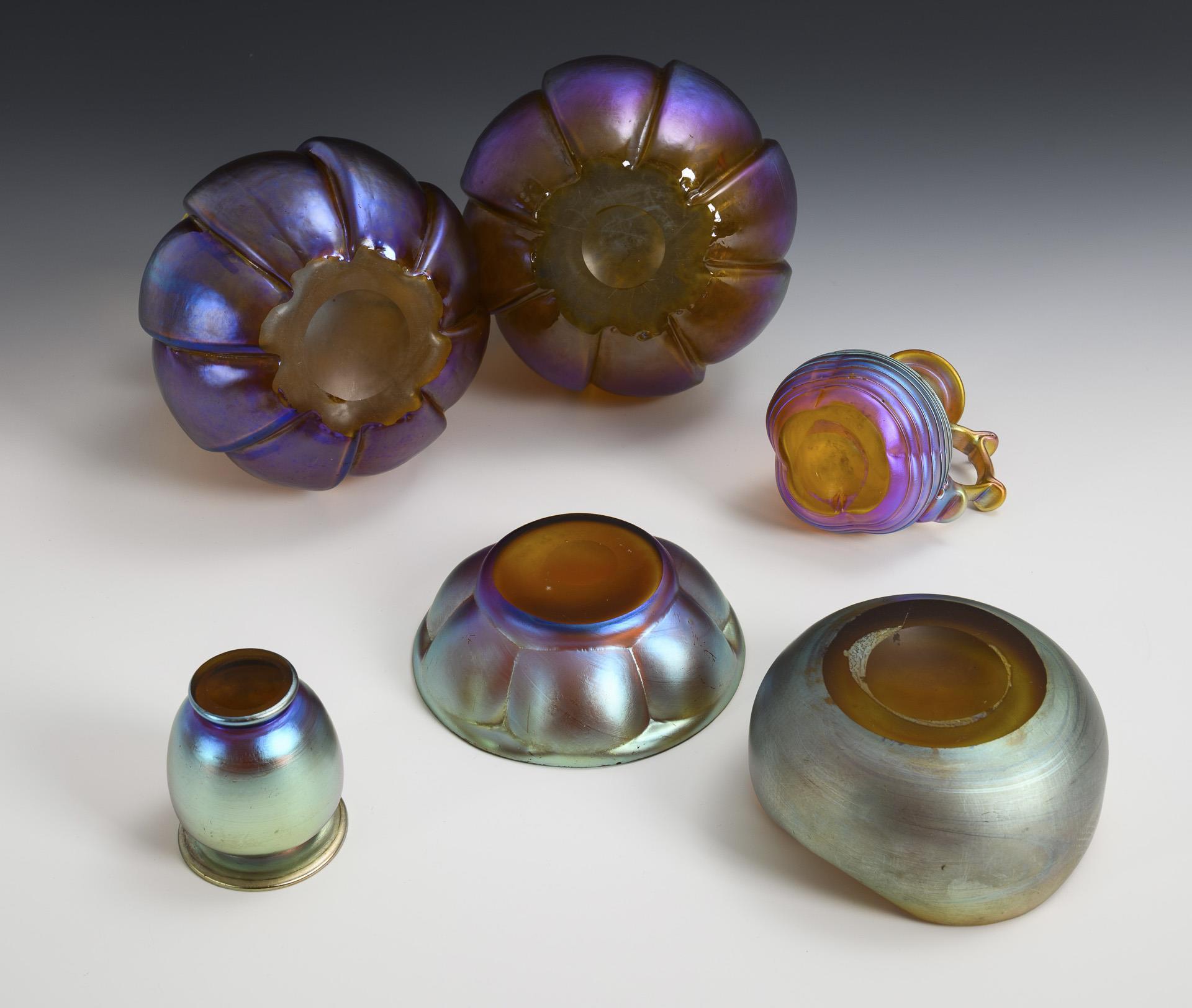 2 Birnvasen (H 15 cm), 1 Balustervase (H 8 cm), 1 Krug (H 11,5 cm), 1 Schale (Ø 14 cm) und 1 Zigarrenascher (Ø 13,5 cm).