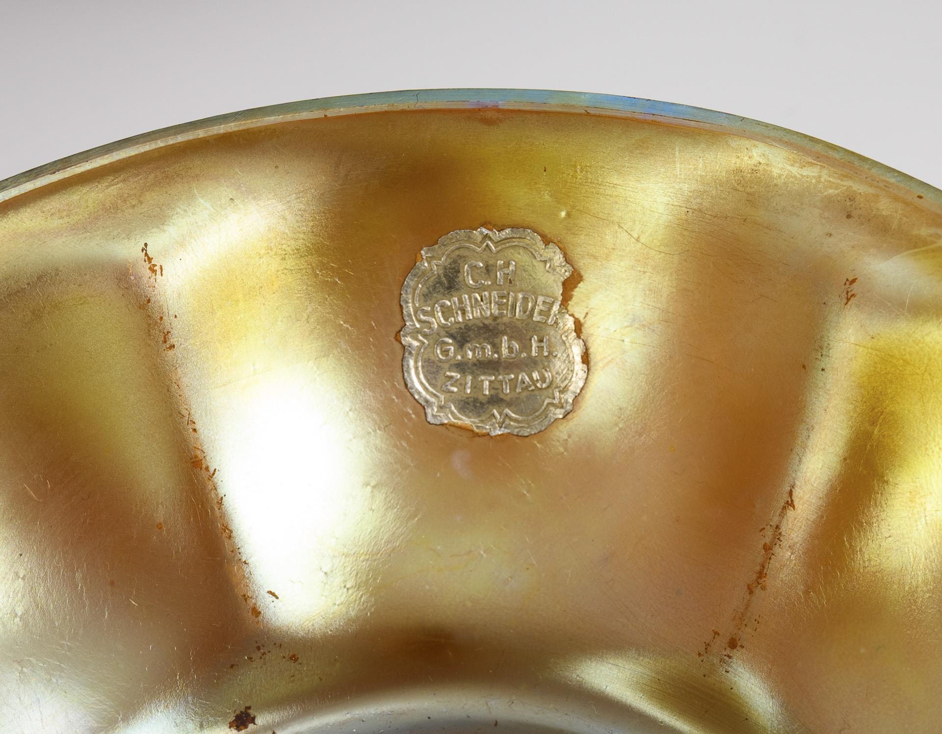 4x bernsteinfarbenes Glas, 2x farbloses Glas mit bernsteinfarbenem Innenfang, irisiert. H max. 15 cm.