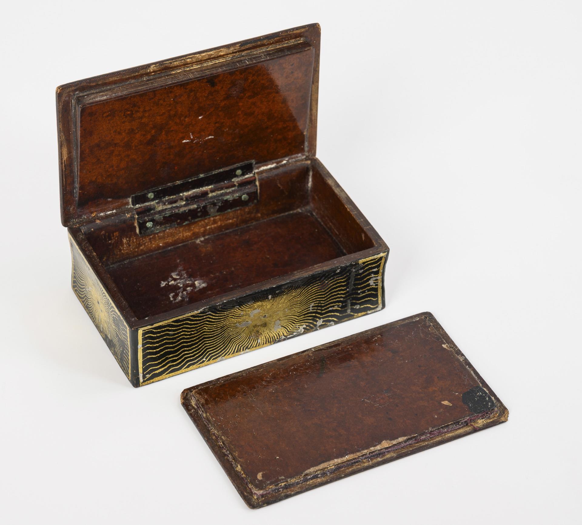 Holzschatulle mit galanter Szene zwischen einem jungen Paar in Tracht vor einer Berglandschaft in einer runden Kartusche im Deckel. Deckel, Seiten und Boden sind je mit einem goldfarbenen Strahlenmuster ornamentiert. Der Boden ist abnehmbar und enthüllt eine verdeckte erotische Malerei, eine Dame und einen Herrn in orientalisierender Tracht auf einem Himmelbett darstellend. Alters- und Gebrauchsspuren, der Bodendeckel etwas lose, Eckenbestoßungen und Fehler in der äußeren Farbfassung der Schatulle.