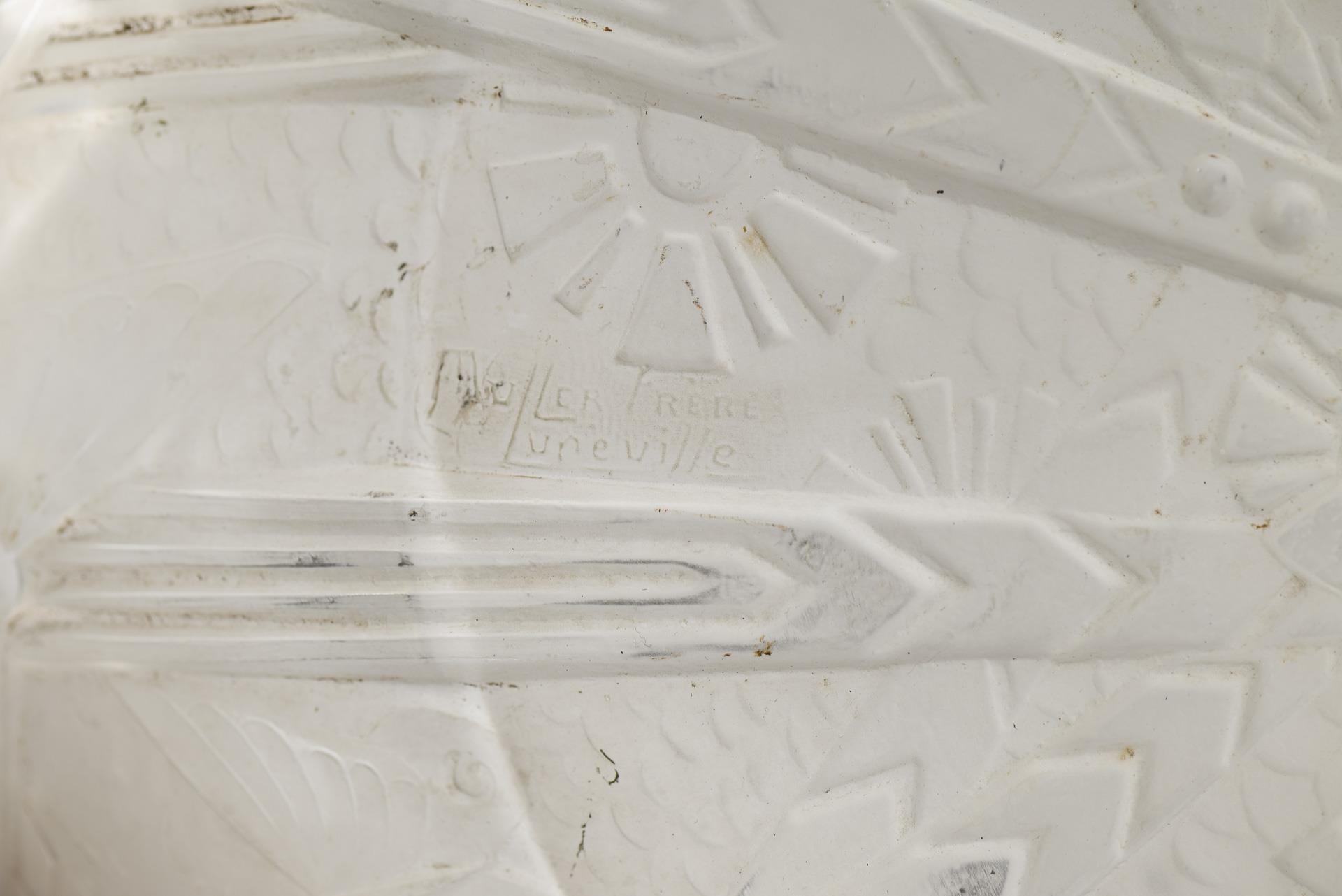Schalenlampe mit stilisiert geometrischer Reliefzier, 3 Vierkantstreben zum entsprechend reliefierten Baldachin. Kleinere Chips am Glasrand, 1 Strebe mit Knick, sonst minimale Alters-/Gebrauchsspuren, Funktion nicht geprüft.