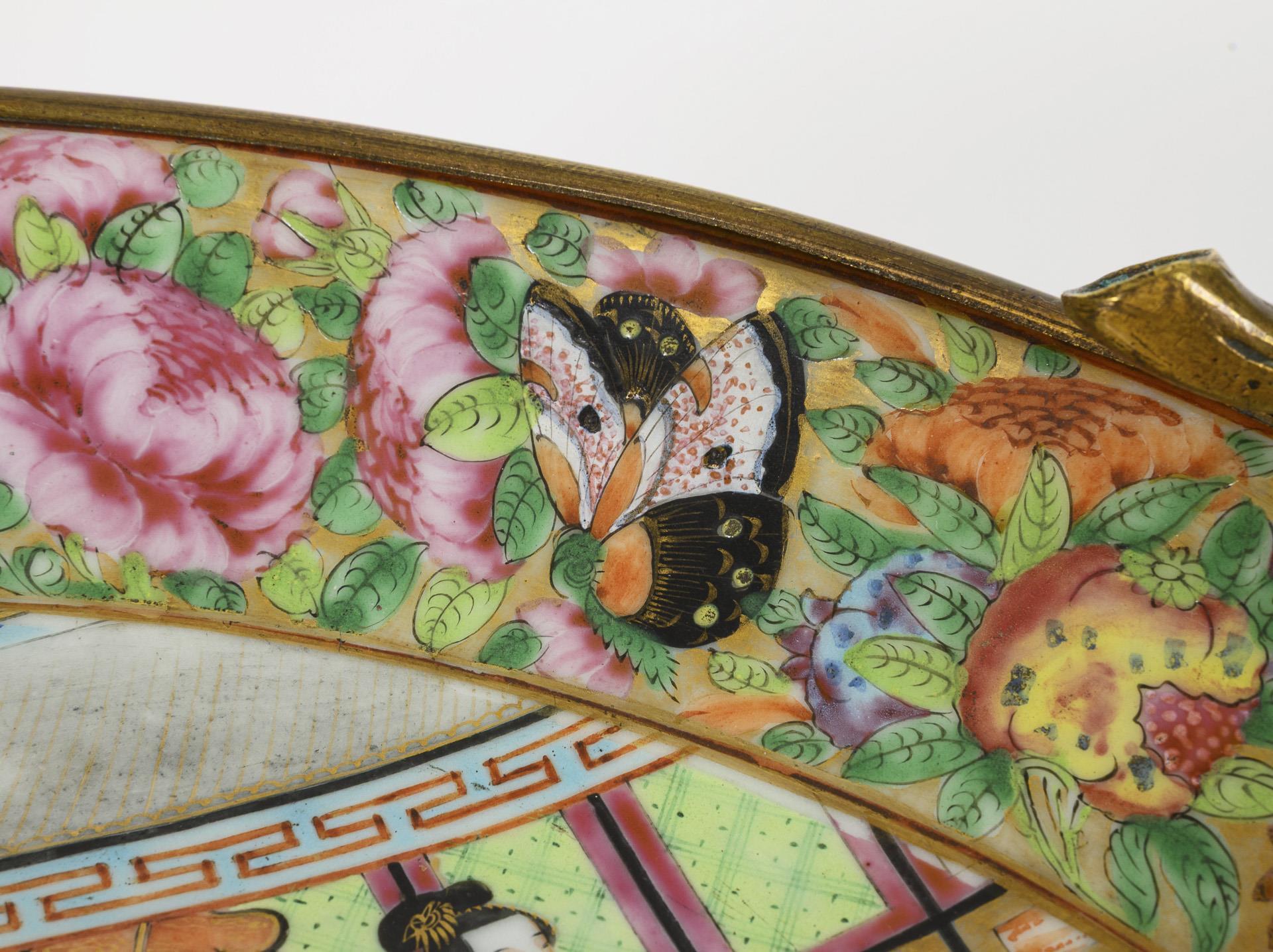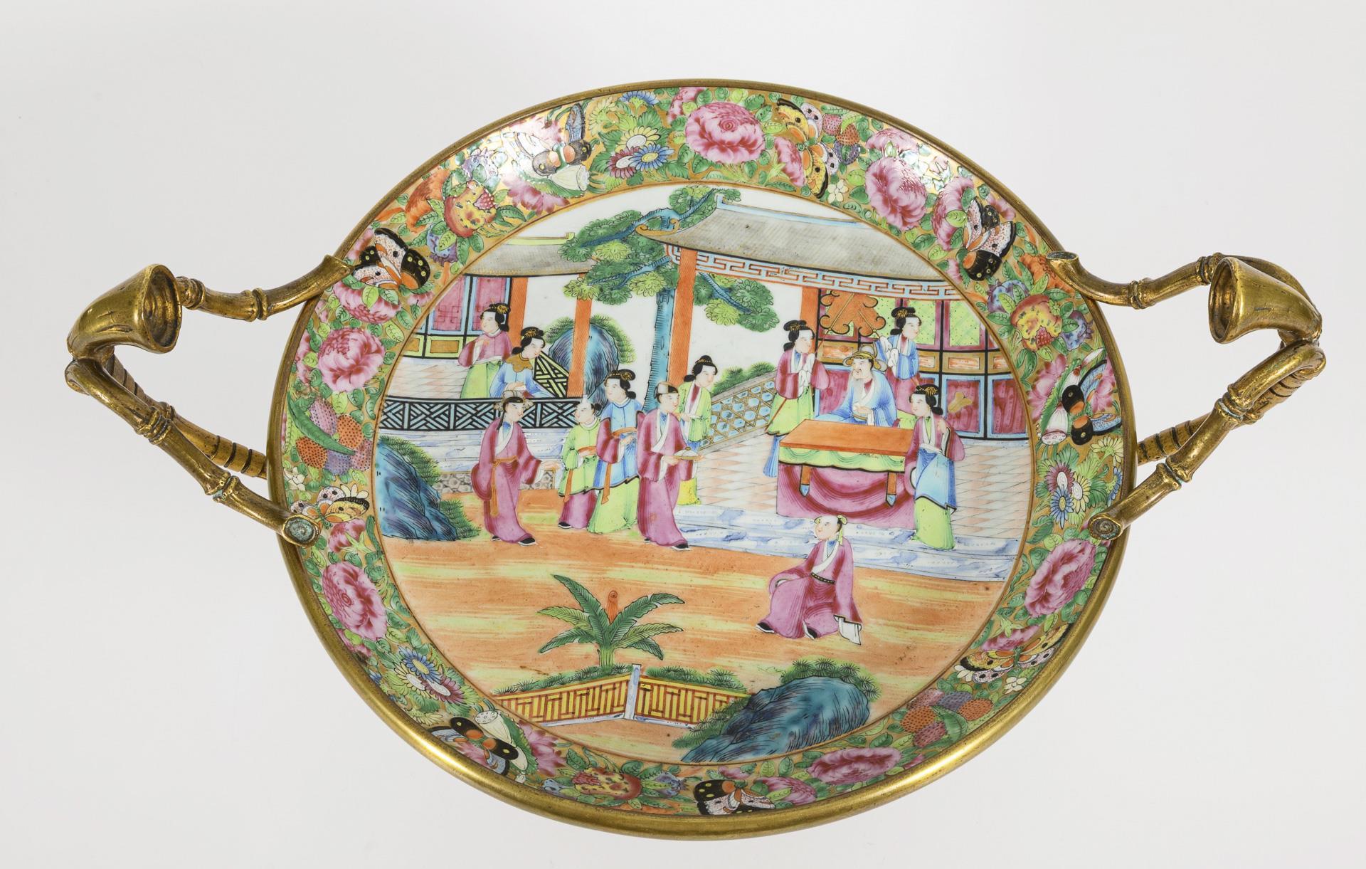 Polychrom bemalter Porzellanteller mit figürlicher Szene in Gartenlandschaft, Unterseite mit einer gemalten "4" bezeichnet. Gefasst mit Messingrand, in Form von Bambusteilen gestalteter, dekorativer Untersatz mit Henkeln.