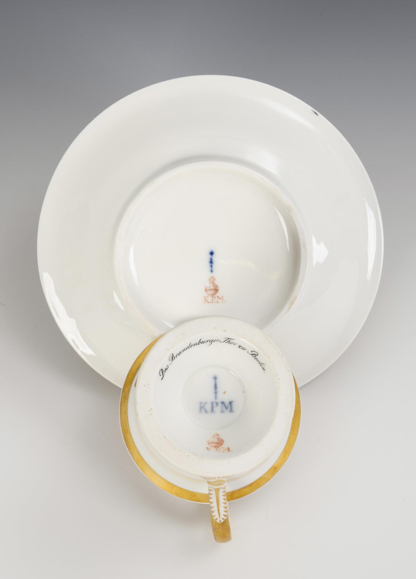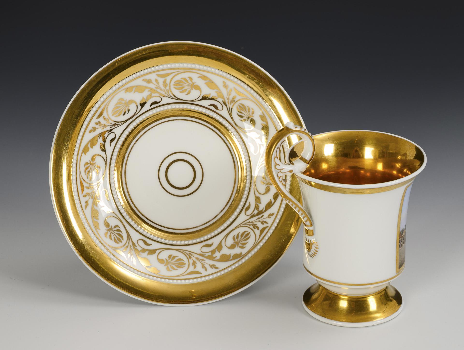 Polychrom Malerei über Vordruck, Goldstaffage. Tasse (H 12,5 cm), ergänzte Untertasse (Ø 15,5 cm).