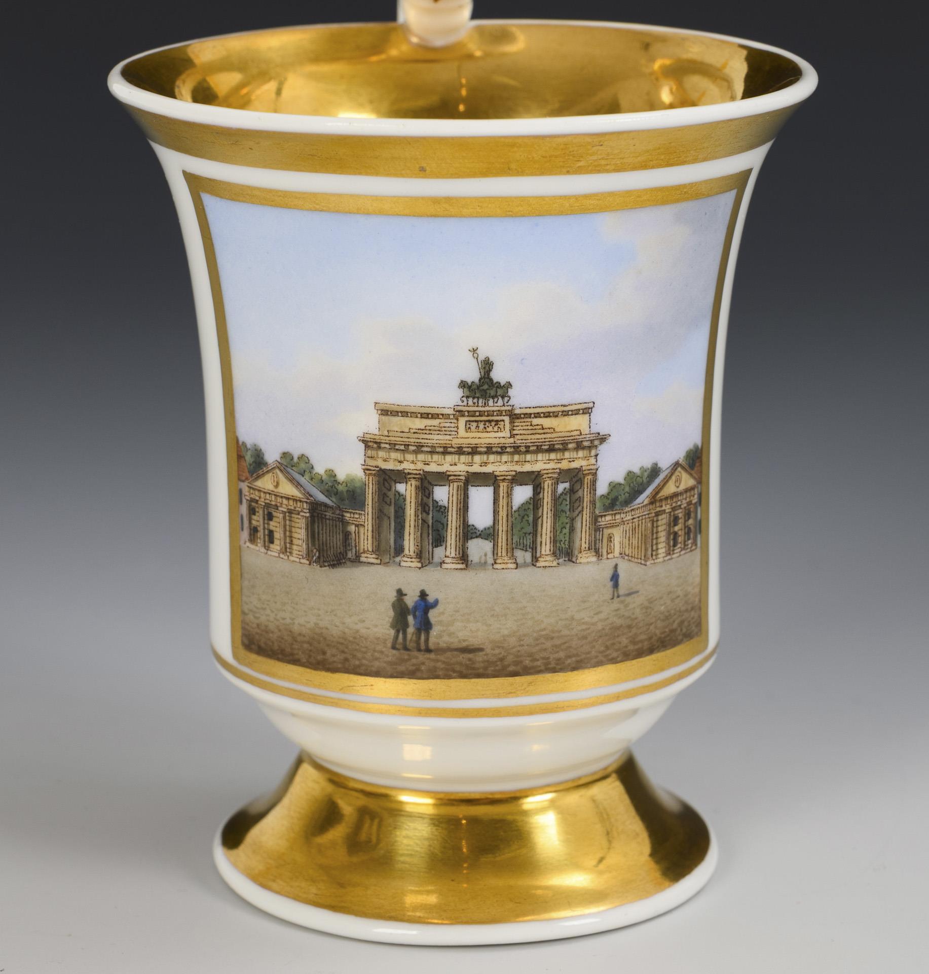 Gefußte Glockentasse mit Palmettenhenkel. Schauseitig eine goldgerahmte Rechteckkartusche mit der unterseitig bezeichneten Darstellung des Brandenburger Tores in Berlin, innen vergoldet.