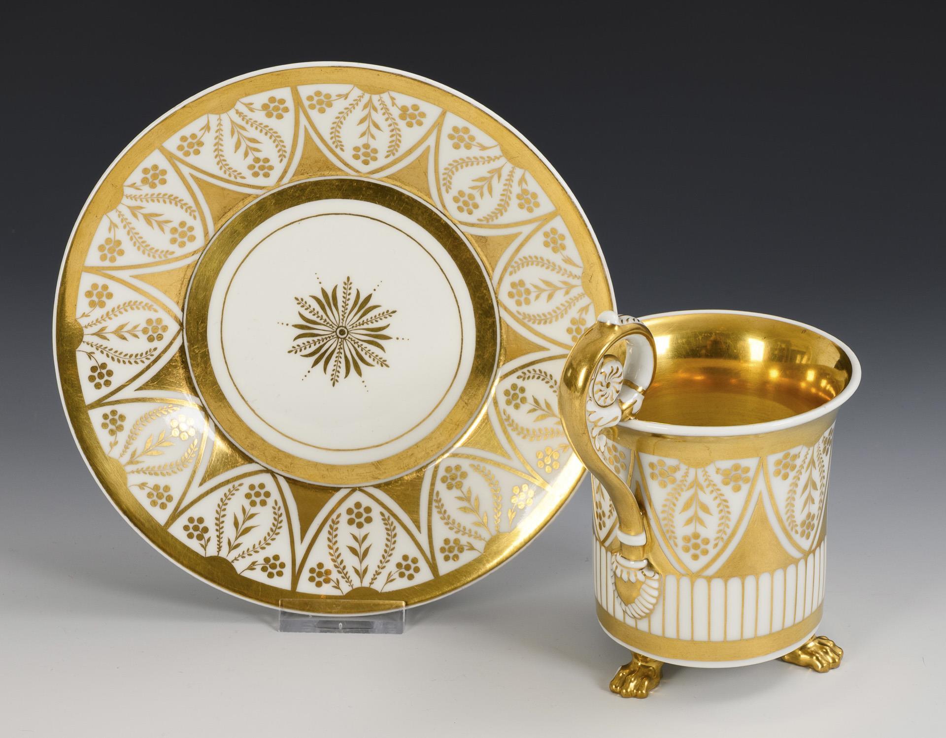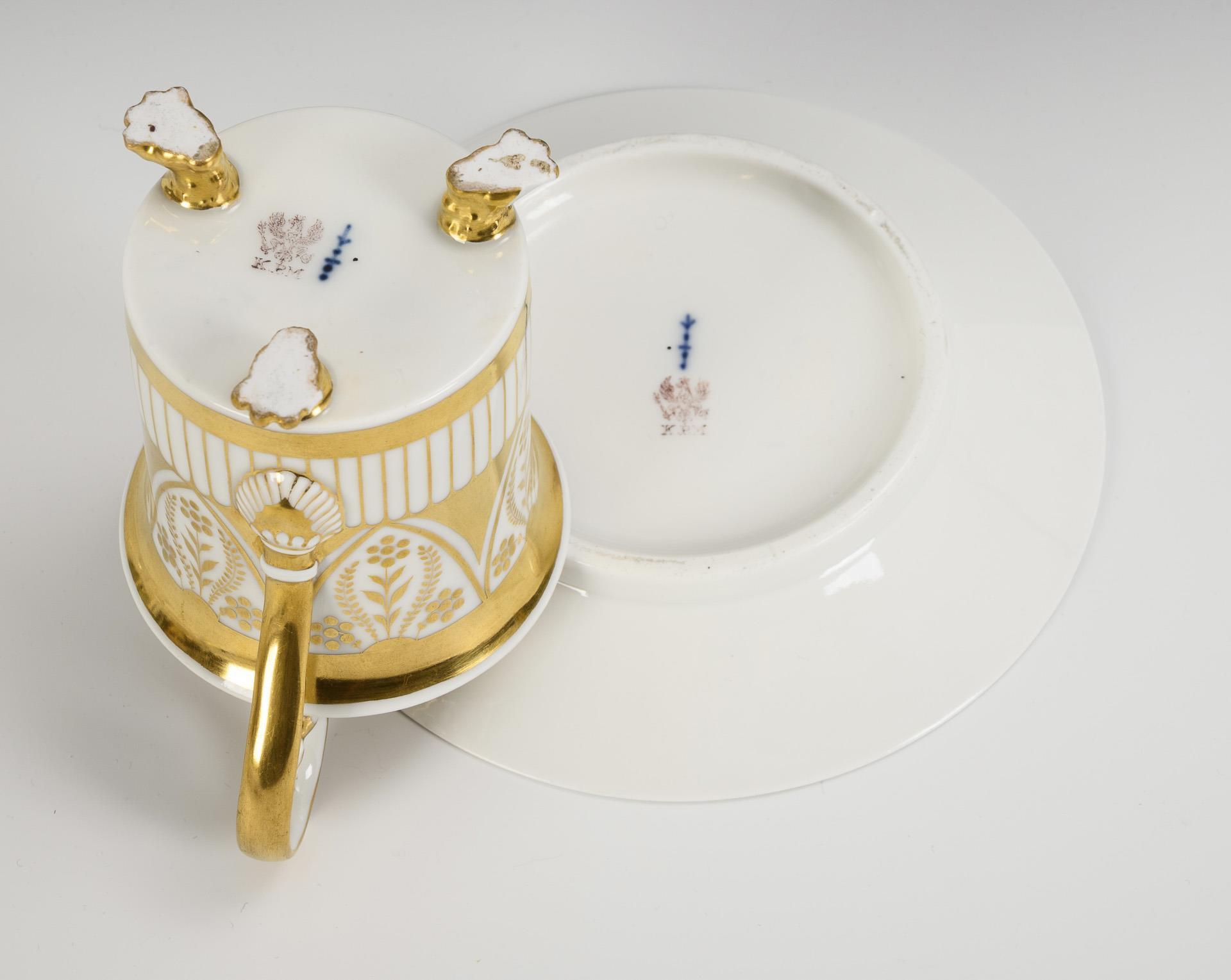 Polychrom bemalt, goldstaffiert. Tasse (H 13,5 cm), originale Untertasse (Ø 18 cm).