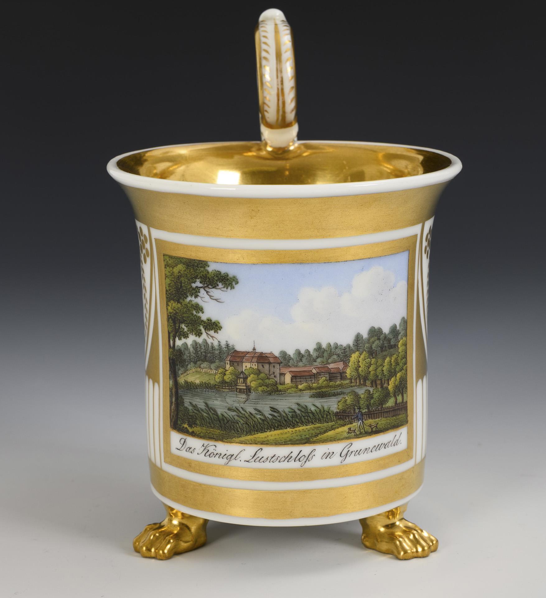 Zylindertasse mit Kraterrand, Rosettenhenkel und drei Tatzenfüßen. Schauseitig eine goldgerahmte Rechteckkartusche mit der bezeichneten Ansicht des königlichen Lustschlosses im Grunewald (heute "Jagdschloss Grunewald"). 2 Tatzenfüße bestoßen.