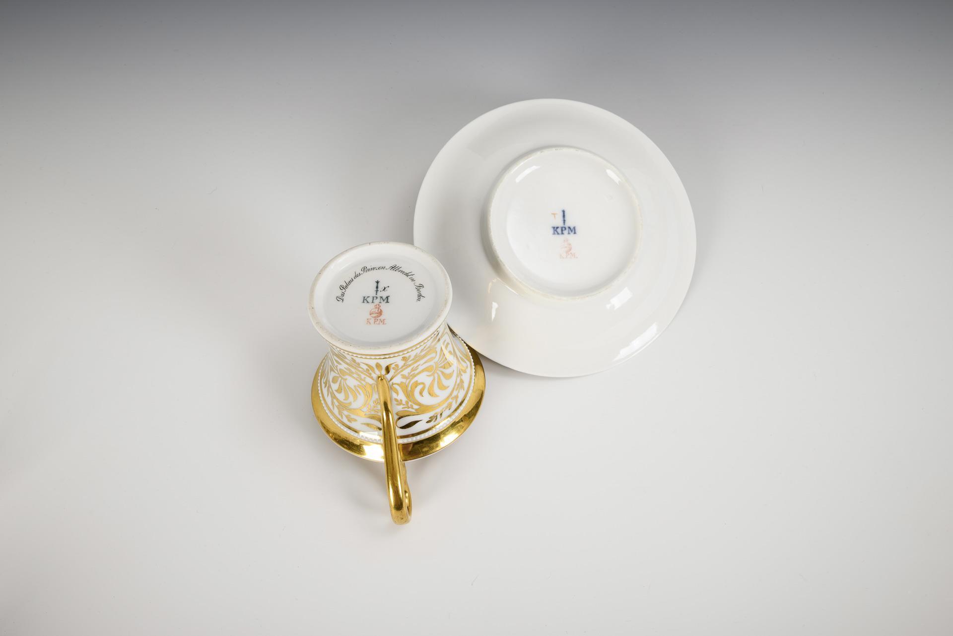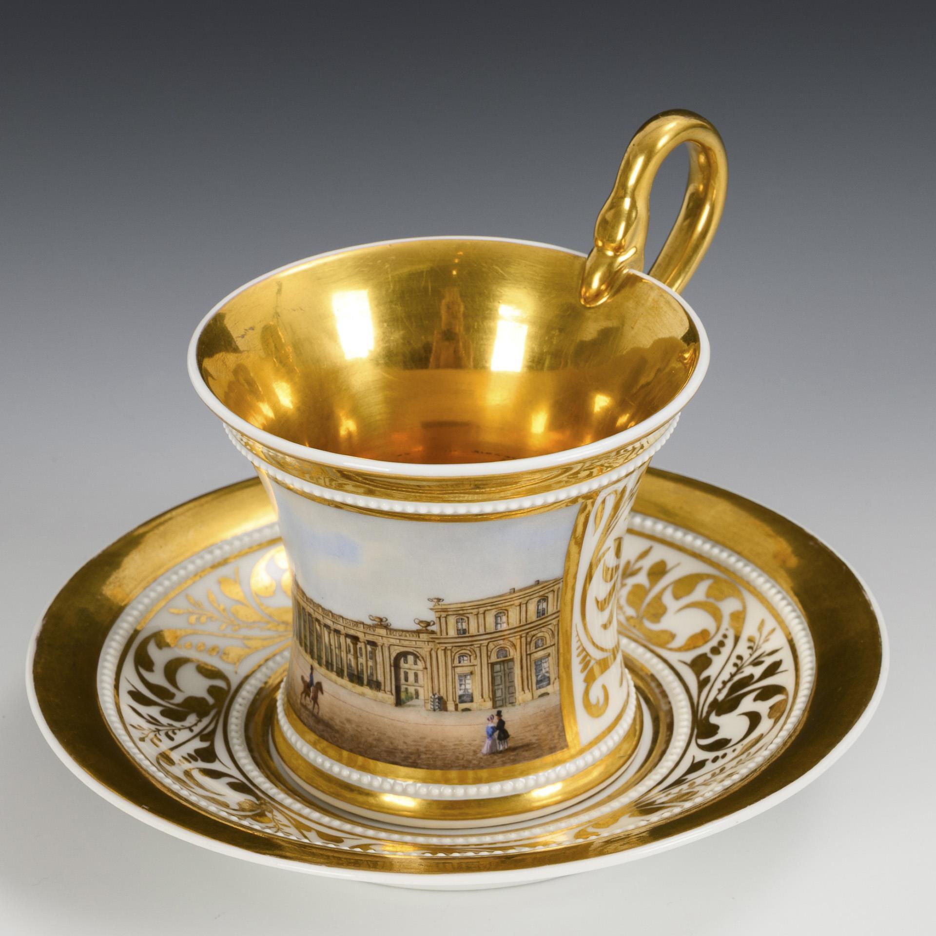 Kratertasse mit Perlbändern und Schwanenhenkel. Schauseitig eine goldgerahmte Rechteckkartusche mit der unterseitig bezeichneten Ansicht des Palais des Prinzen Albrecht in Berlin, verso vegetabile Goldmalerei, innen vergoldet.