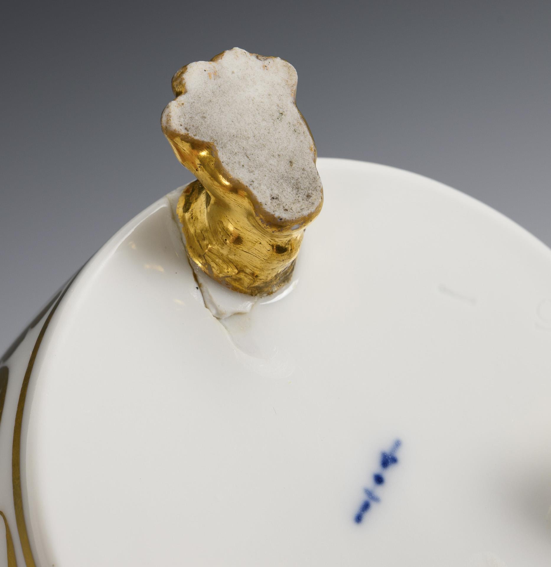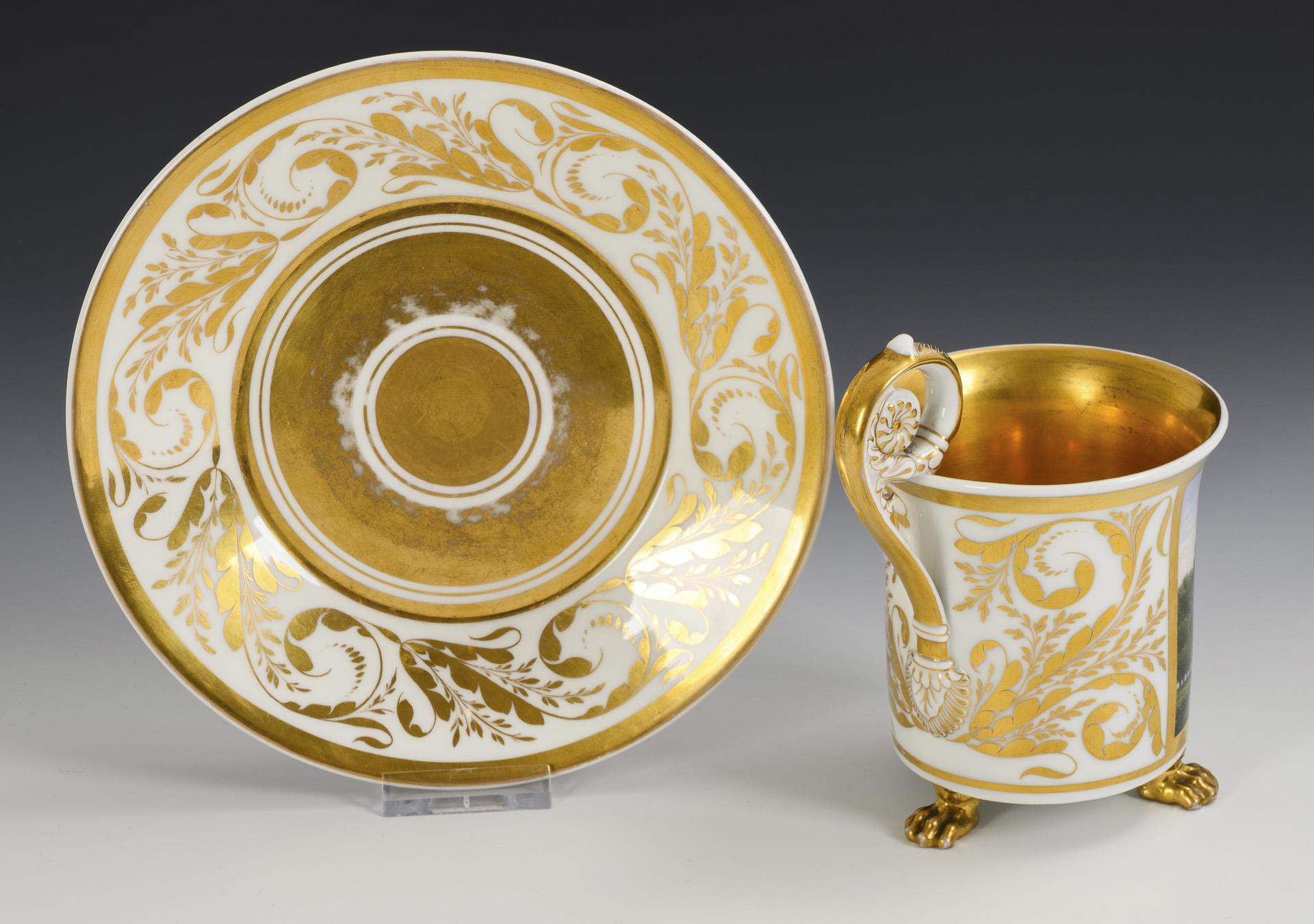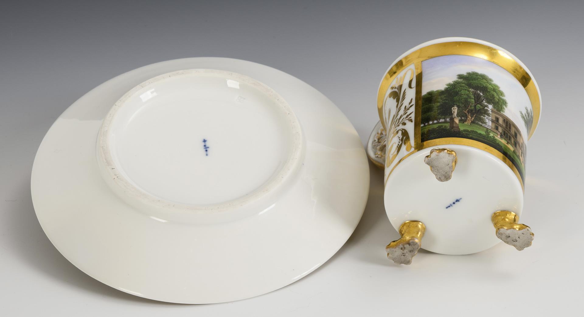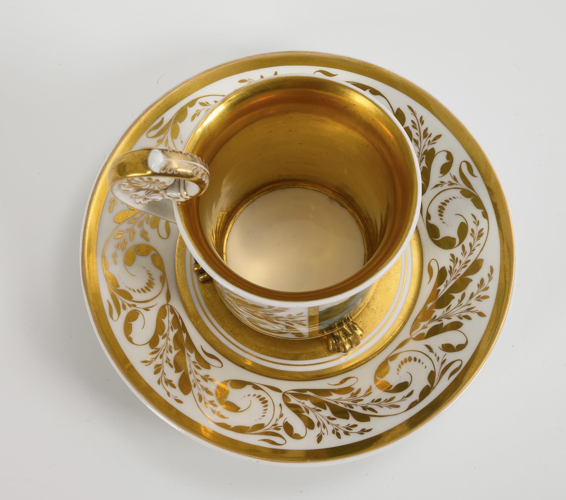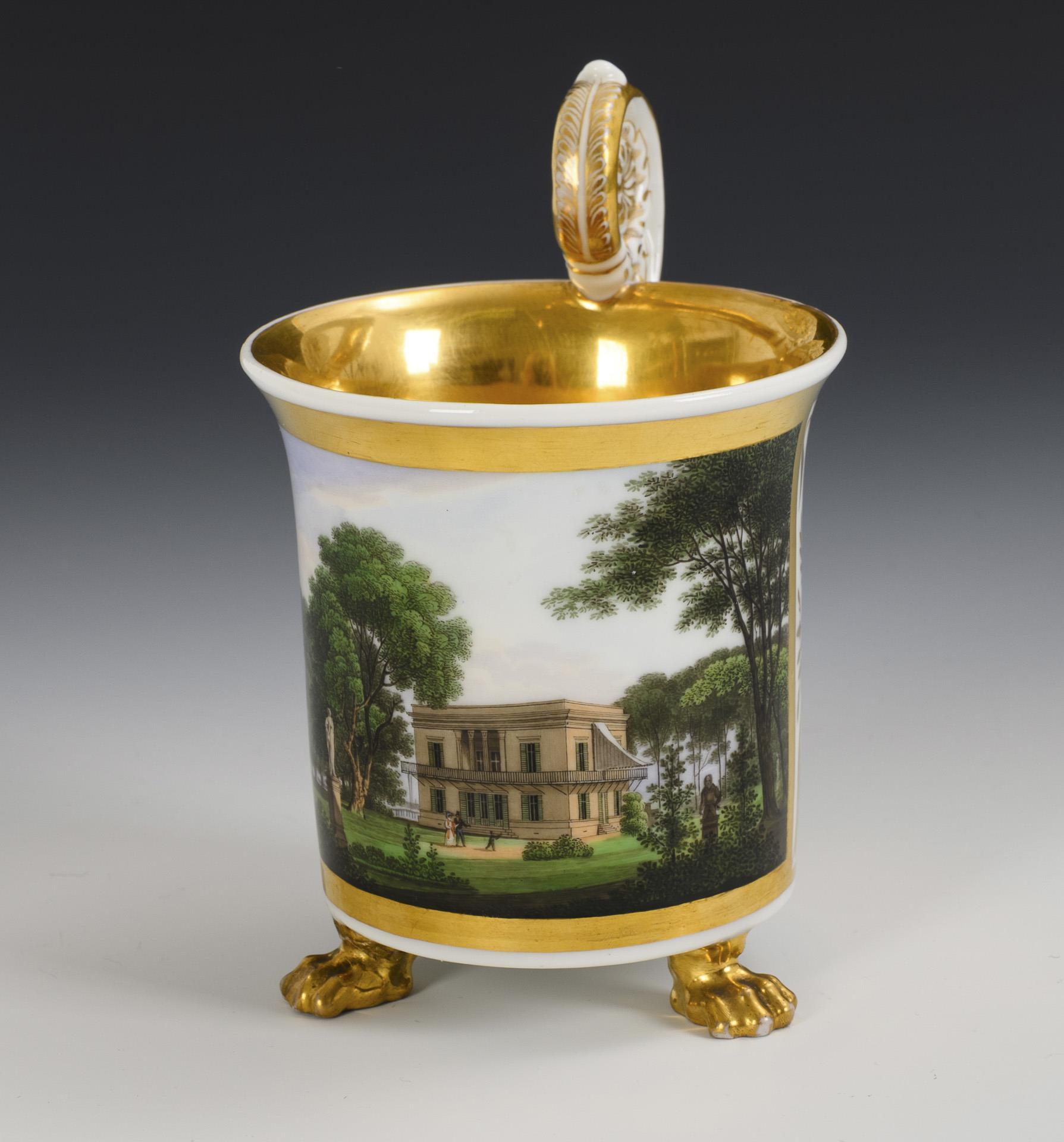 Zylindertasse mit Kraterrand, Rosettenhenkel und drei Tatzenfüßen. Schauseitig eine goldgerahmte Rechteckkartusche mit der Ansicht des Neuen Pavillons im Schlossgarten Charlottenburg, verso vegetabile Goldmalerei, innen vergoldet. 1 Tatzenfuß mit goldretuschierter Bestoßung, 1 Tatzenfuß geklebt, minimaler Goldabrieb im Untertassenspiegel.