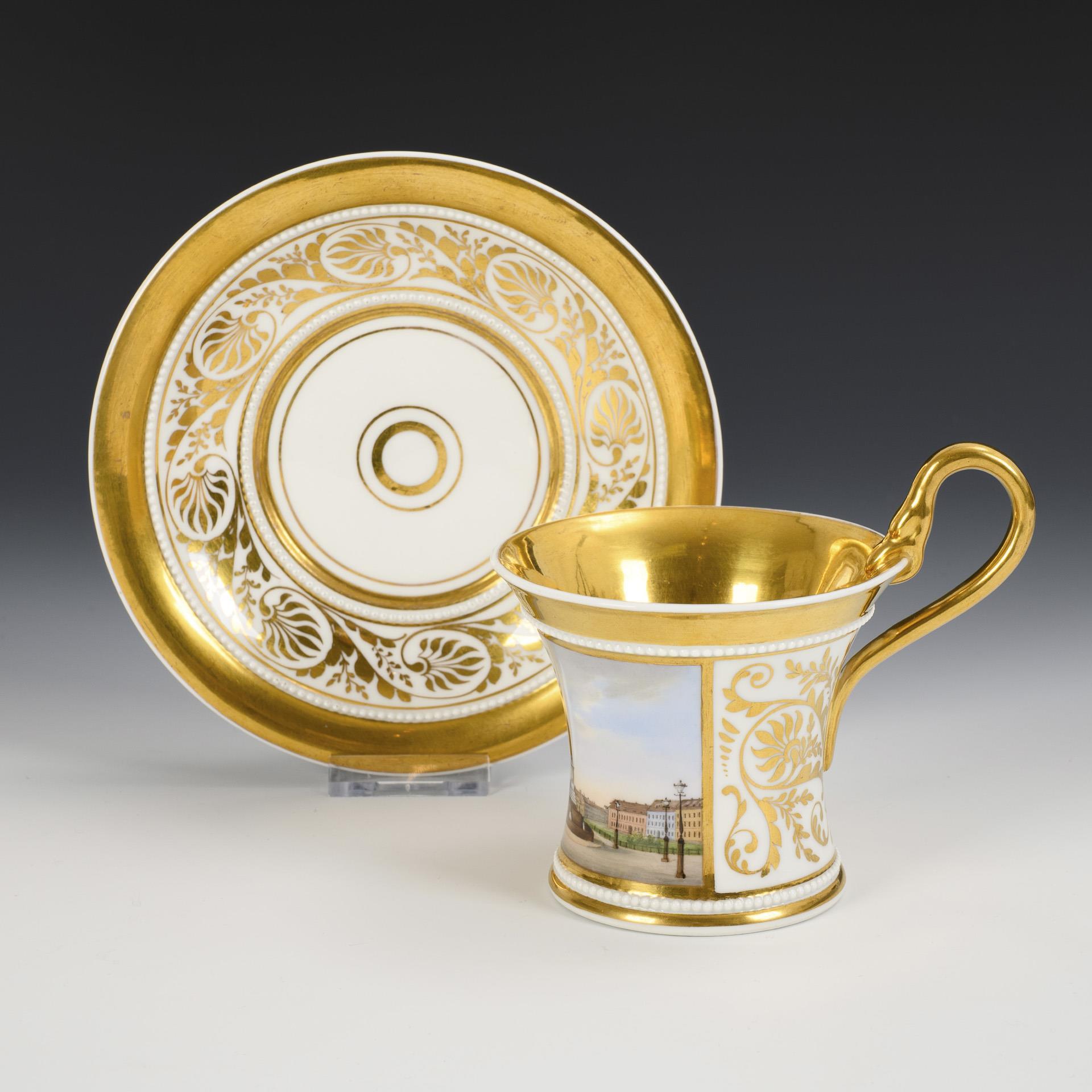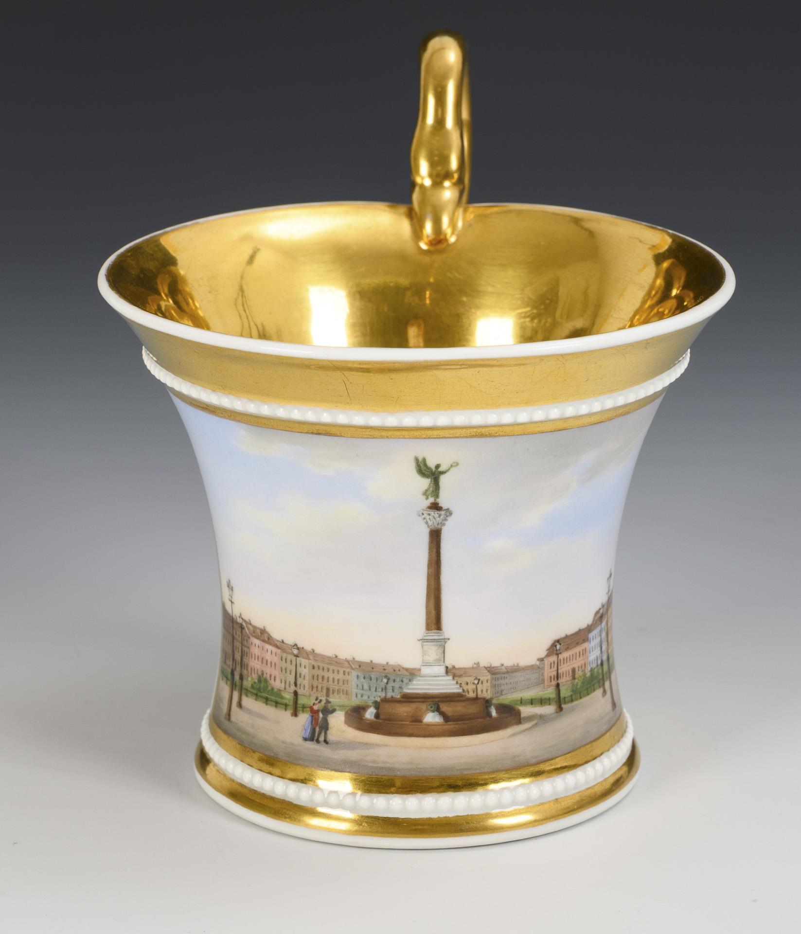 Kratertasse mit Perlbändern und Schwanenhenkel. In einer goldgerahmten Rechteckkartusche die unterseitig bezeichnete Ansicht des Belle-Alliance-Platzes in Berlin, verso vegetabile Goldmalerei, innen vergoldet.