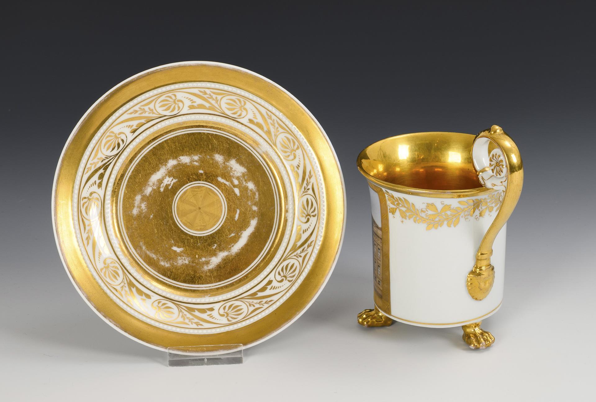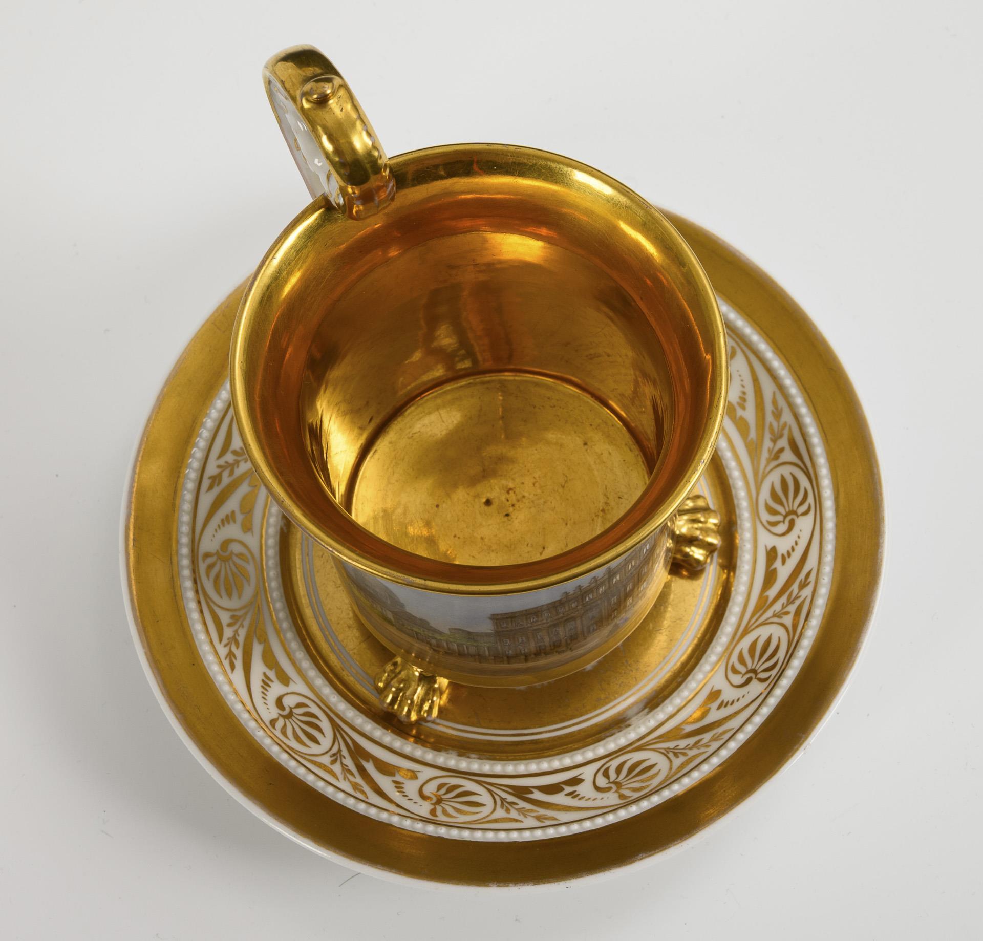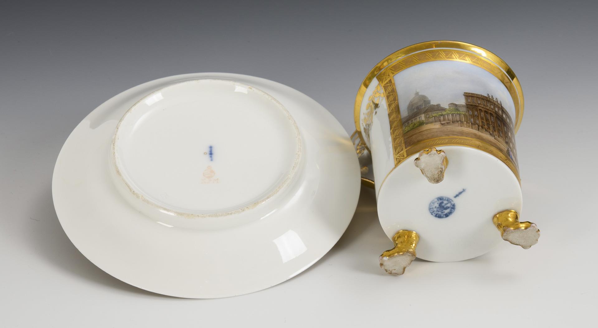 Zylindertasse mit Kraterrand, Rosettenhenkel und drei Tatzenfüßen. In einer goldgerahmten Rechteckkartusche die bezeichnete Ansicht des Palais des Prinzen Friedrich Wilhelm ("Kronprinzenpalais") in Berlin, verso goldene Blattbordüre, innen vergoldet. Goldabrieb im Untertassenspiegel.