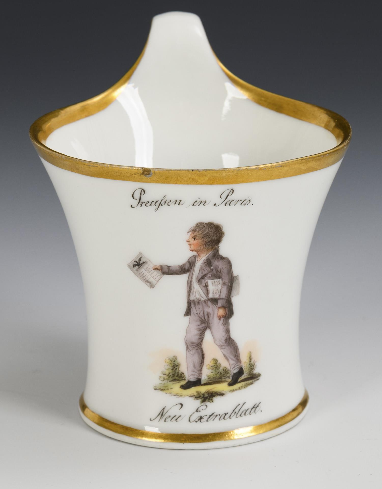 Modell "Konisch" mit Campanerhenkel. Schauseitig die Darstellung eines Knaben, Nachrichten austragend, bezeichnet "Preußen in Paris" und "Neu Extrablatt".