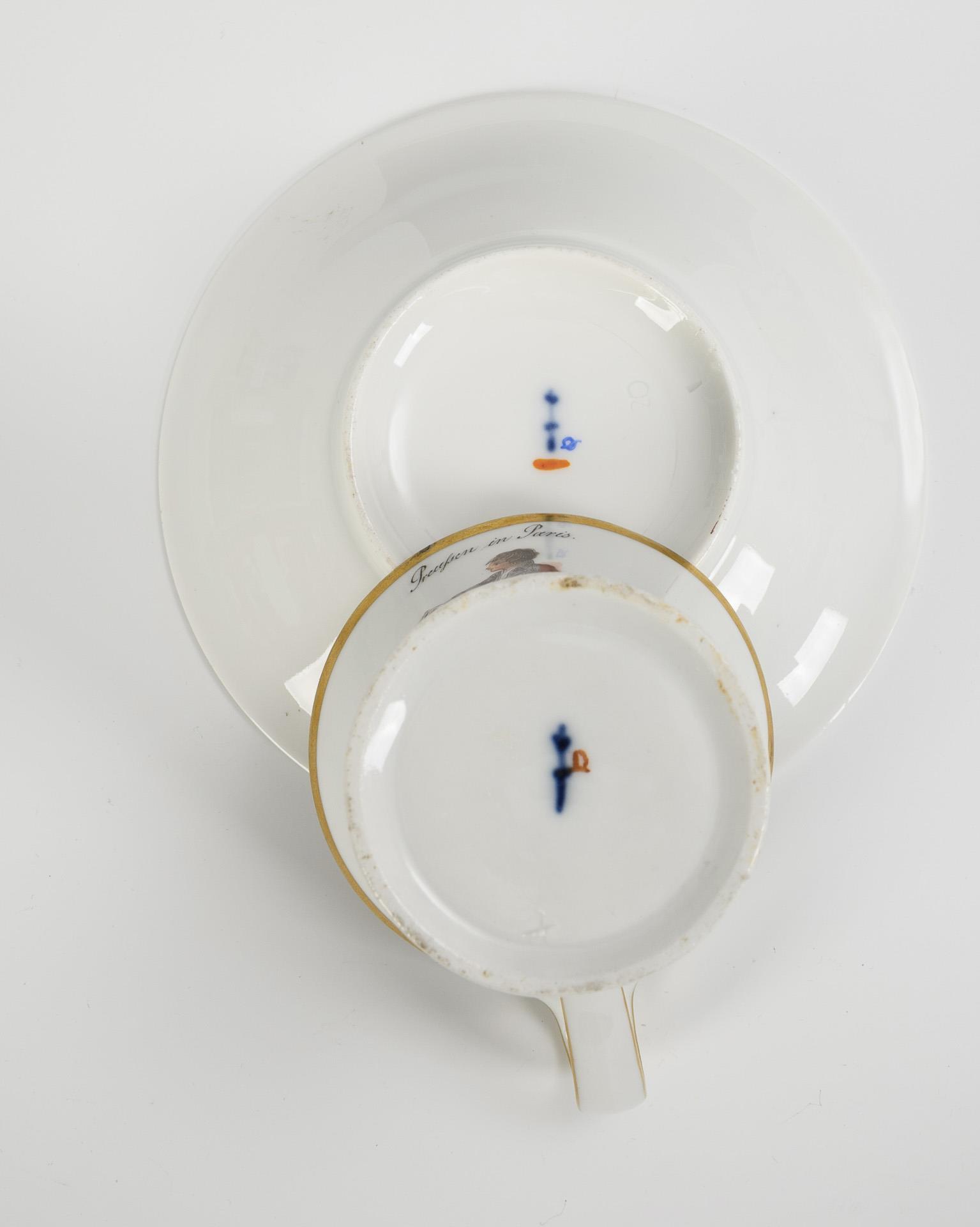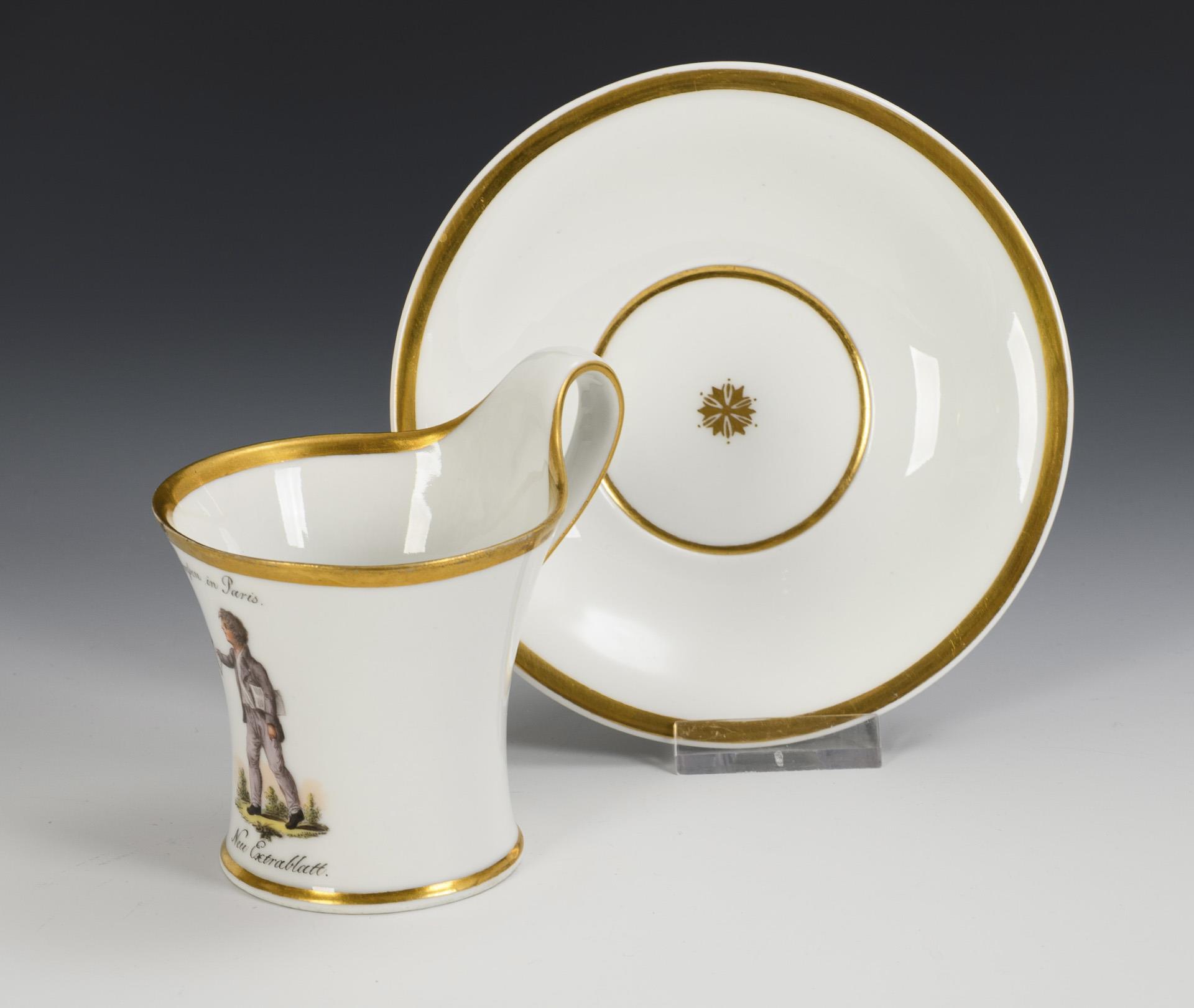 Polychrome Malerei über Vordruck, Goldstaffage. Tasse (H 9 cm), ergänzte Untertasse (Ø 13,5 cm).