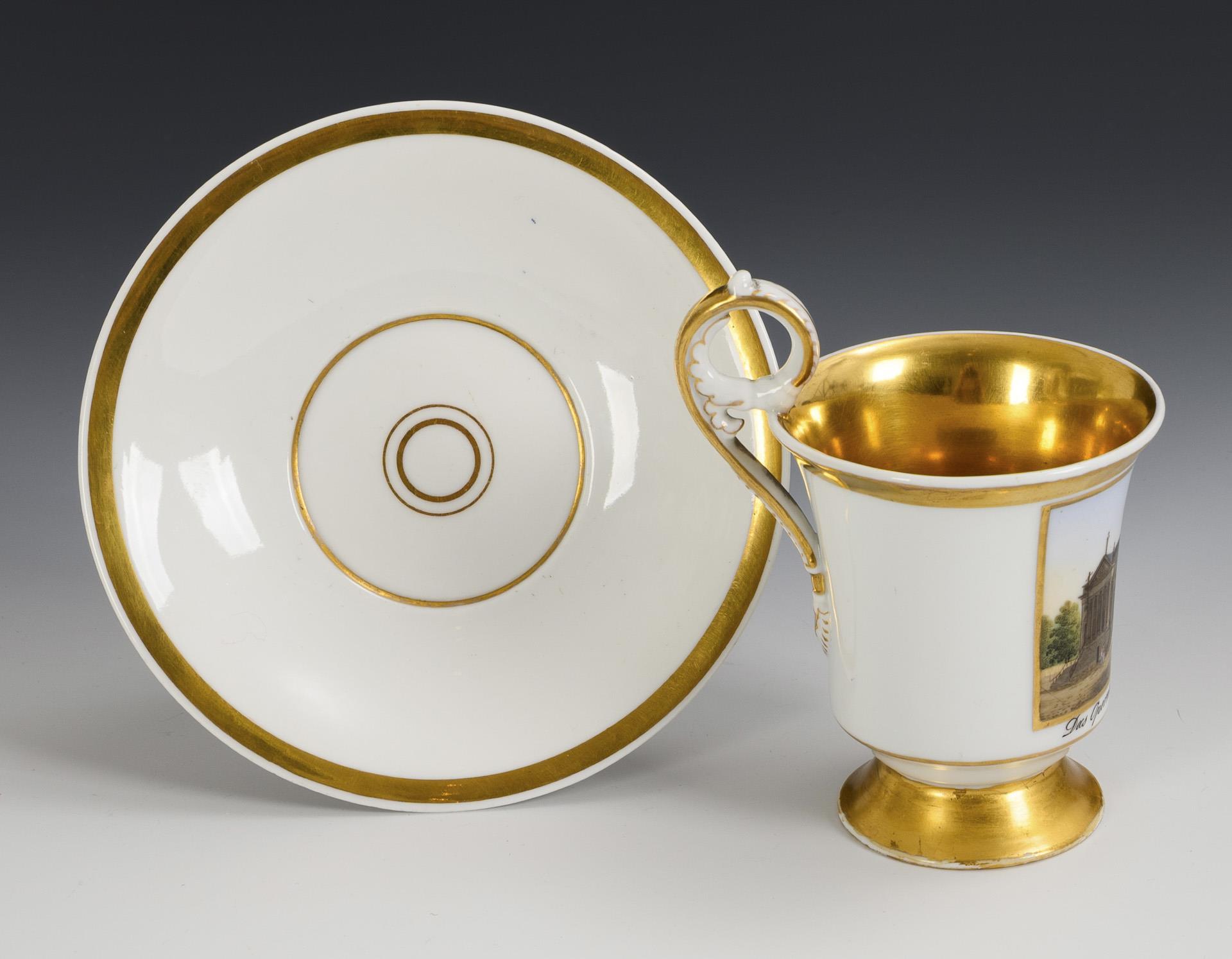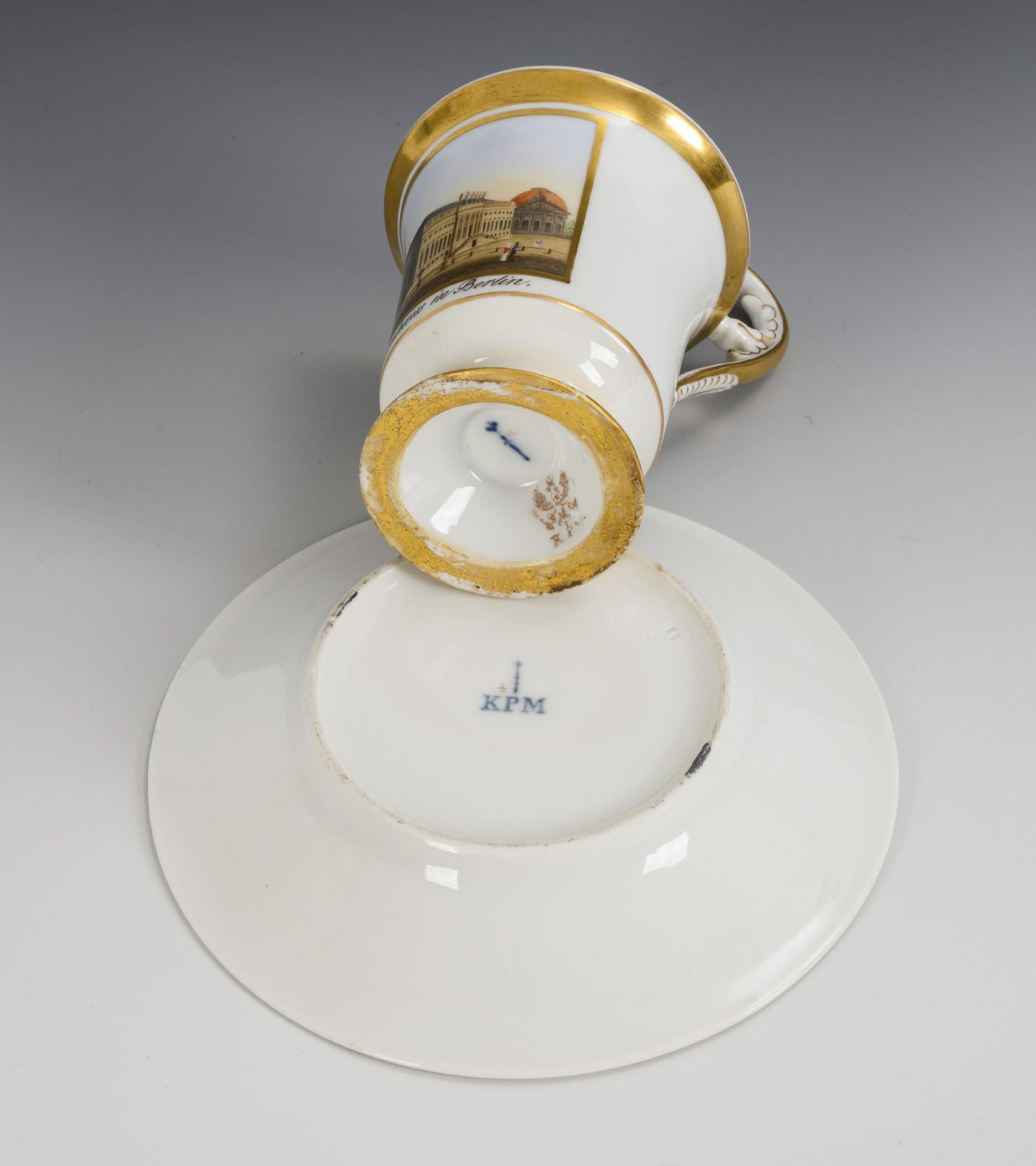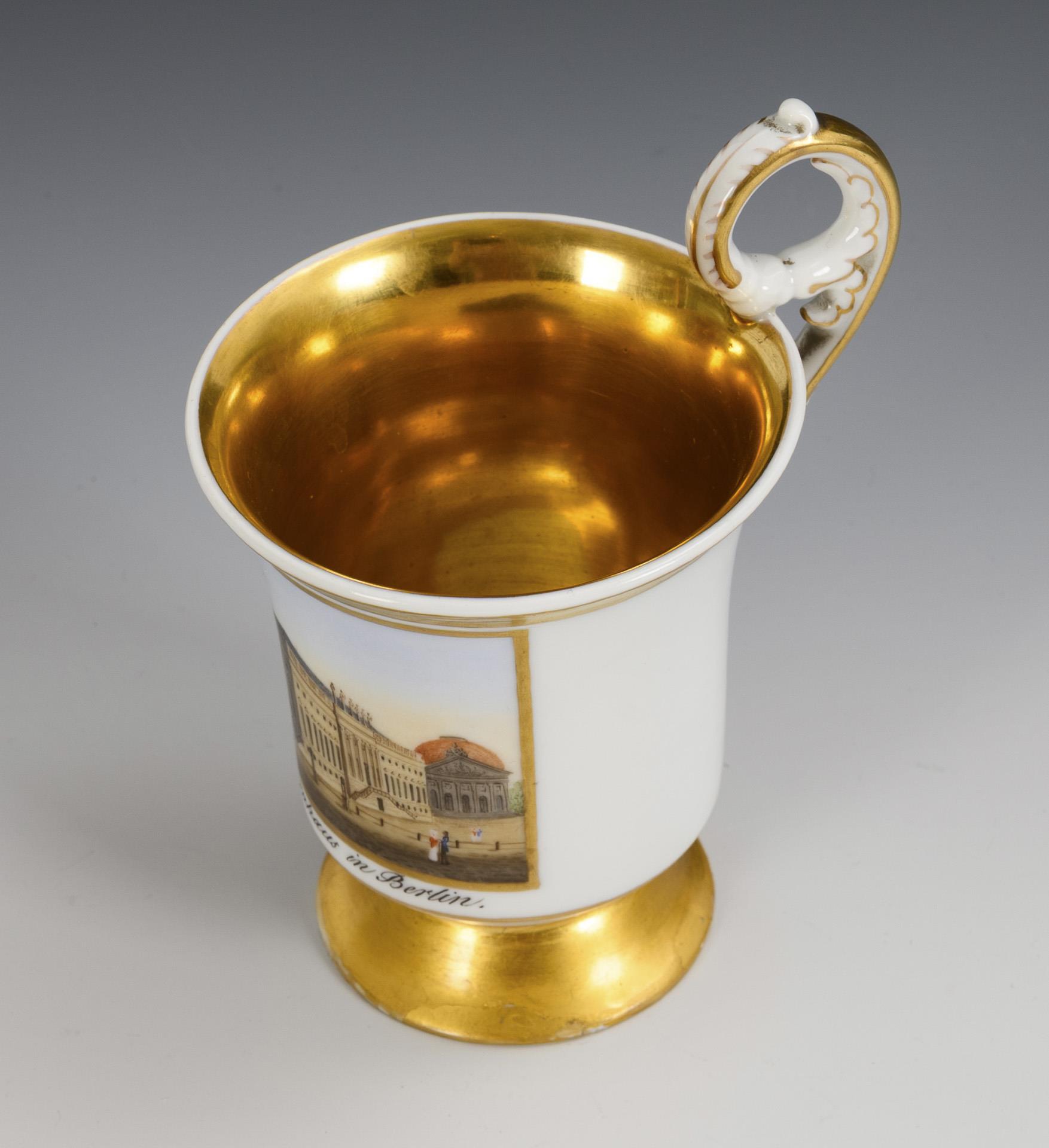 Gefußte Glockentasse mit Palmettenhenkel. In einer goldgerahmten Rechteckkartusche die bezeichnete Darstellung des Opernhauses in Berlin, dahinter die Sankt Hedwigs-Kathedrale. Innen vergoldet. Fuß restauriert und goldretuschiert.