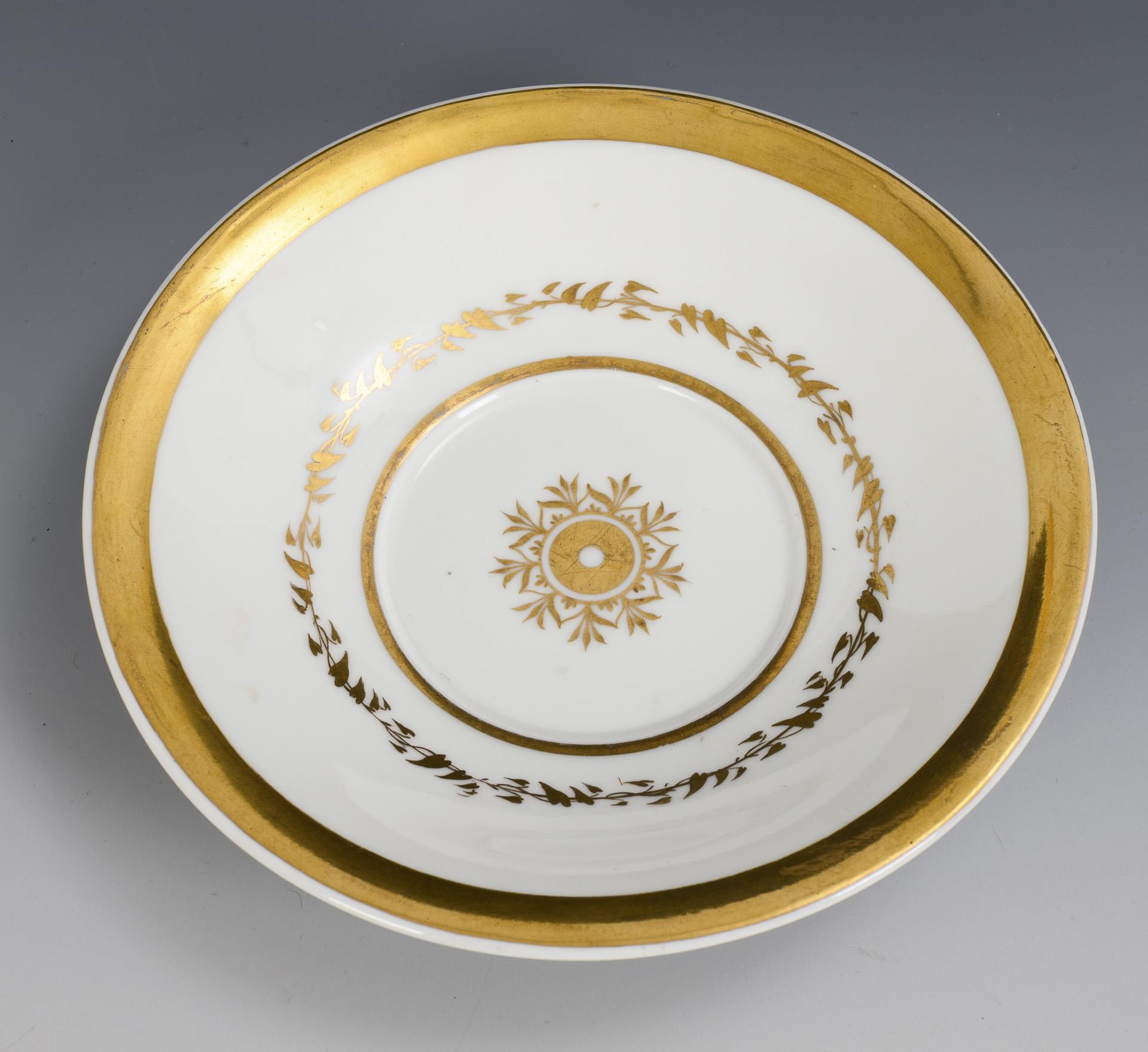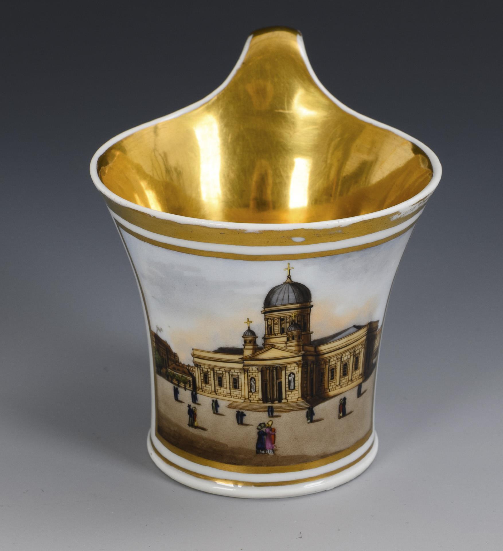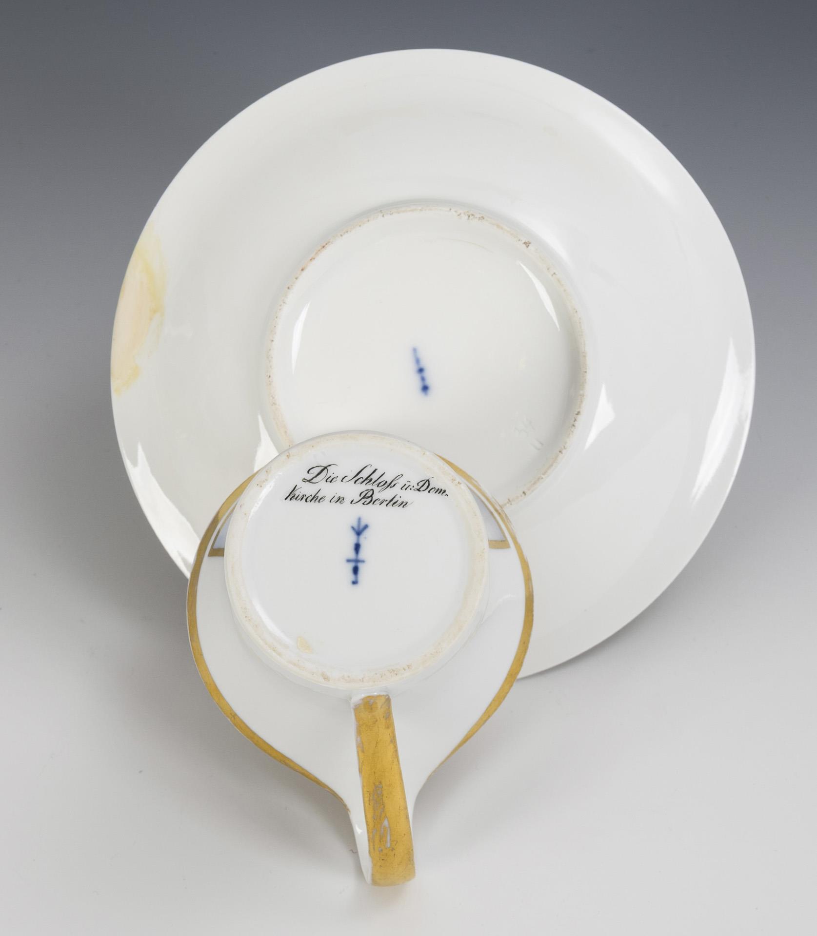 Modell "Konisch" mit Campanerhenkel. In einer goldgerahmten Rechteckkartusche die bezeichnete Darstellung des Schlosses und der Domkirche in Berlin. Gold etwas berieben, Restaurierung unterseitig am Rand der Untertasse (.