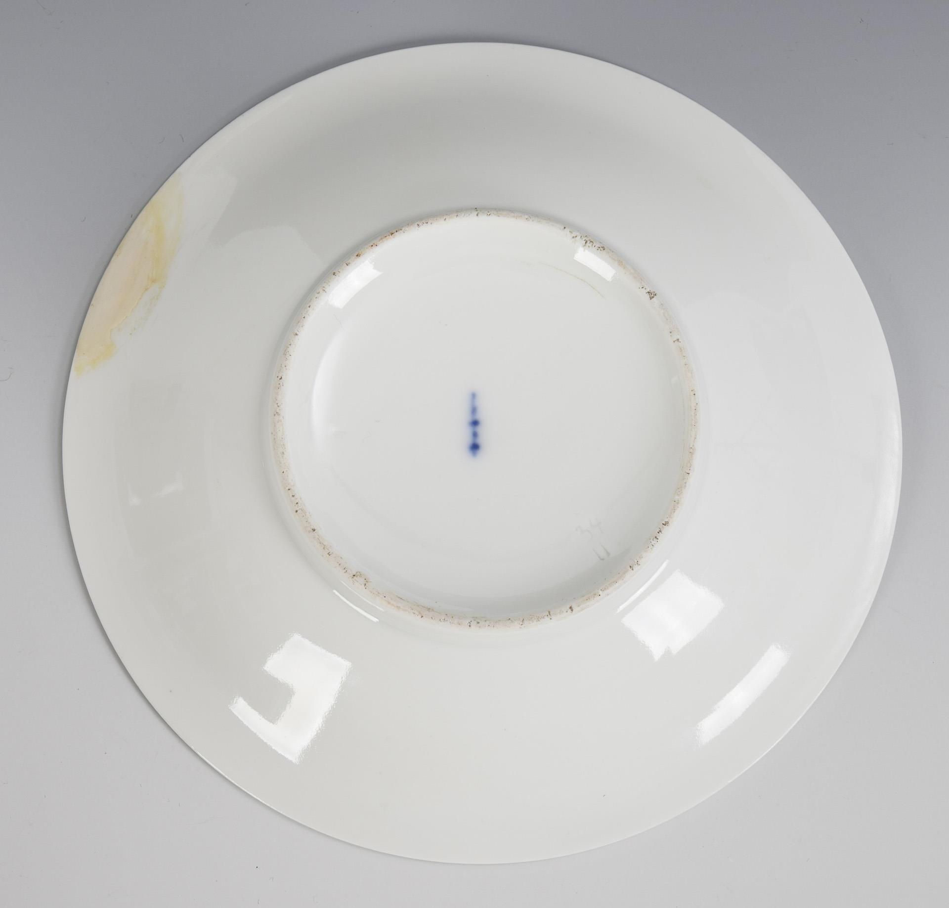 Polychrom bemalt, goldstaffiert. Tasse (H 8,5 cm), ergänzte Untertasse (Ø 15 cm).