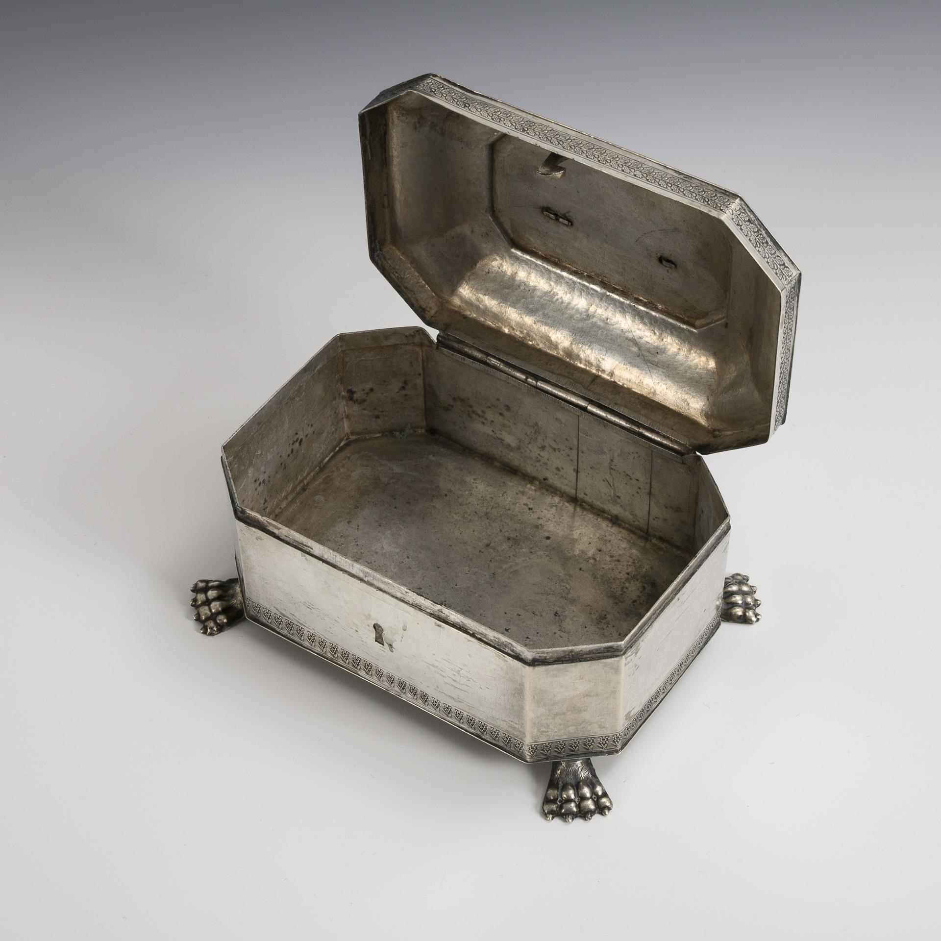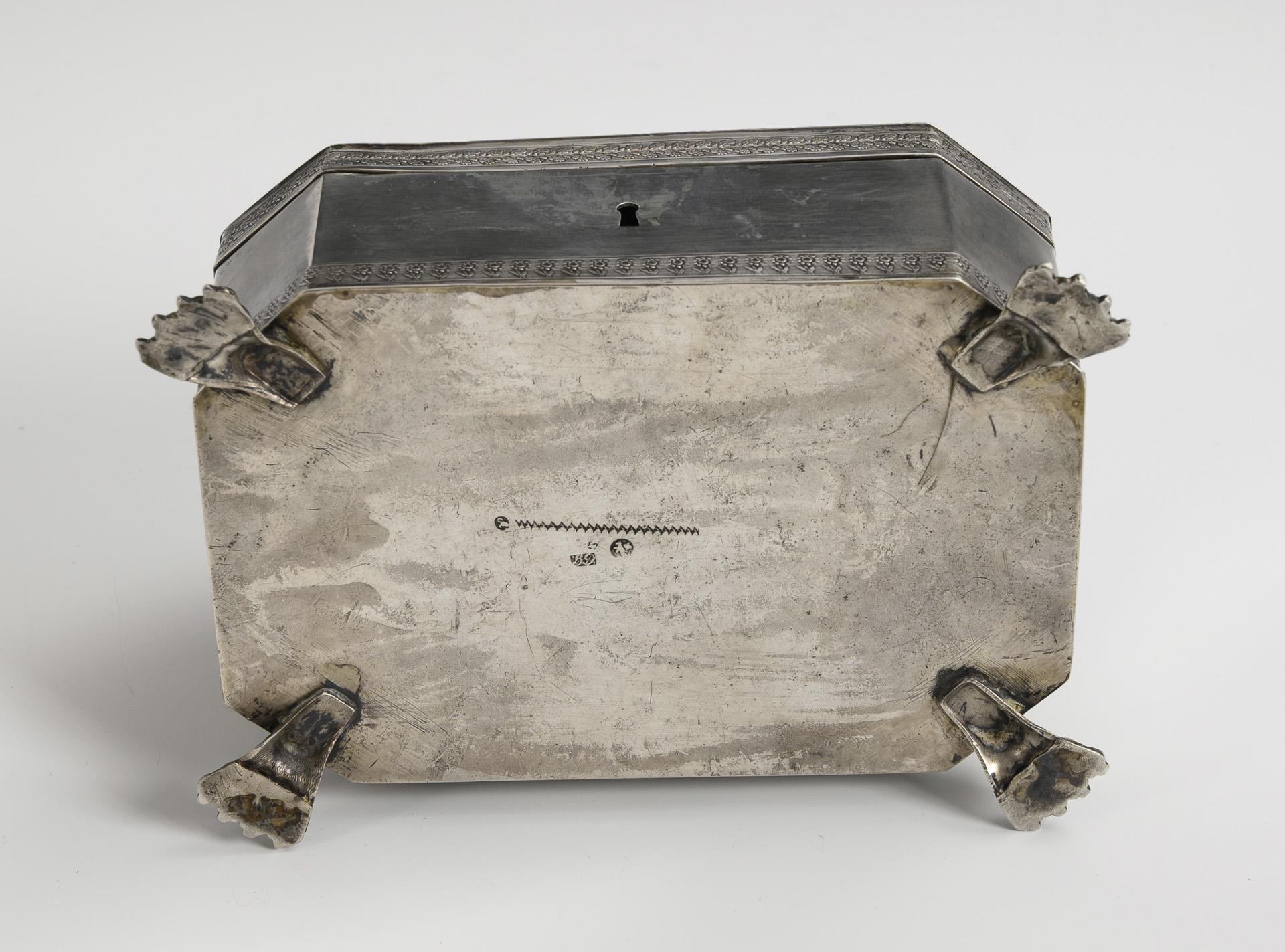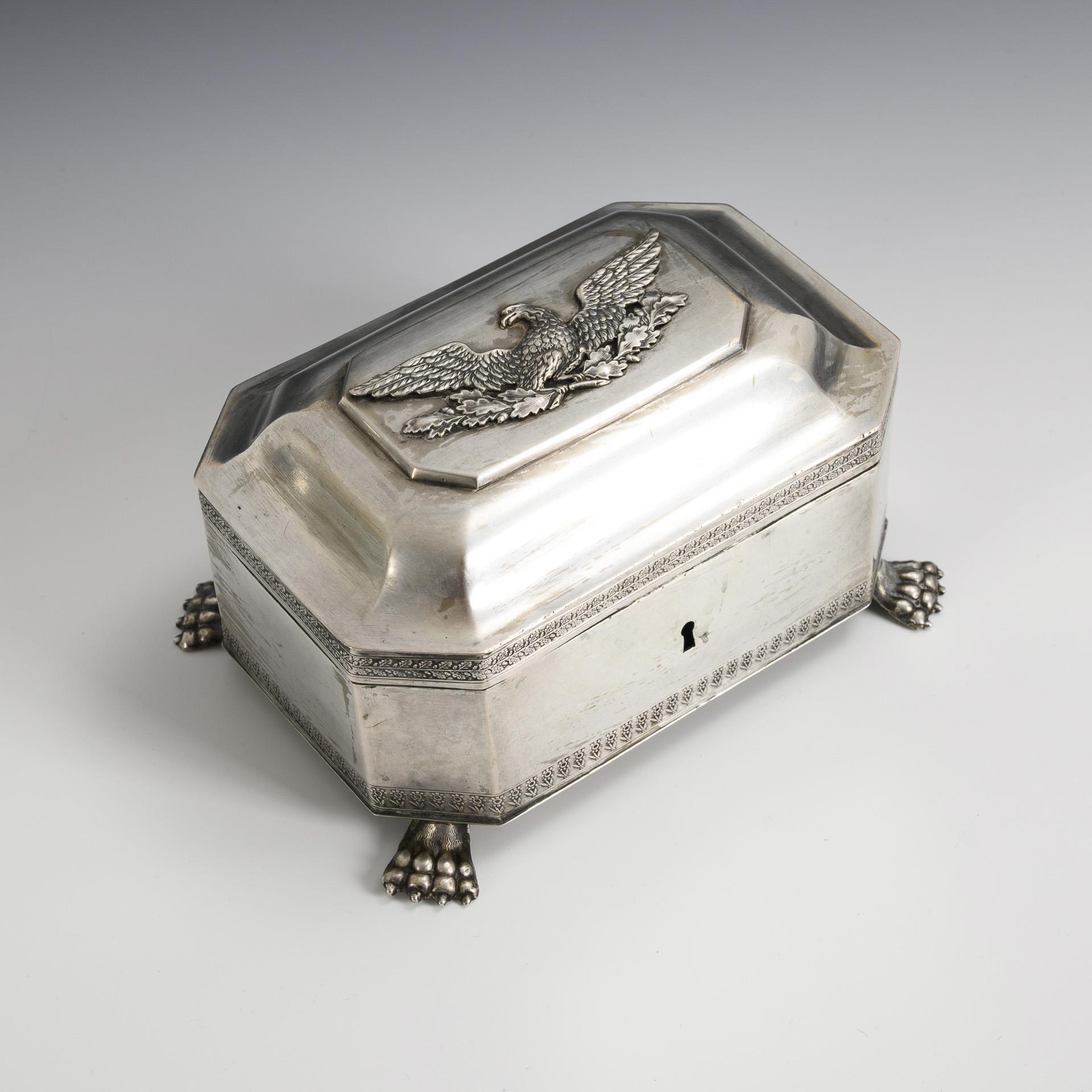 Verschließbare Biedermeier-Silberdose mit Tatzenfüßen und reliefiertem Adler auf dem Deckel. 1. H. 19. Jh. 9 x 14,5 x 10 cm. Als Zugabe 4 jüngere Löffel (3x Silber gepunzt, 1x wohl versilbert). L 13,5 - 15 cm. Altersspuren, kleine Lötstellen.