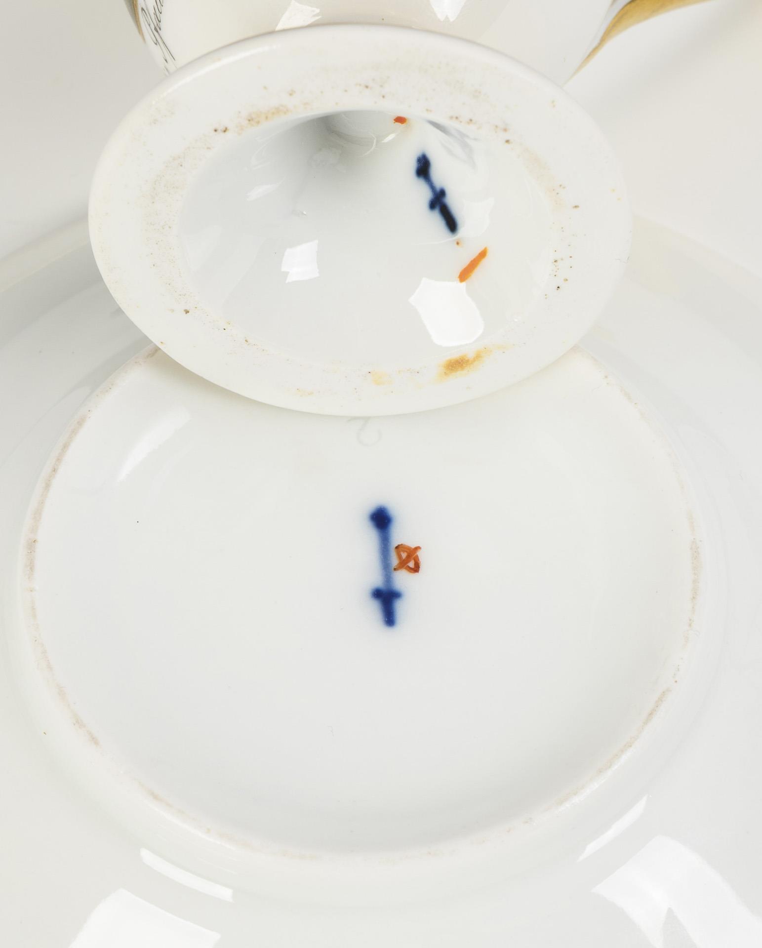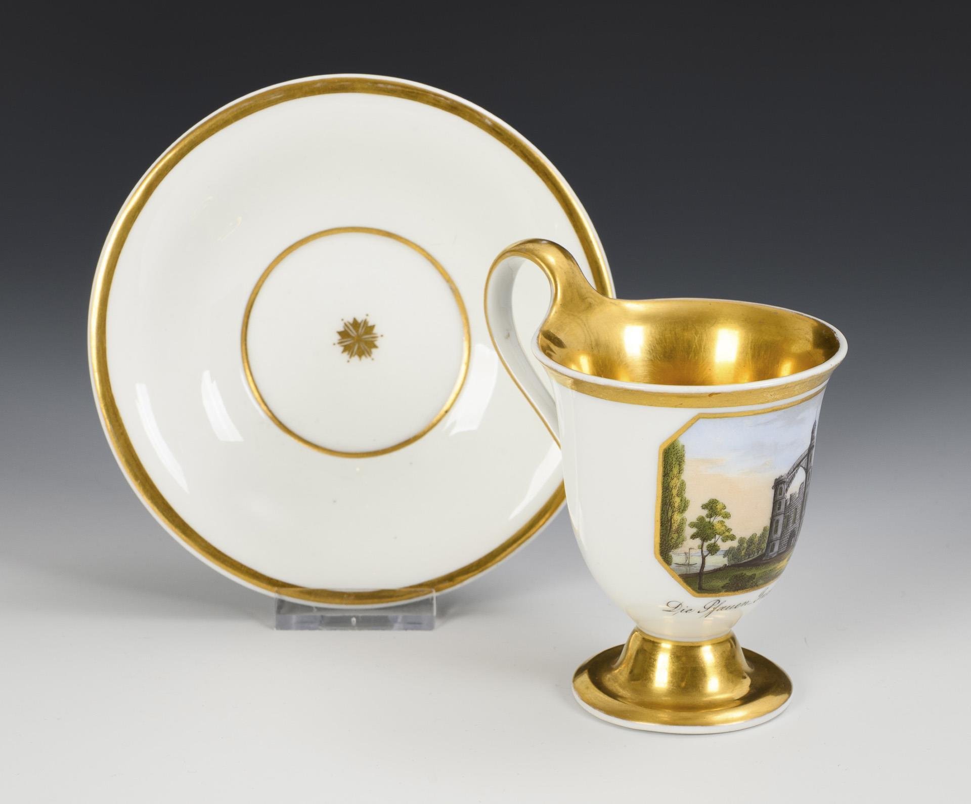 Polychrome Malerei (über Vordruck?), goldstaffiert. Tasse (H 10,5 cm), ergänzte Untertasse (Ø 13,5 cm).