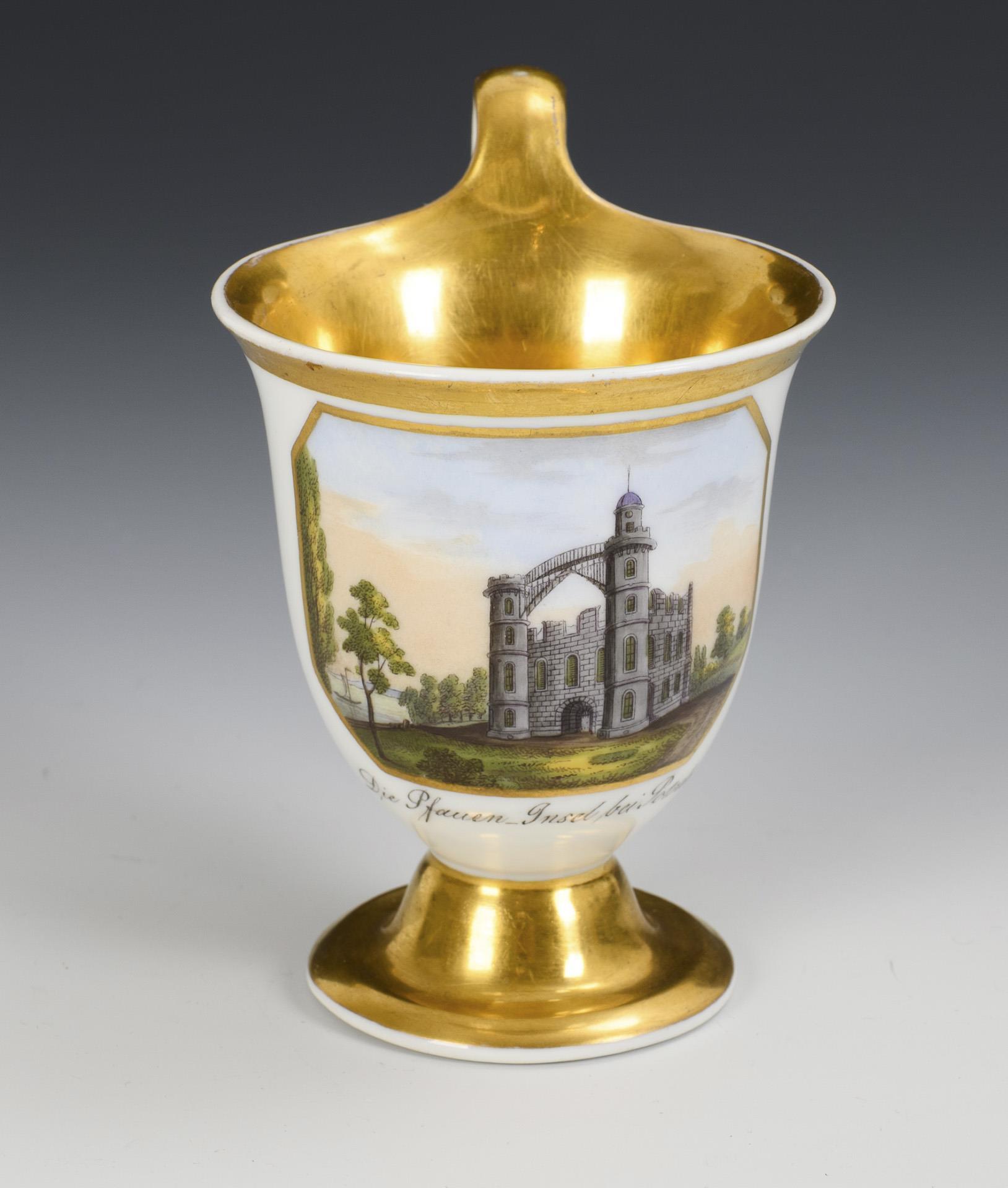 Gefußte Glockentasse mit Campanerhenkel. In einer goldgerahmten Rechteckkartusche die bezeichnete Darstellung der Pfaueninsel bei Potsdam, innen vergoldet.