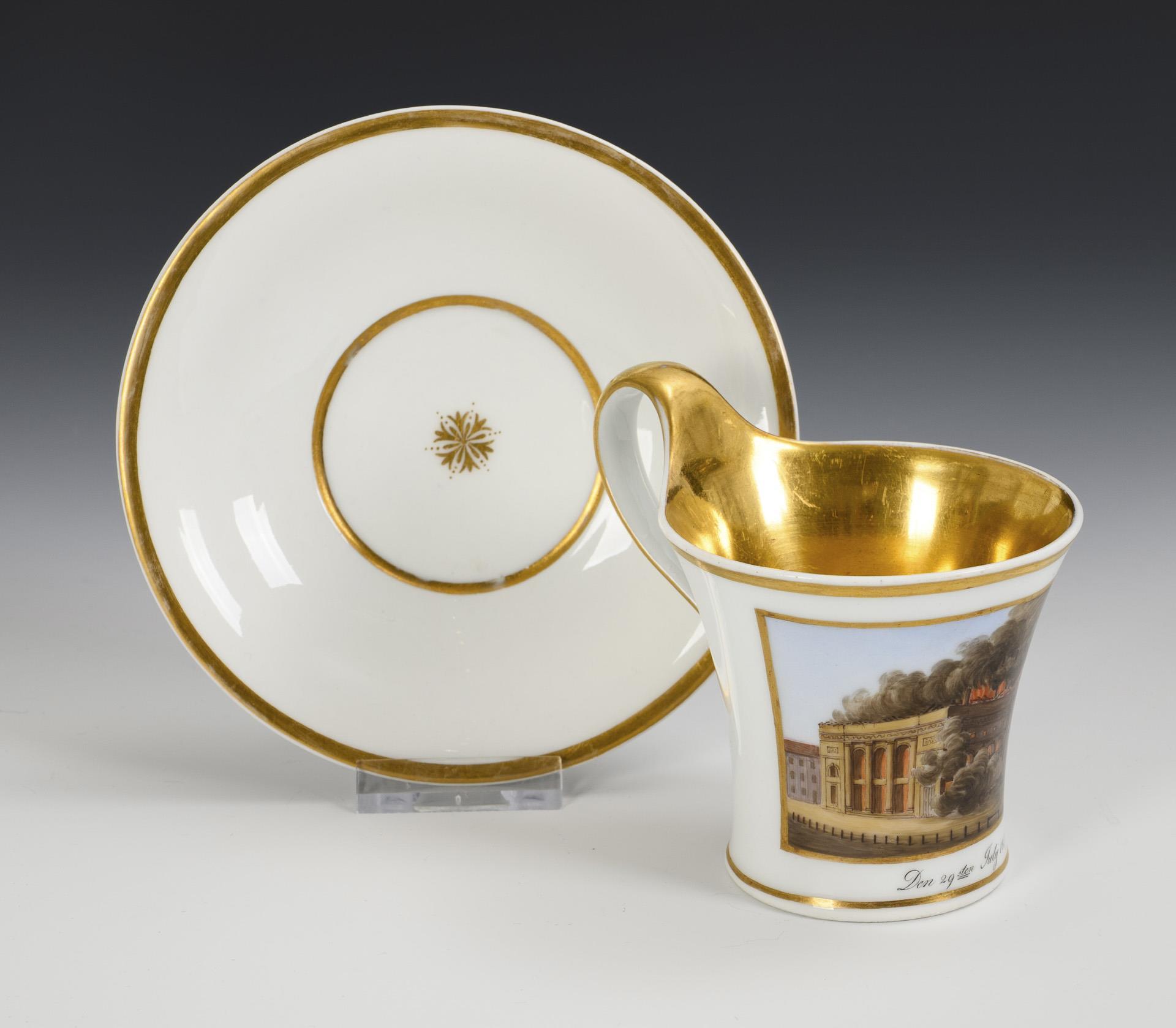 Erinnerungstasse an den Brand des Schauspielhauses in Berlin. KPM Berlin.