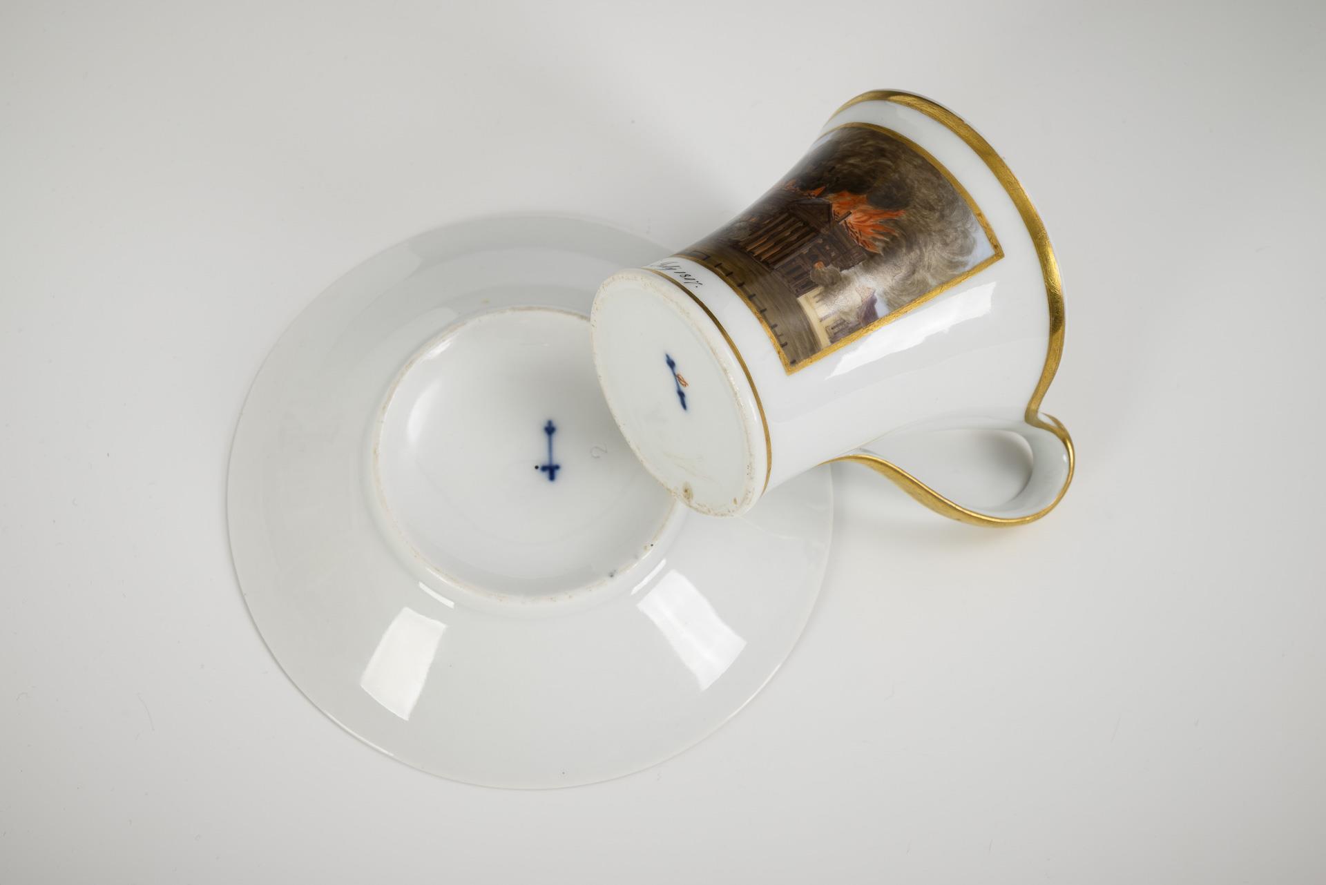 Polychrom bemalt, goldstaffiert. Tasse (H 9,5 cm), ergänzte Untertasse (Ø 13,5 cm).