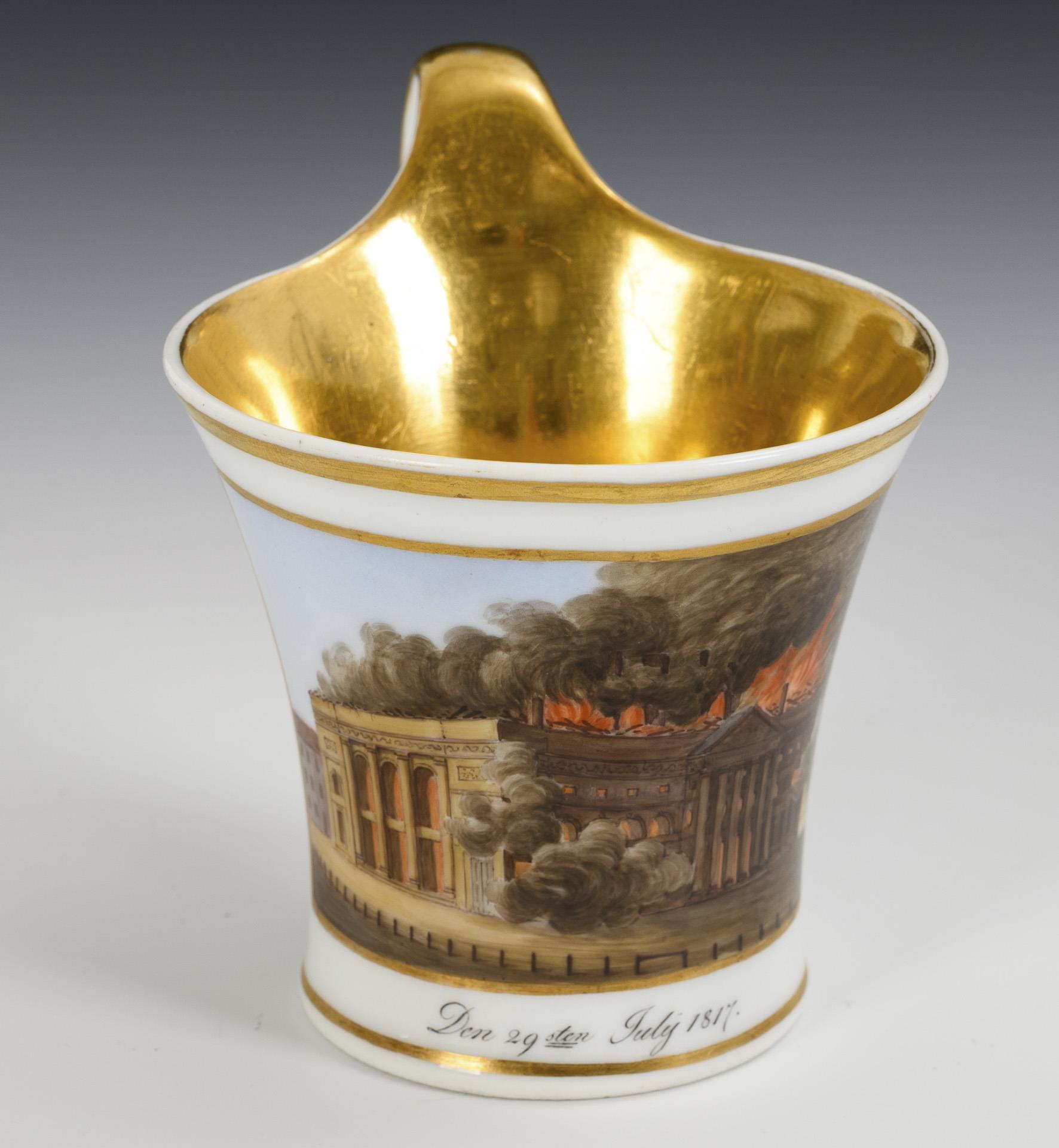 Modell "Konisch" mit Campanerhenkel. Schauseitig eine goldgerahmte Rechteckkartusche mit der datierten Darstellung des Schauspielhauses in Berlin, das am 29. Juli 1817 durch einen Brand zerstört wurde, innen vergoldet.