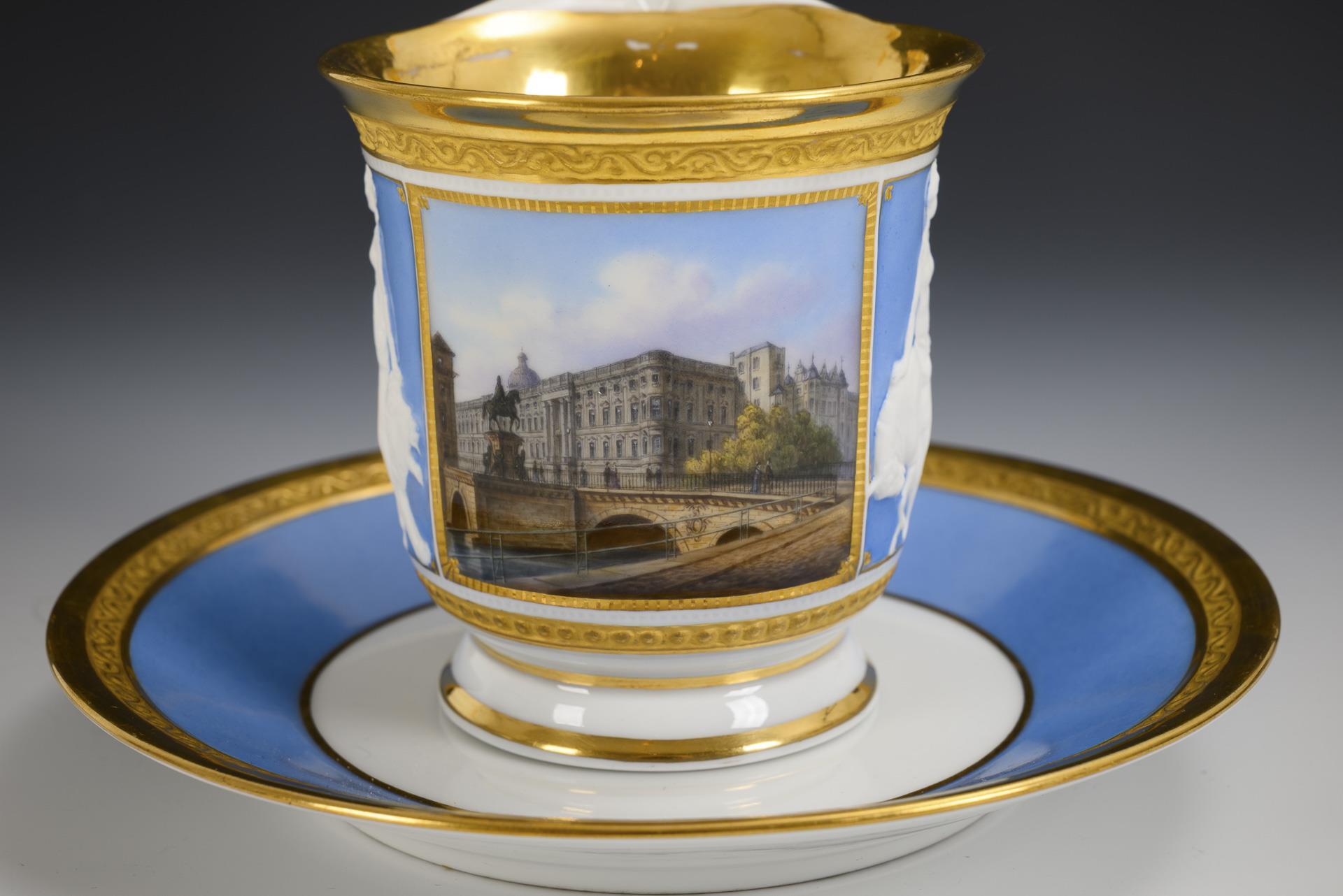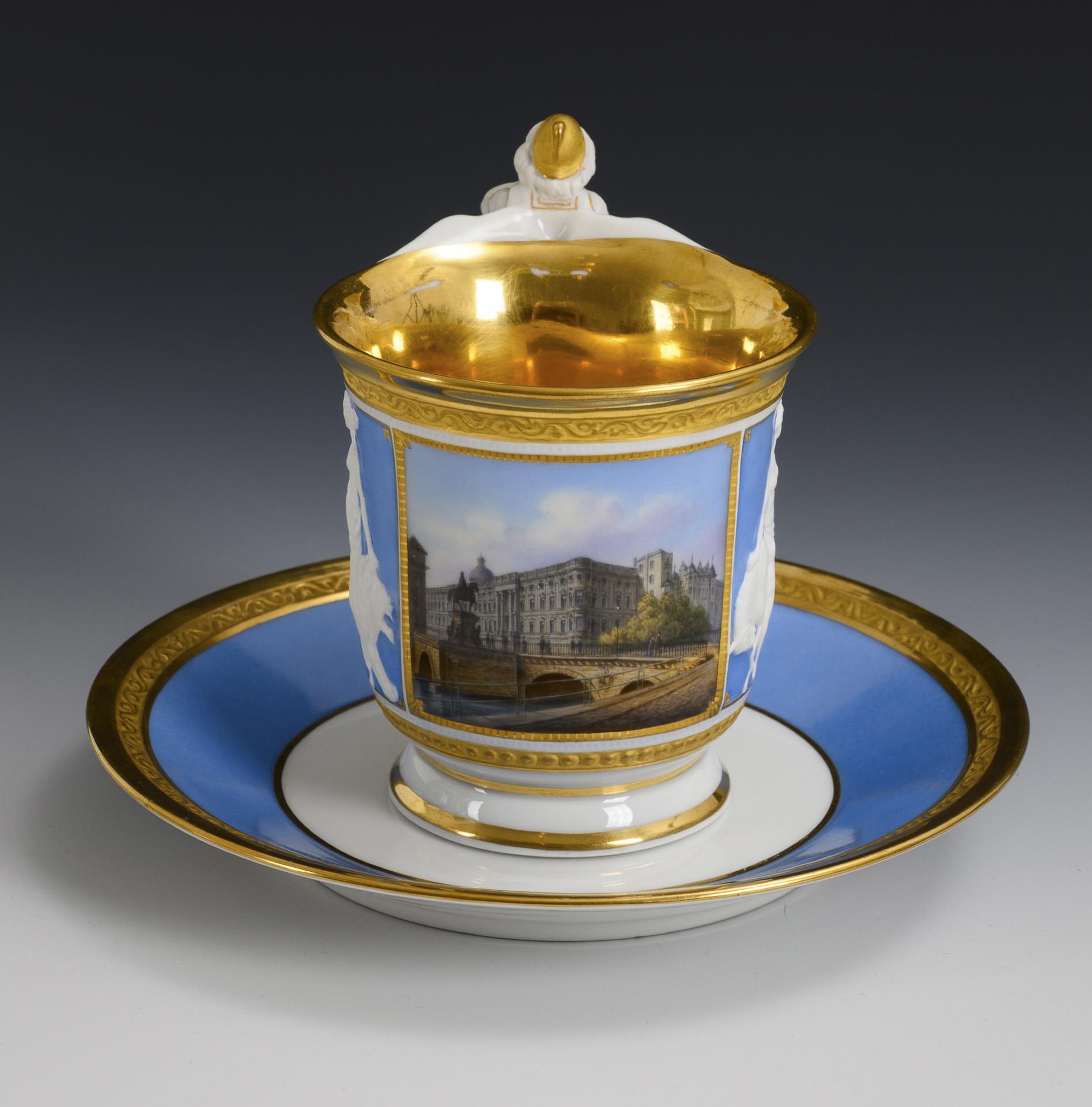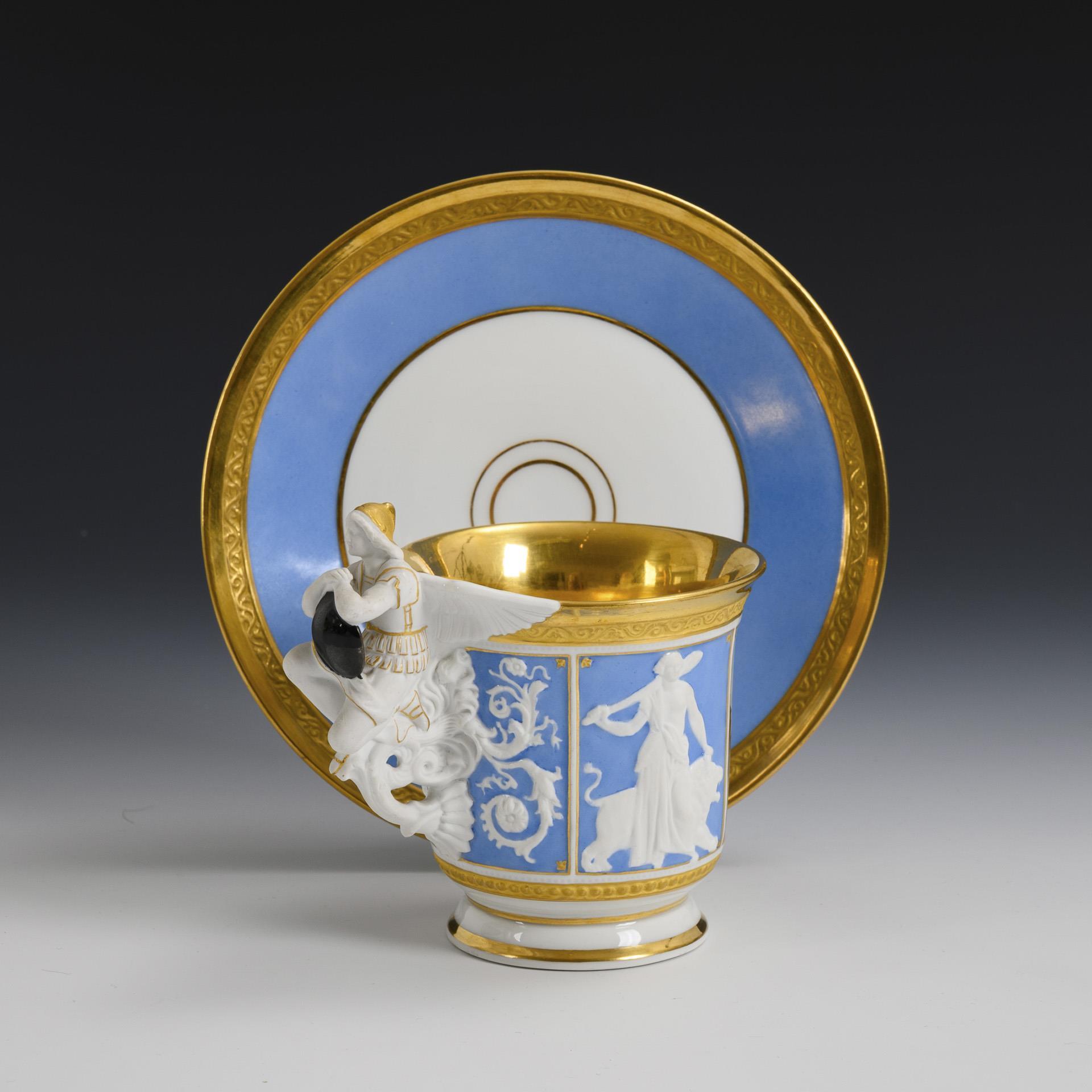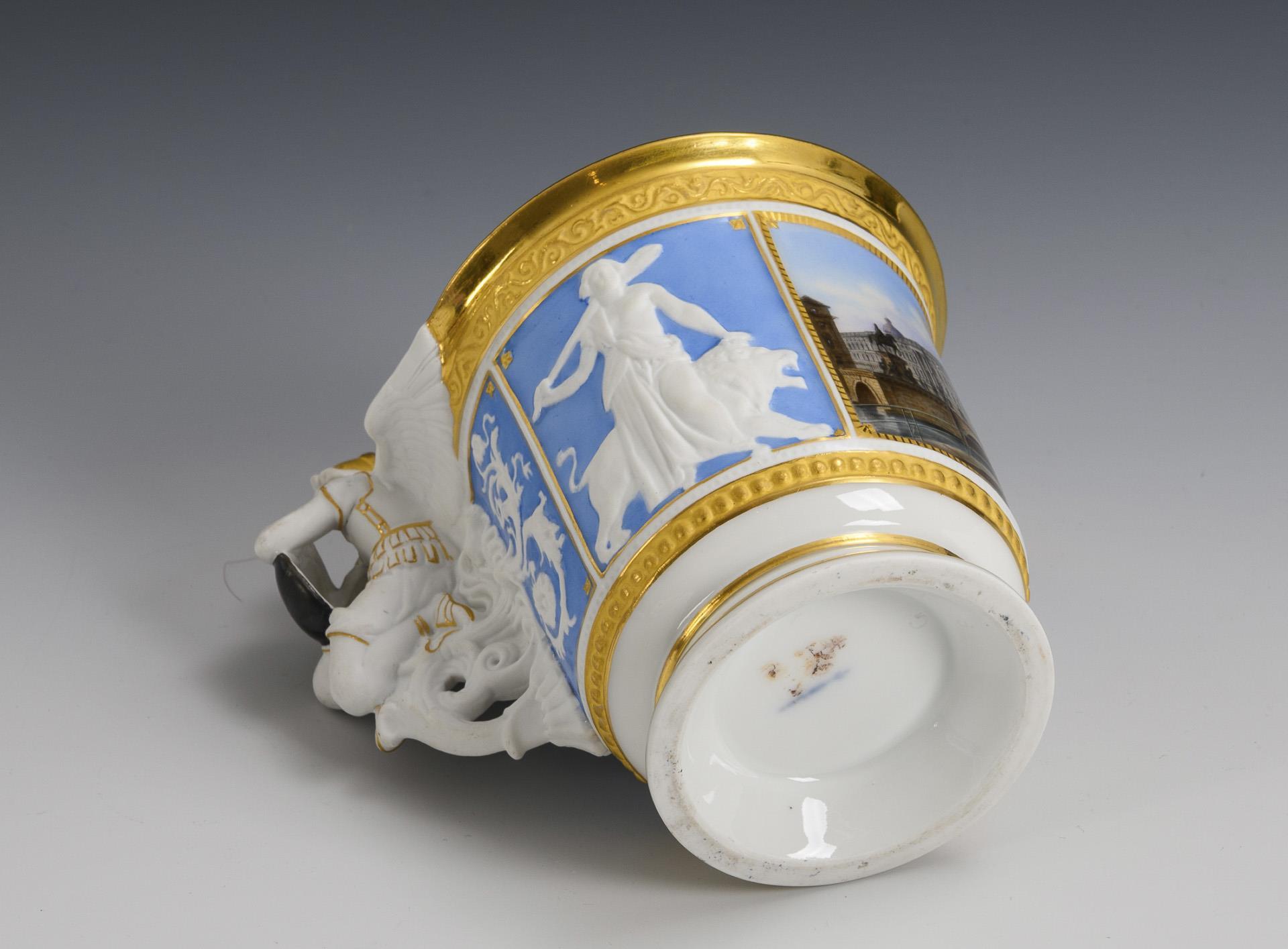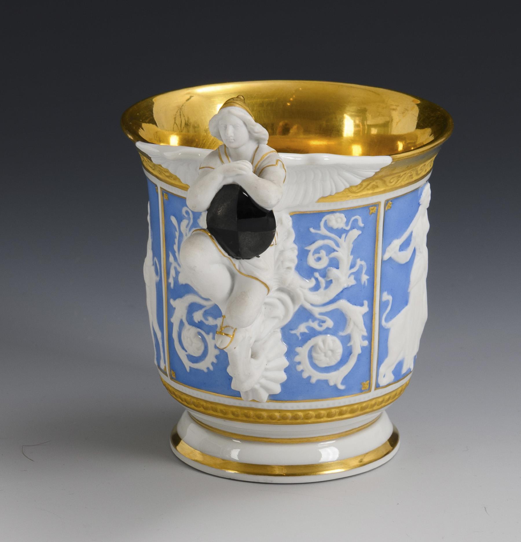 Gefußte Glockentasse mit kraterförmig ausschwingendem Mündungsrand, einem plastischen Biskuithenkel in Form einer geflügelten, auf Akanthusranken knienden Figur mit Panzer und Schild sowie zu beiden Seiten des Henkels das Biskuitrelief von Herkules mit Keule und Löwe bzw. Europa mit dem Stier. Schauseitig eine Rechteckkartusche mit der Ansicht des Königlichen Schlosses (Stadtschloss) in Berlin, verso hellblauer Fond. Minimaler Goldabrieb.