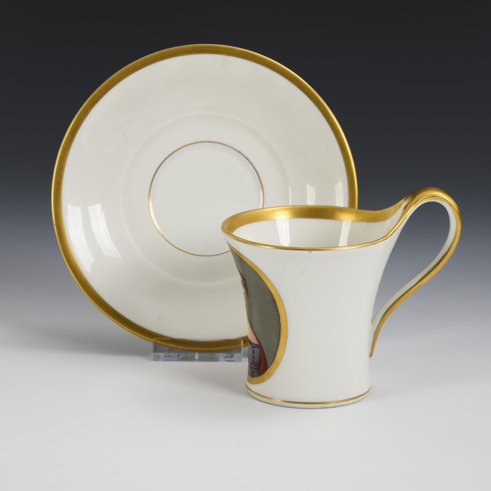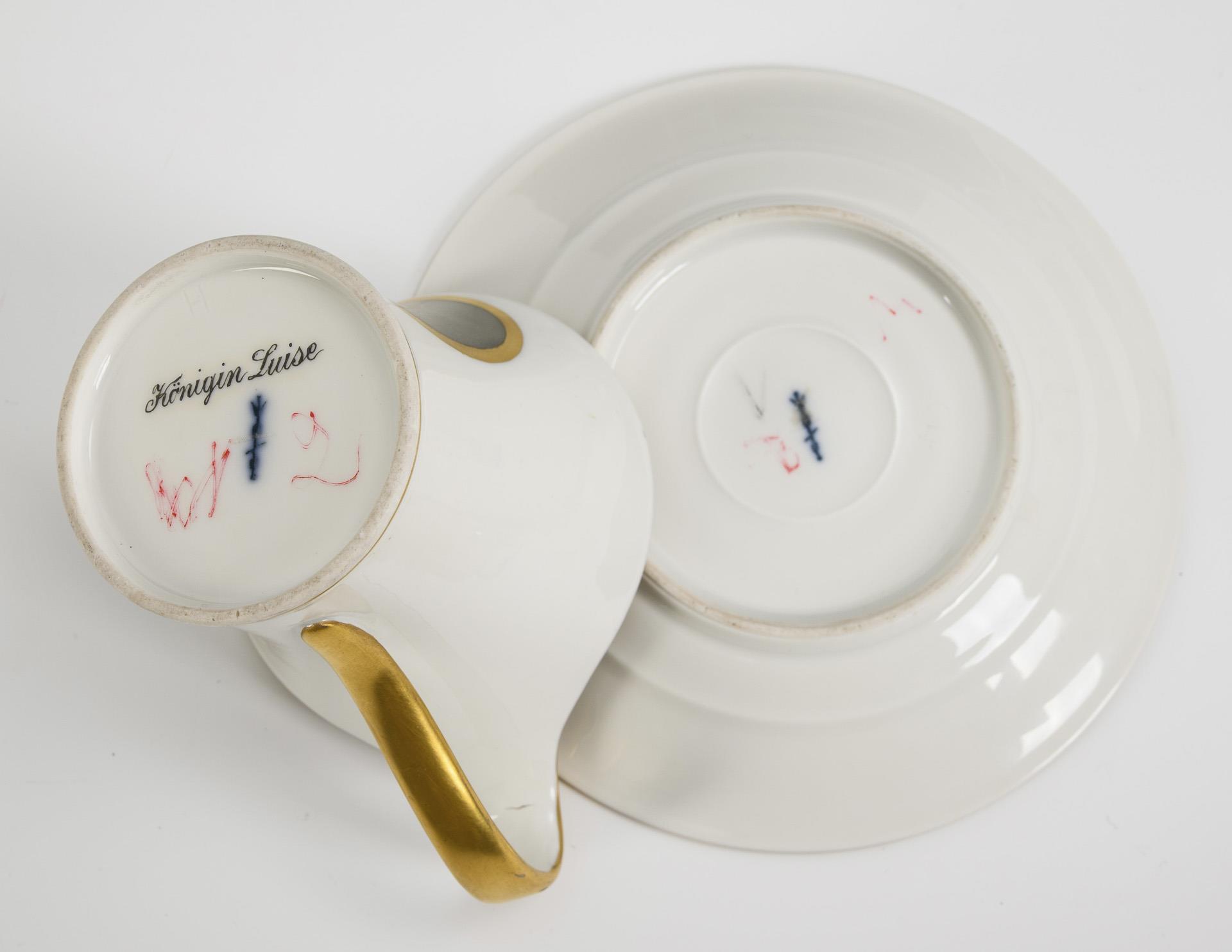 Polychrom bemalt, goldstaffiert. Tasse (H 9 cm), originale Untertasse (Ø 14 cm).