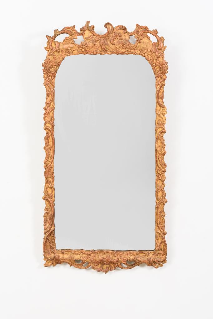 Zierlicher Spiegel mit üppigem Rokoko-Rocaillenrahmen. Spiegelglas ergänzt, Stuck teils gebrochen, Vergoldung berieben.