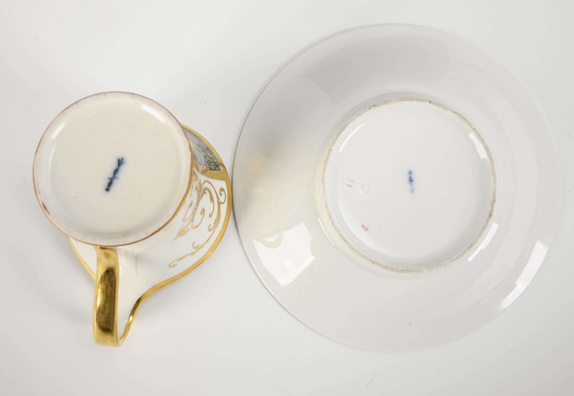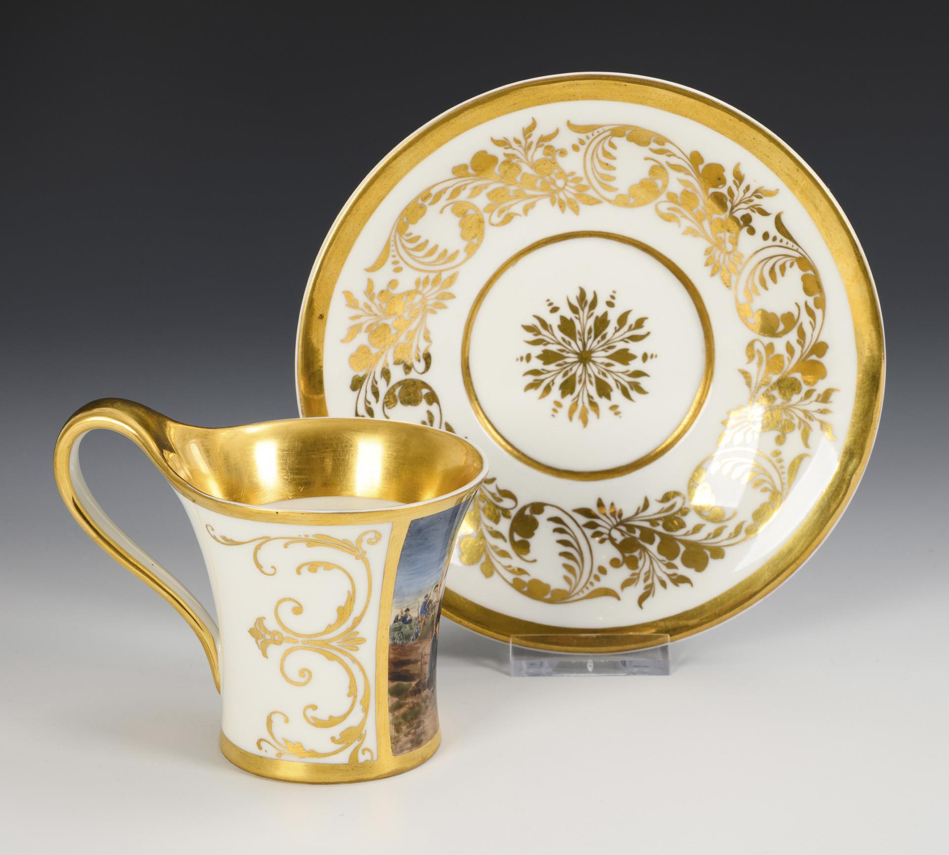 Polychrom bemalt, goldstaffiert. Tasse (H 9 cm), ergänzte Untertasse (Ø 15 cm).