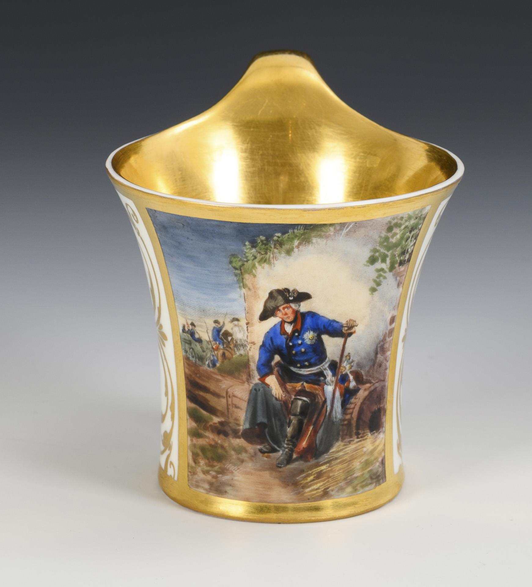 Modell "Konisch" mit Campanerhenkel. Schauseitig eine goldgerahmte Rechteckkartusche mit der Darstellung des vor einer Mauer sitzenden Preußenkönigs Friedrich II. .