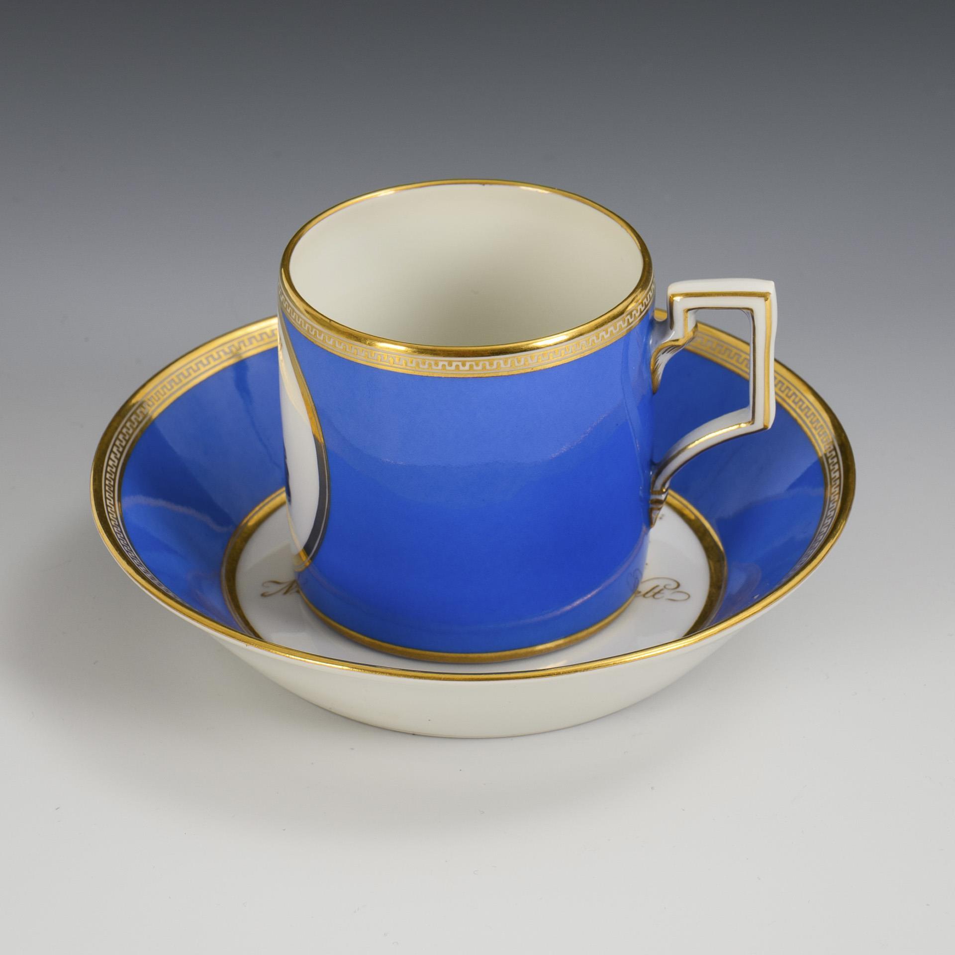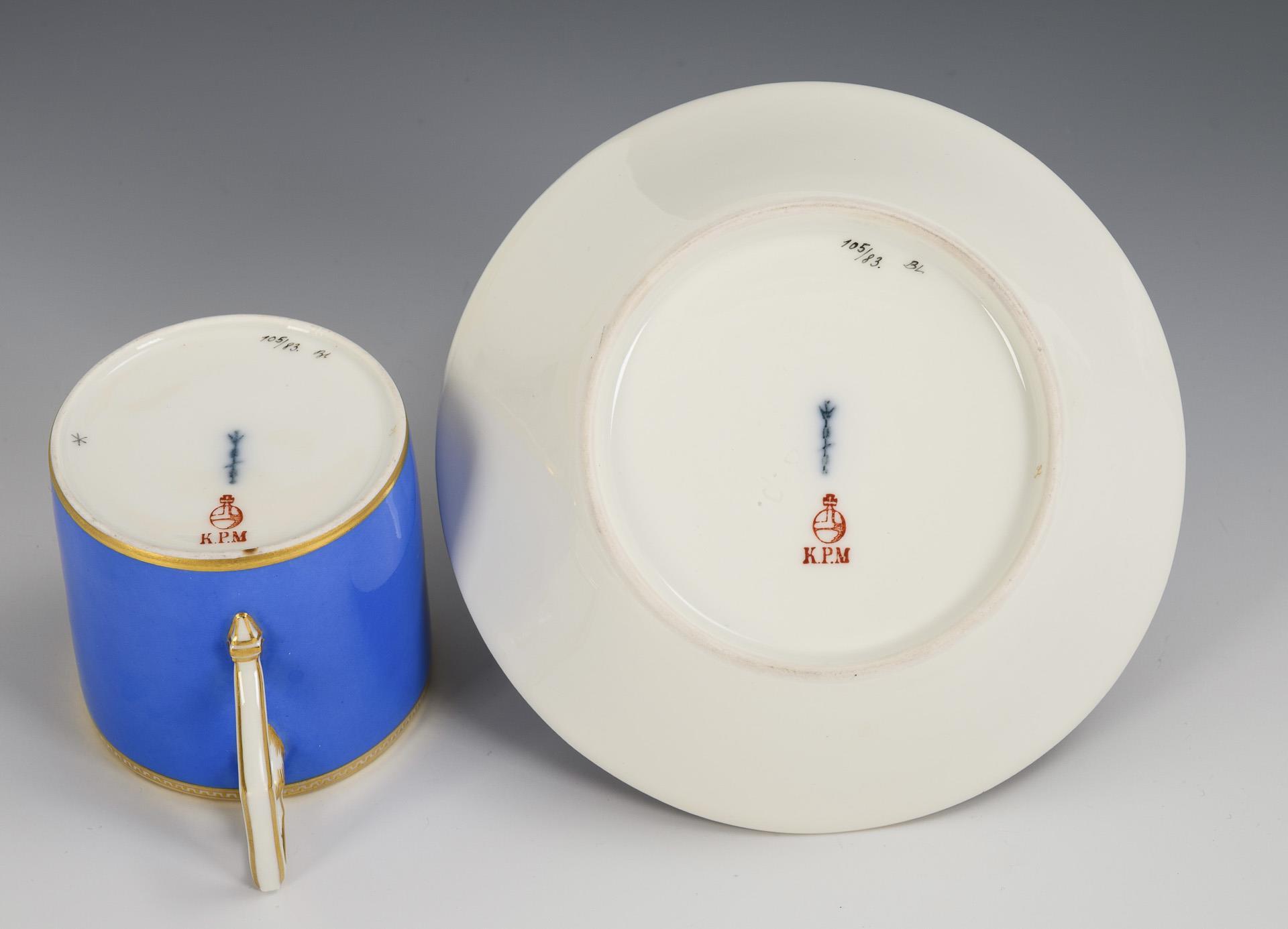 Zylindertasse mit gewinkeltem Henkel. Blauer Fond, schauseitig ein Medaillon mit der bezeichneten Silhouette des Preußenkönigs Friedrich II.. Im Spiegel der Untertasse die Aufschrift "Arbeitsvoll war sein Leben; kein Tag ohne Thaten, kein Jahr ohne Lorber: Nie sah vor Ihm die Welt Seines Gleichen.".