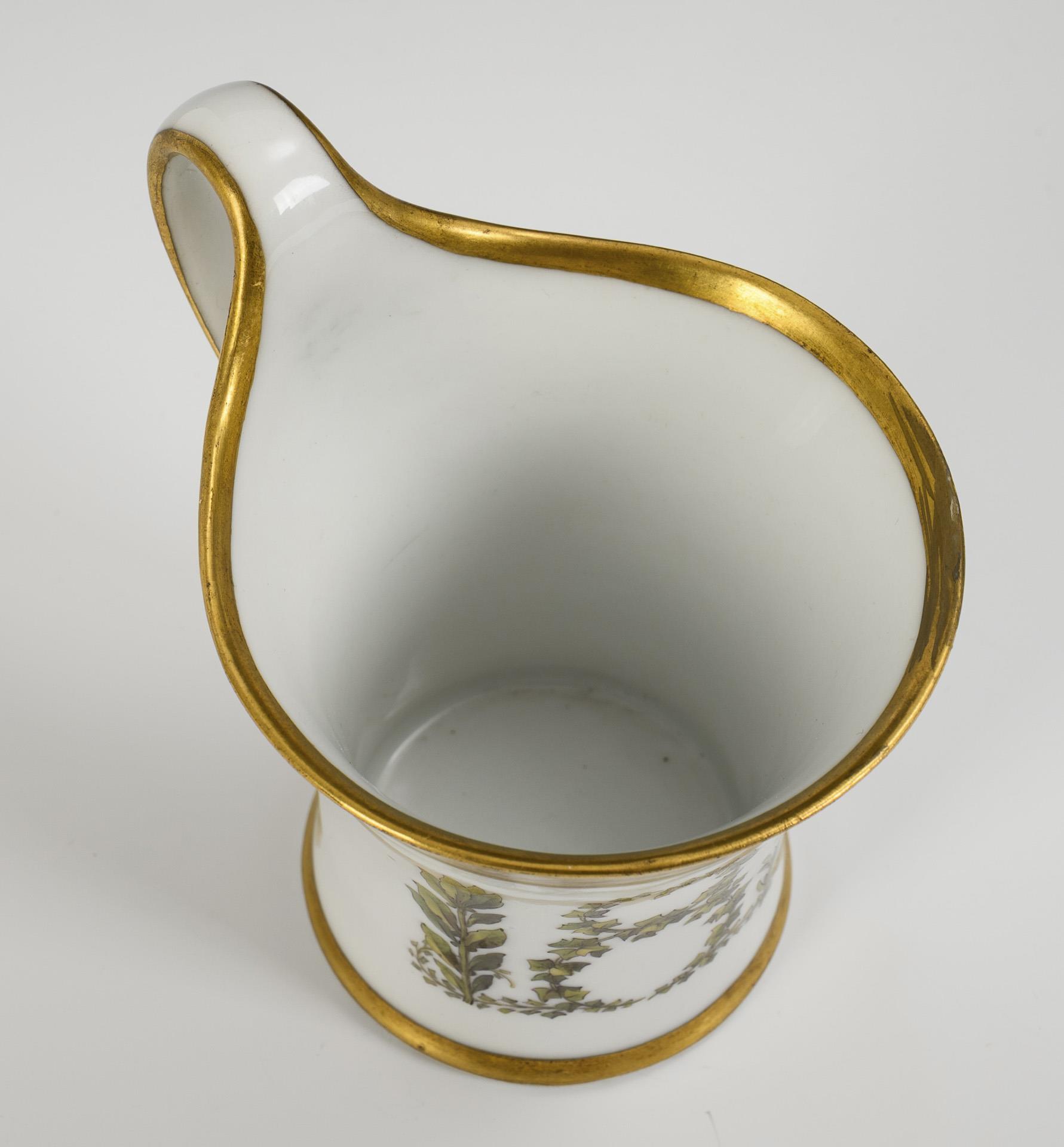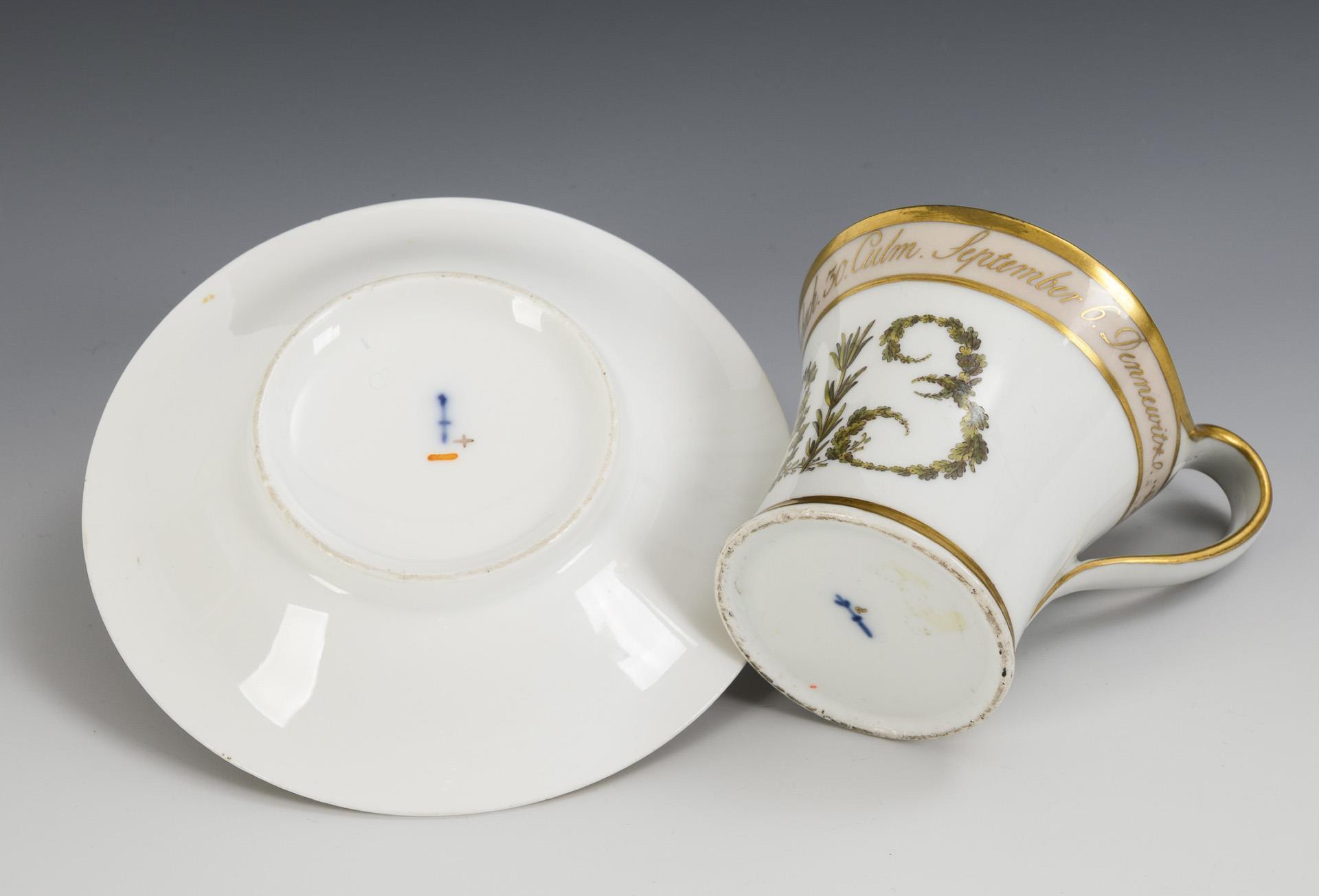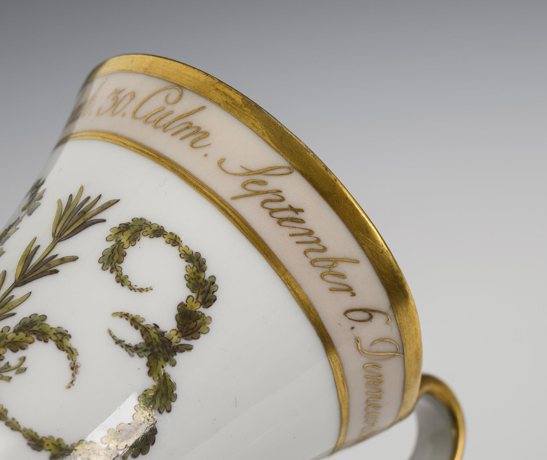 Modell "Konisch" mit Campanerhenkel. Zur Schauseitig die aus Lorbeer-, Efeu, -Ölbaum- und Eichenblättern gemalte Jahreszahl "1813", darüber ein rosa Fondband mit der Aufzählung von Schlachten "August 22. Gr. Beeren. 26. Katzbach. 30. Culm. September 6. Dennewitz". Im Spiegel der Untertasse die Bezeichnung "Berlin 1821".