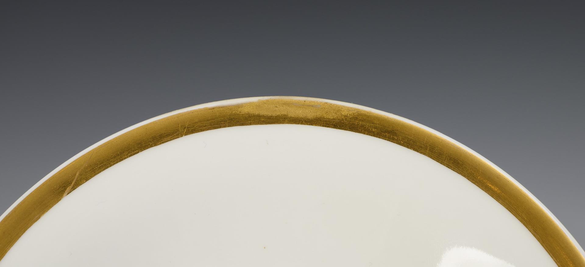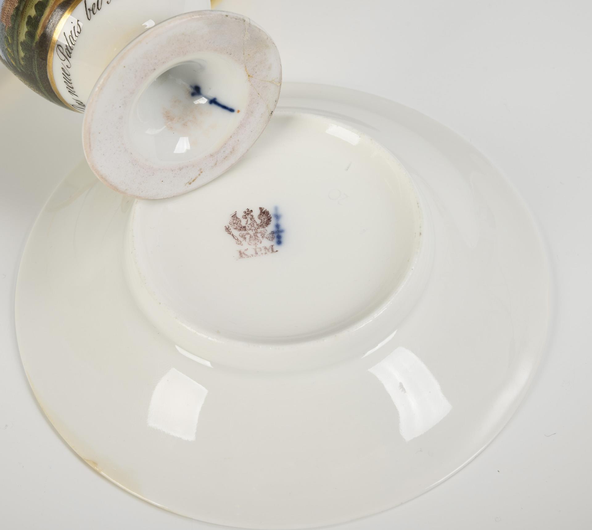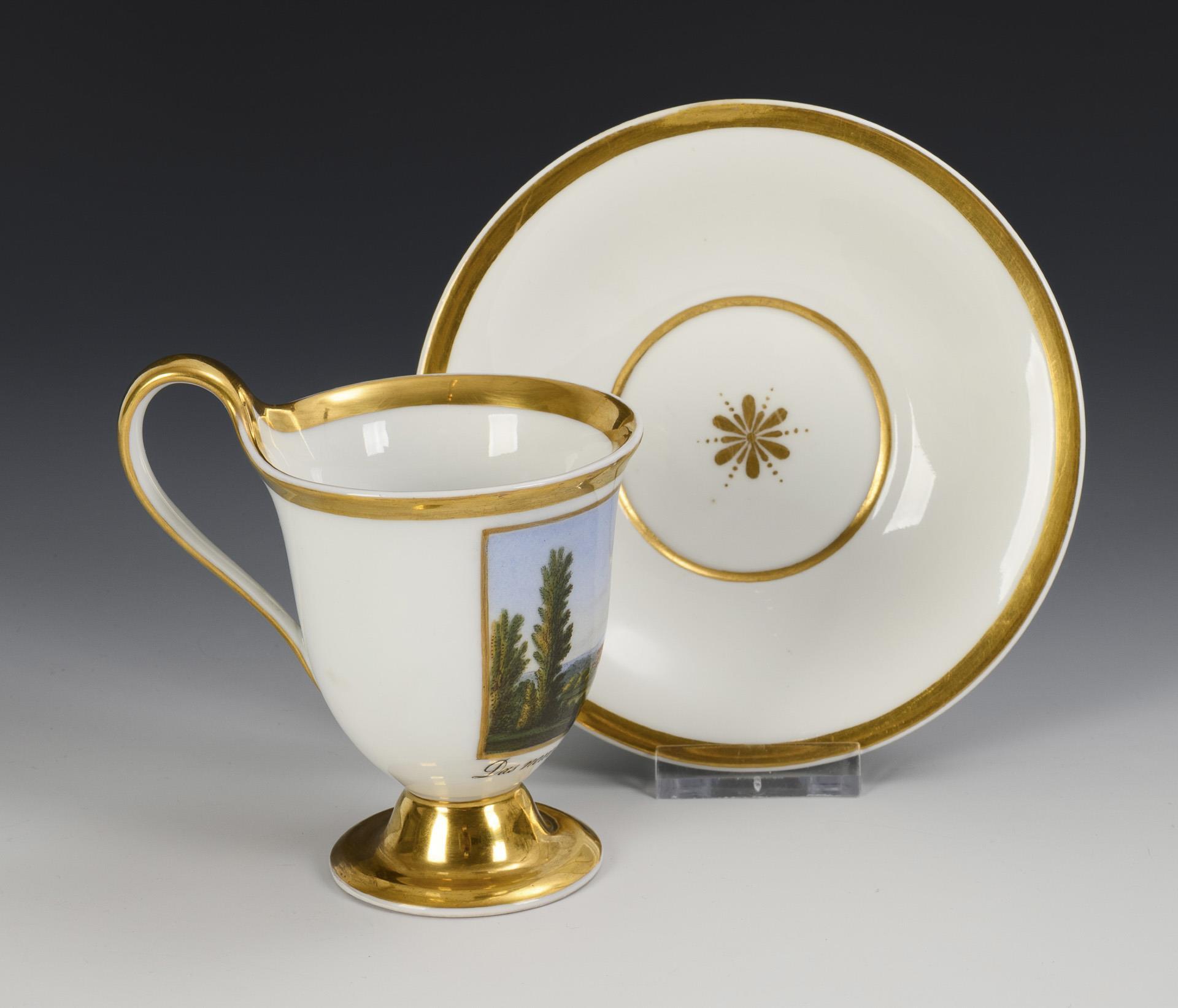 Polychrome Malerei über Vordruck, Goldstaffage. Tasse (H 11,5 cm), originale Untertasse (Ø 13,5 cm).
