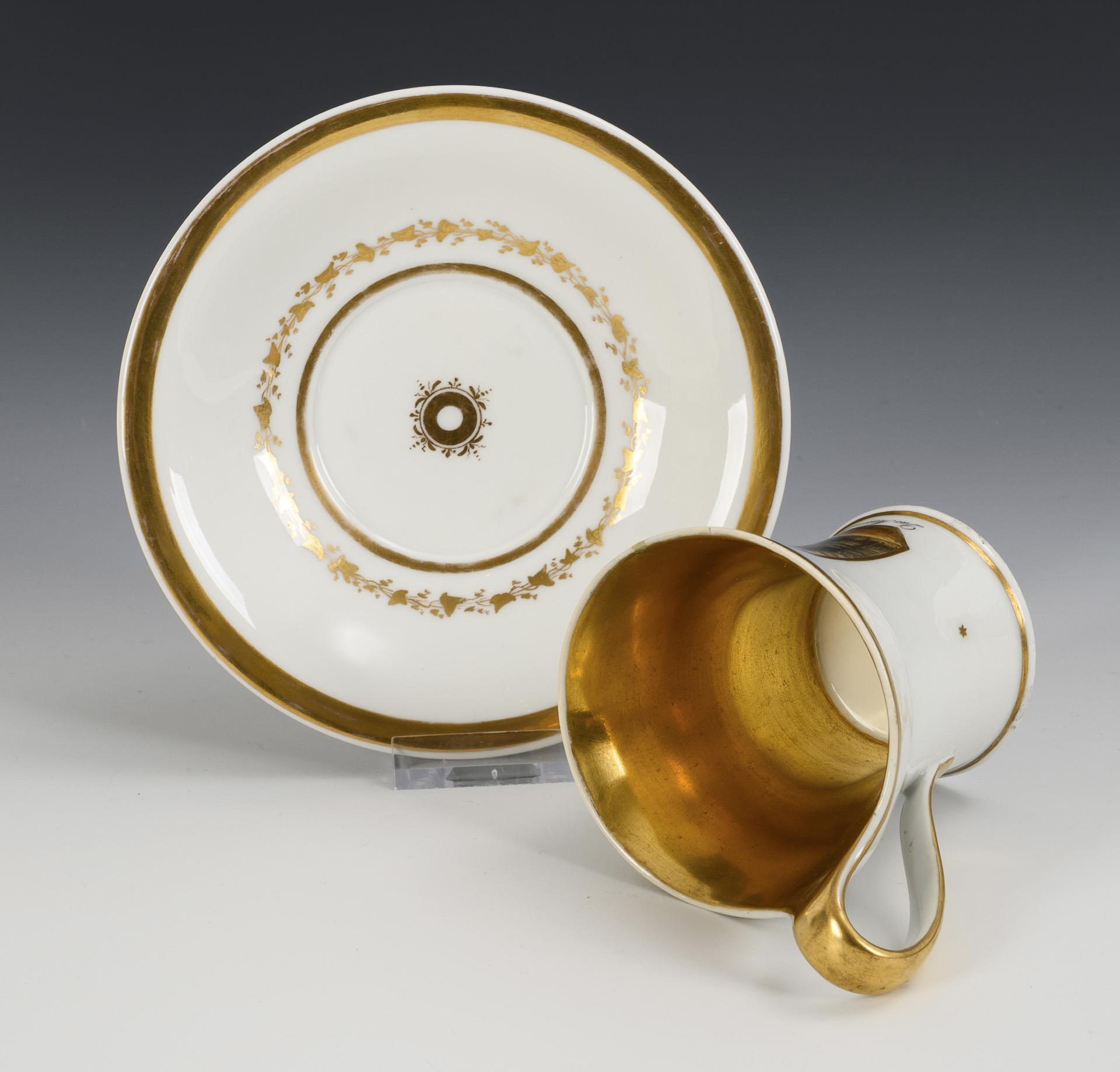 Polychrom bemalt, goldstaffiert. Tasse (H 9,5 cm), ergänzte Untertasse (Ø 13,5 cm).