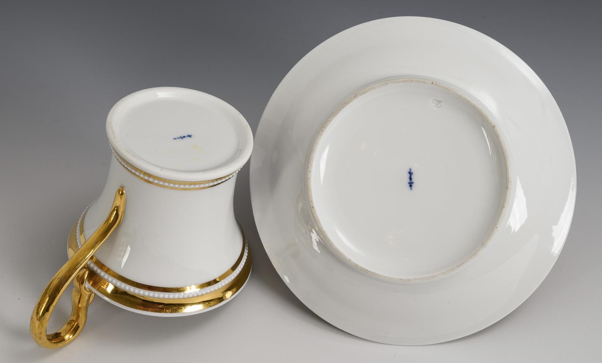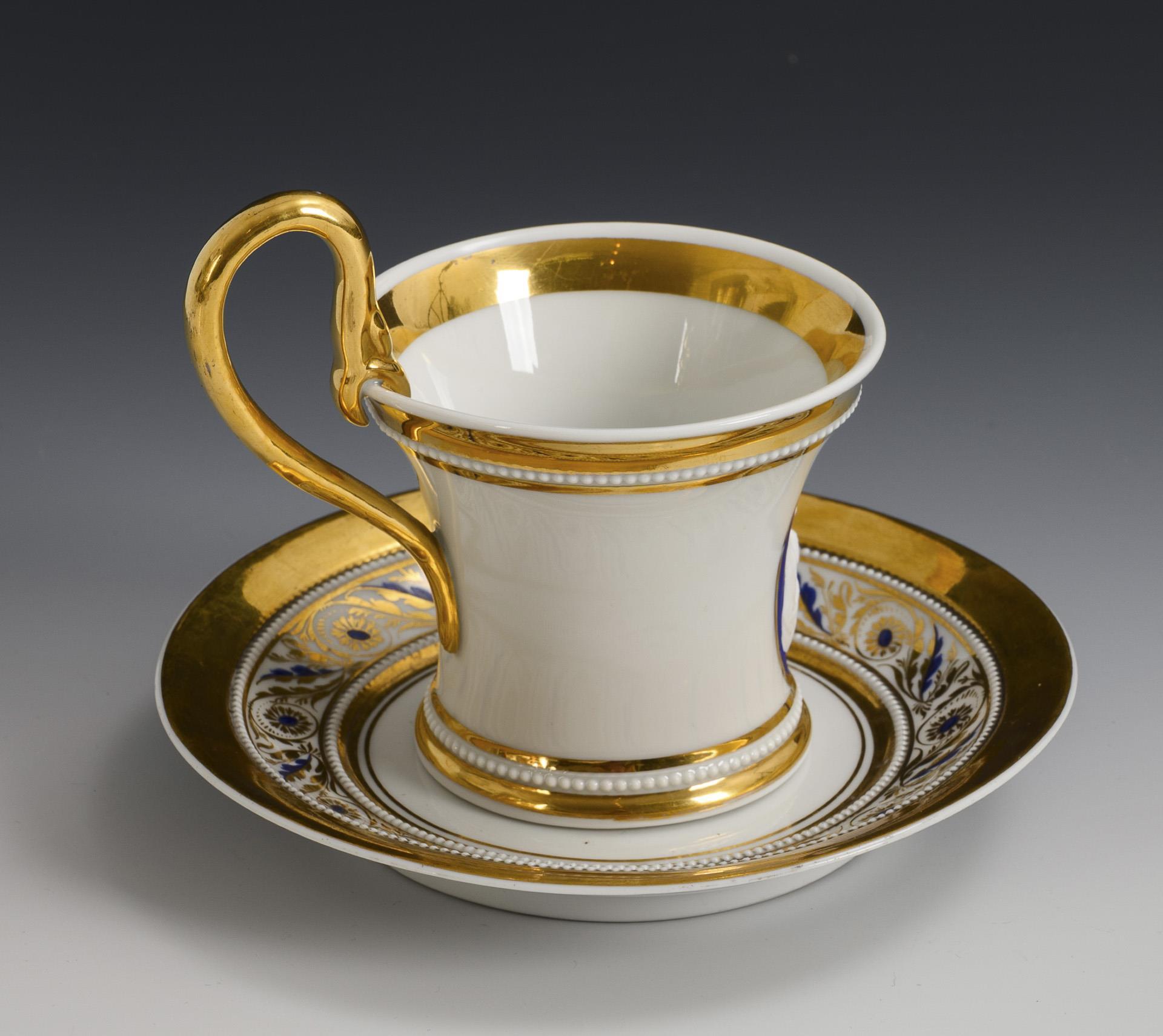Polychrom bemalt, goldstaffiert. Tasse (H 11,5 cm), originale Untertasse (Durchm. 15,5 cm).