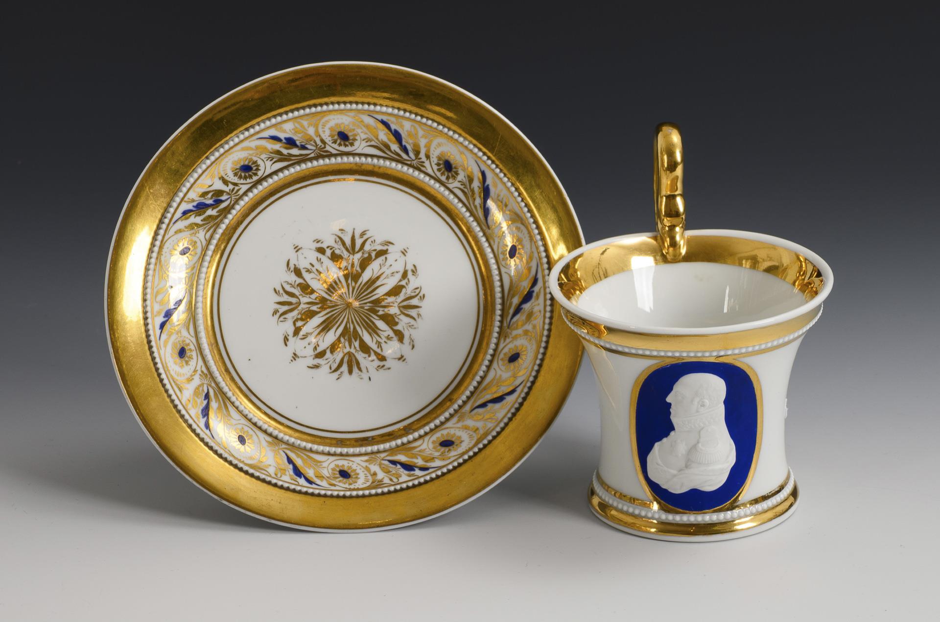 Kratertasse mit Perlbändern und Schwanenhenkel. Schauseitig ein goldgerahmtes Medaillon mit mattblauem Fond und Biskuitporträt eines Mannes.