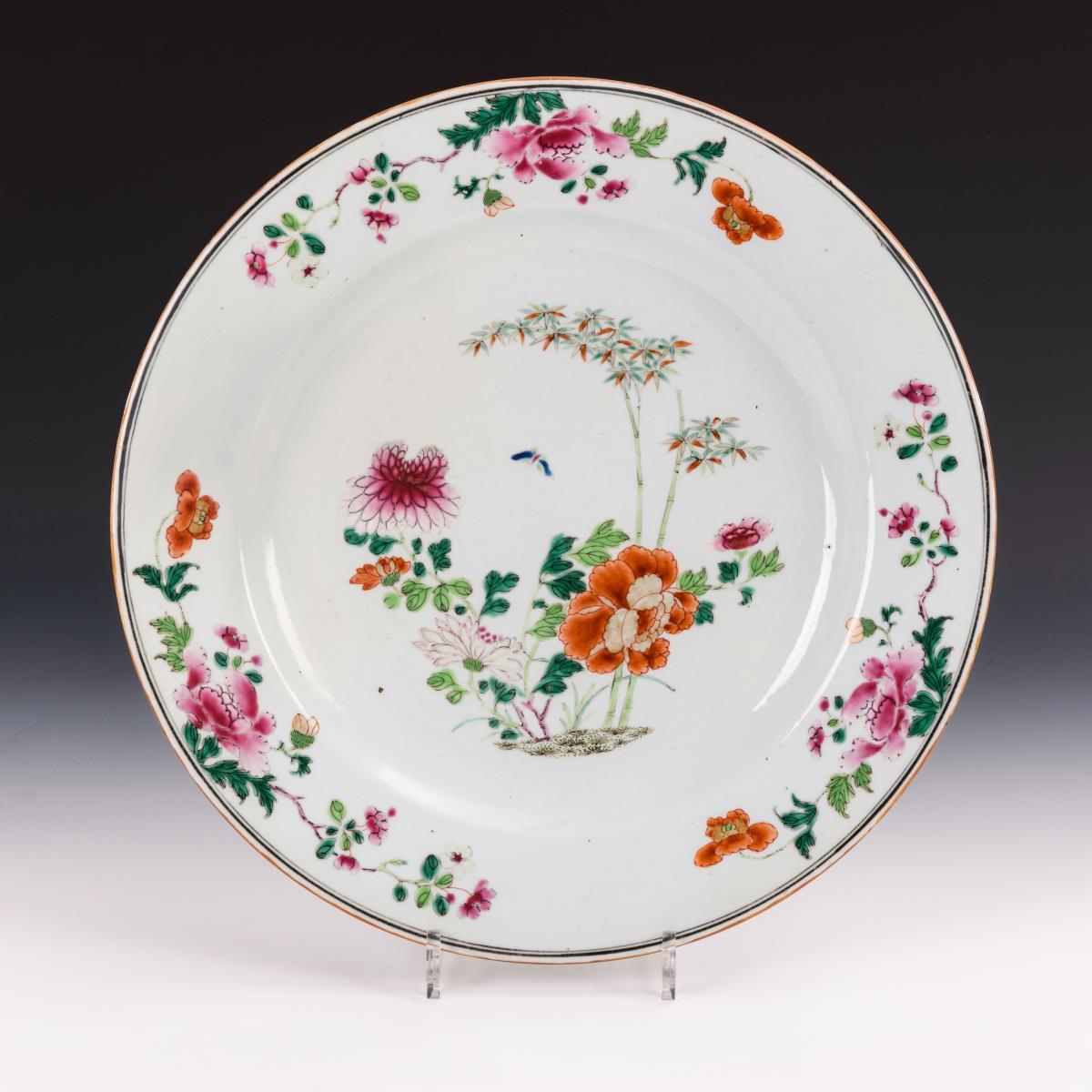 Päoniendekor in unterschiedlichen Rottönen und Bambusstengel. Wenige Aschepunkte auf Glasur, Rand restauriert.