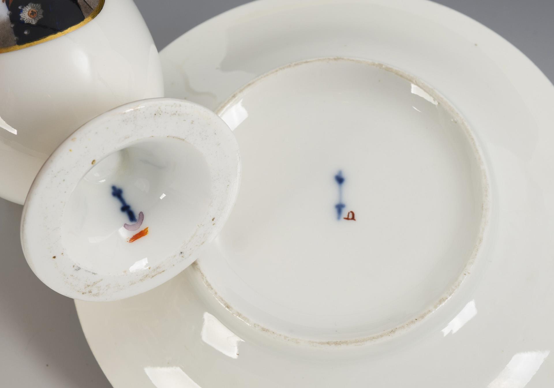 Polychrom bemalt, goldstaffiert. Tasse (H 11 cm), originale Untertasse (Ø 13,5 cm).