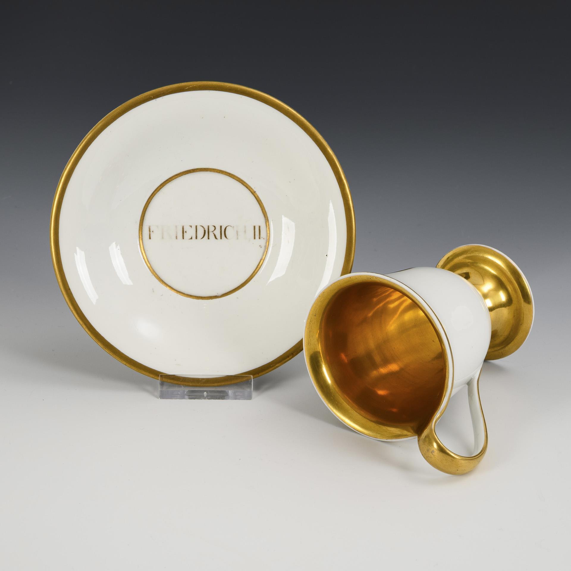 Gefußte Glockentasse mit Ohrenhenkel. Schauseitig ein Medaillon mit dem Bildnis des preußischen Königs Friedrich der Große, innen vergoldet. Im Spiegel der Untertasse bezeichnet "Friedrich II.". Gold im Spiegel der Untertasse berieben.