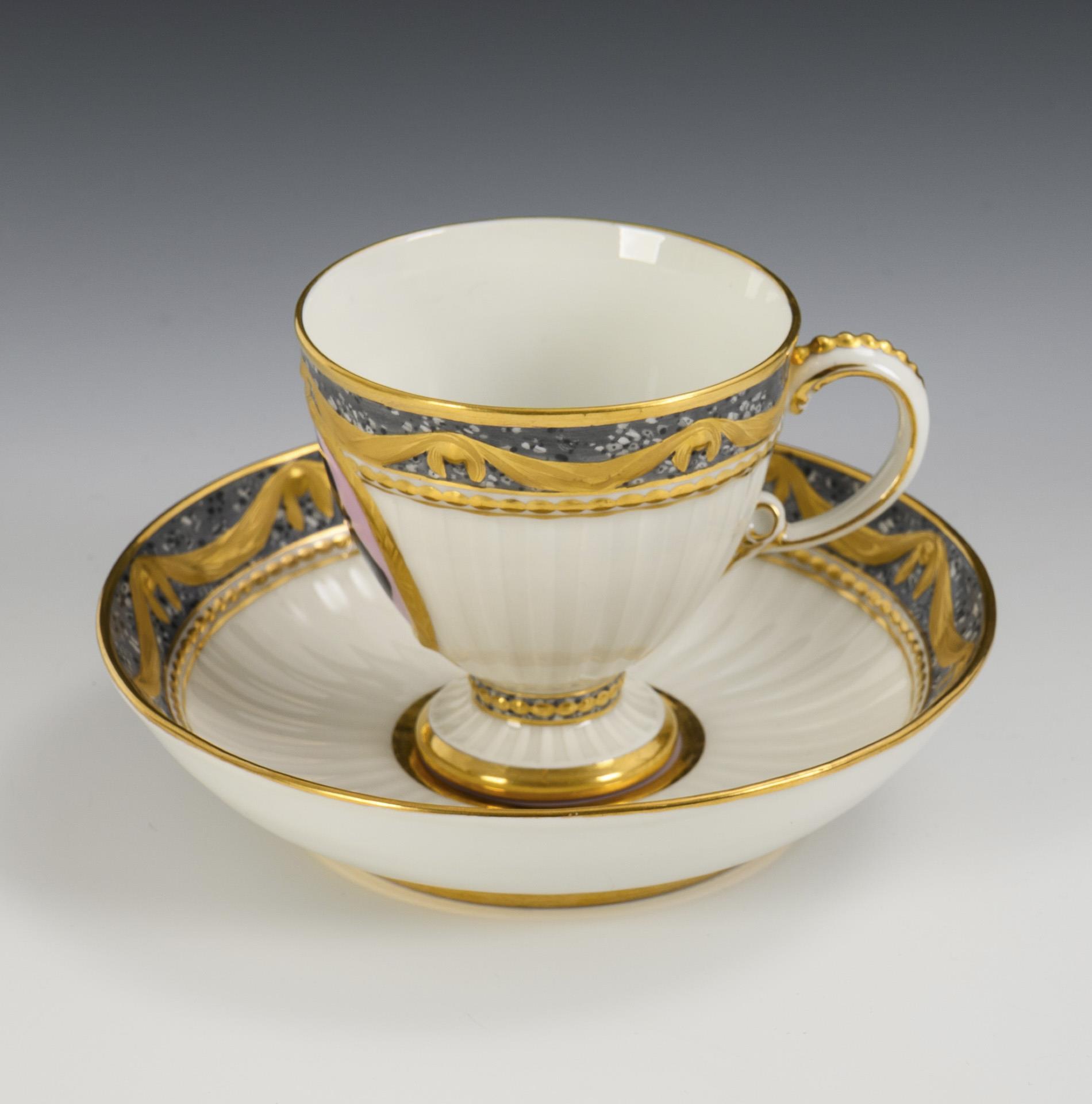 Polychrom bemalt, goldstaffiert. Tasse (H 7,5 cm), originale Untertasse (Ø 14 cm).